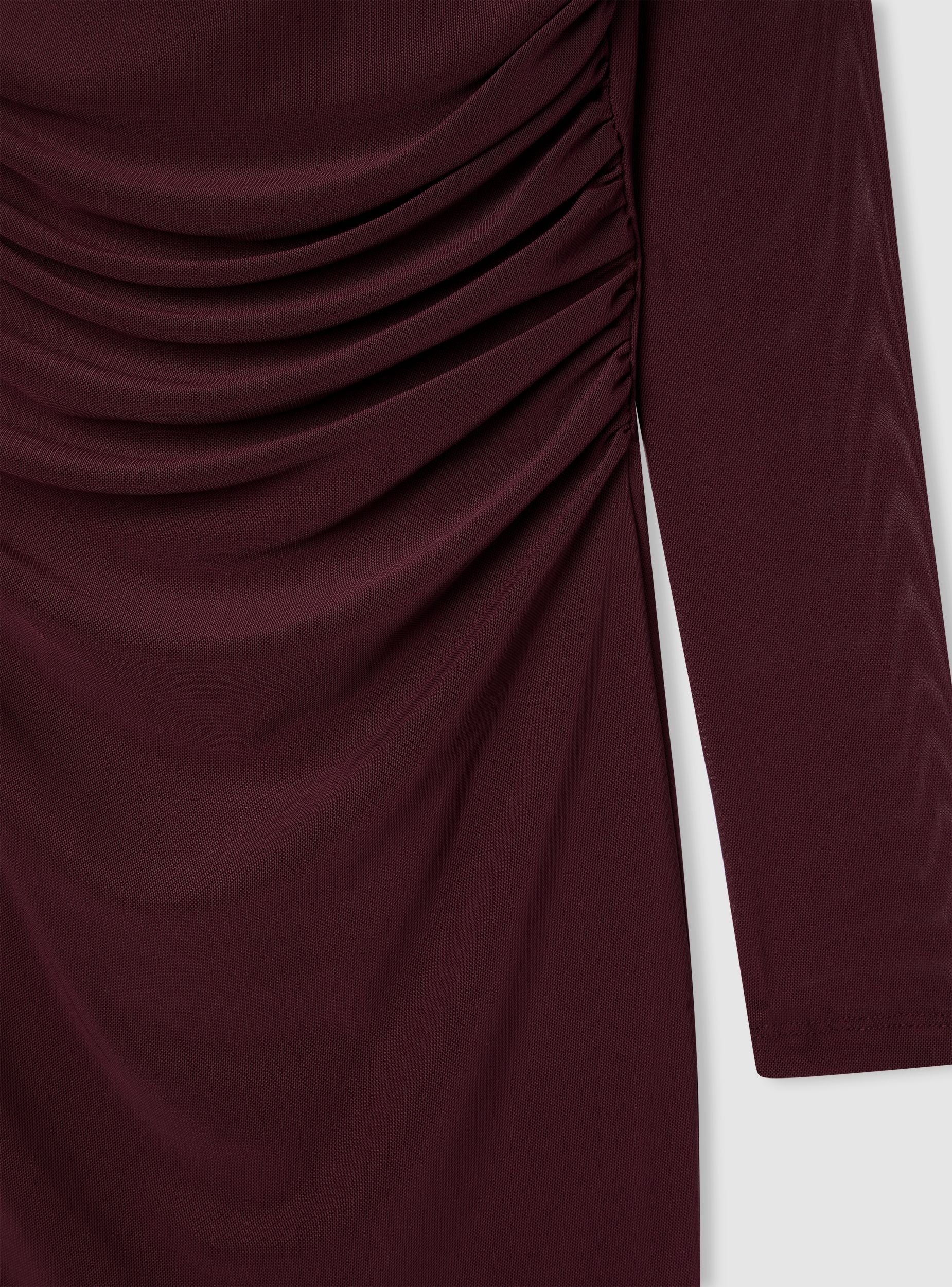 Sukienka damska z marszczonym tiulem. Ten bodydress jest idealny na specjalne okazje. Posiada dopasowany krój podkreślający sylwetkę. Półprzezroczyste długie rękawy i wysoki kołnierz dodają elegancji, a tiul nadaje wyrafinowany wygląd. Idealna do zestawienia z wysokimi obcasami i minimalistycznymi dodatkami, tworząc stylowy look.