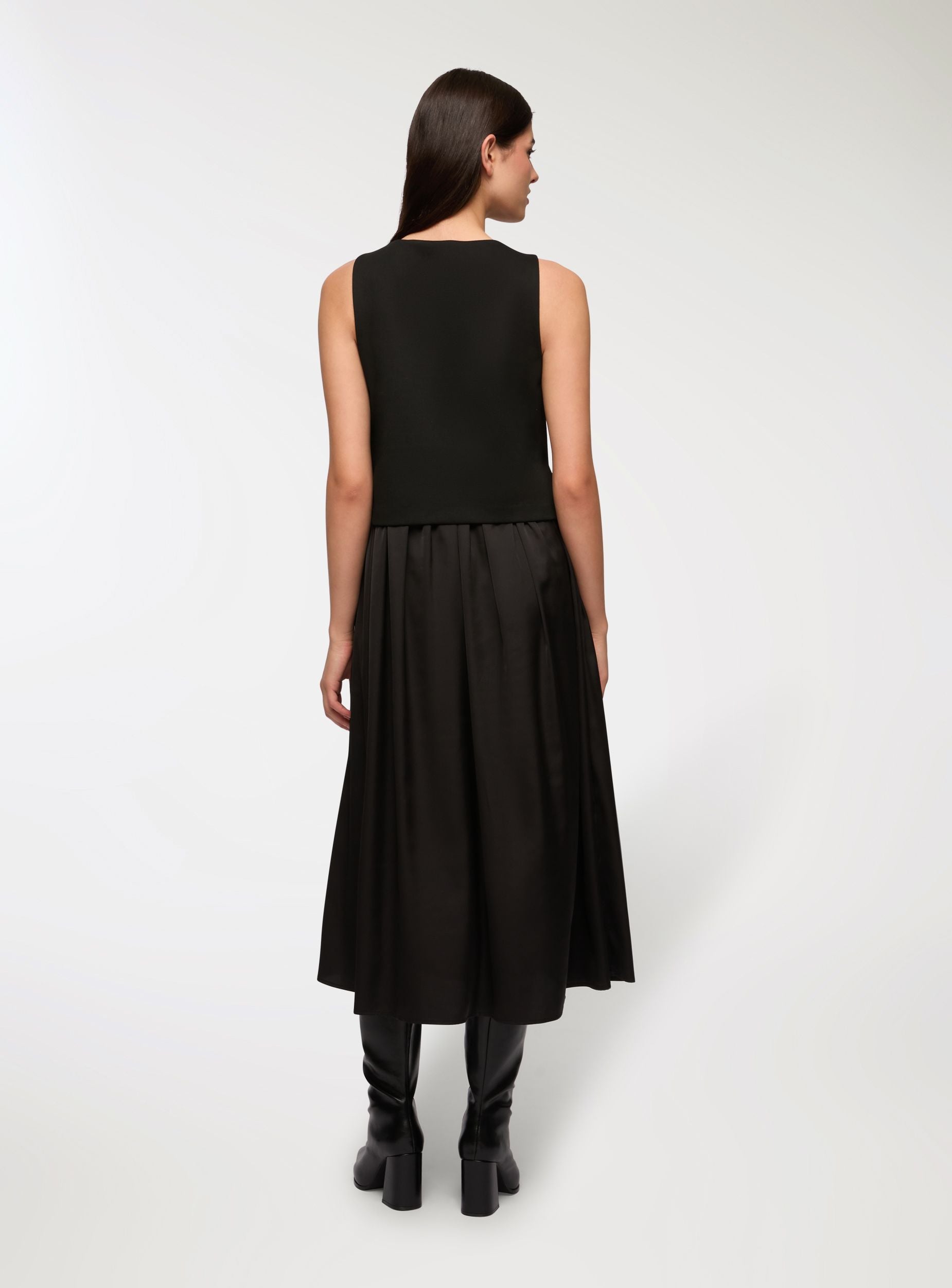 Sukienka midi damska z plisowanym wzorem. Idealna na eleganckie okazje, ta sukienka bez rękawów ma regularny krój i wyrafinowany fason. Dopasowana góra harmonijnie łączy się z plisowaną spódnicą, tworząc płynny i elegancki efekt. Doskonała do zestawienia z sandałami lub szpilkami na wieczorne wyjście.Szczegóły