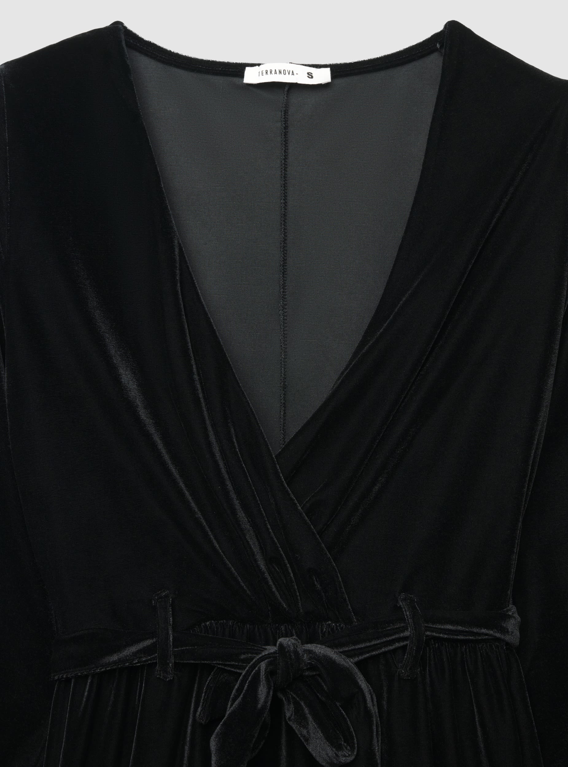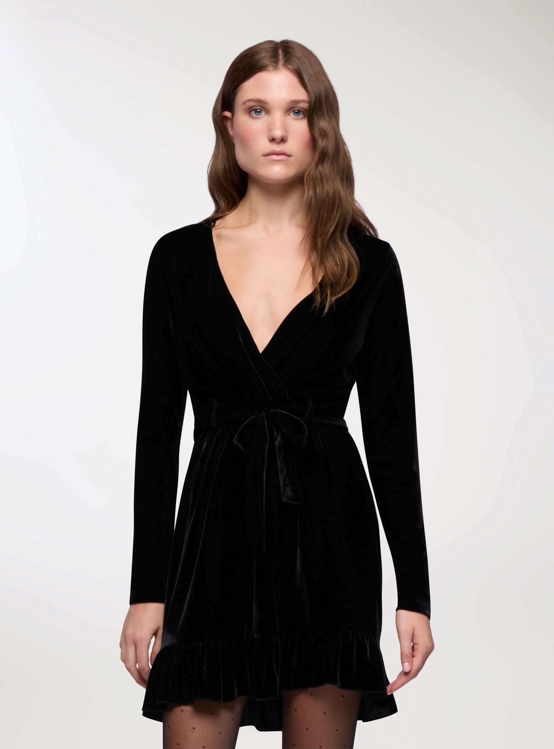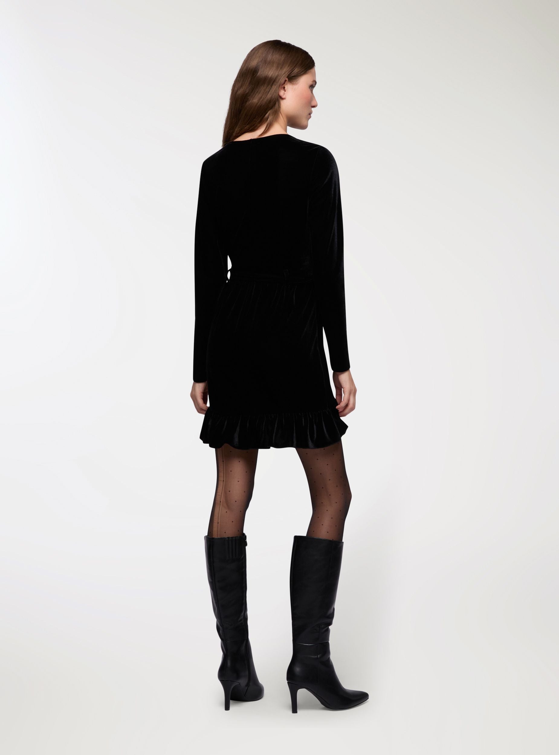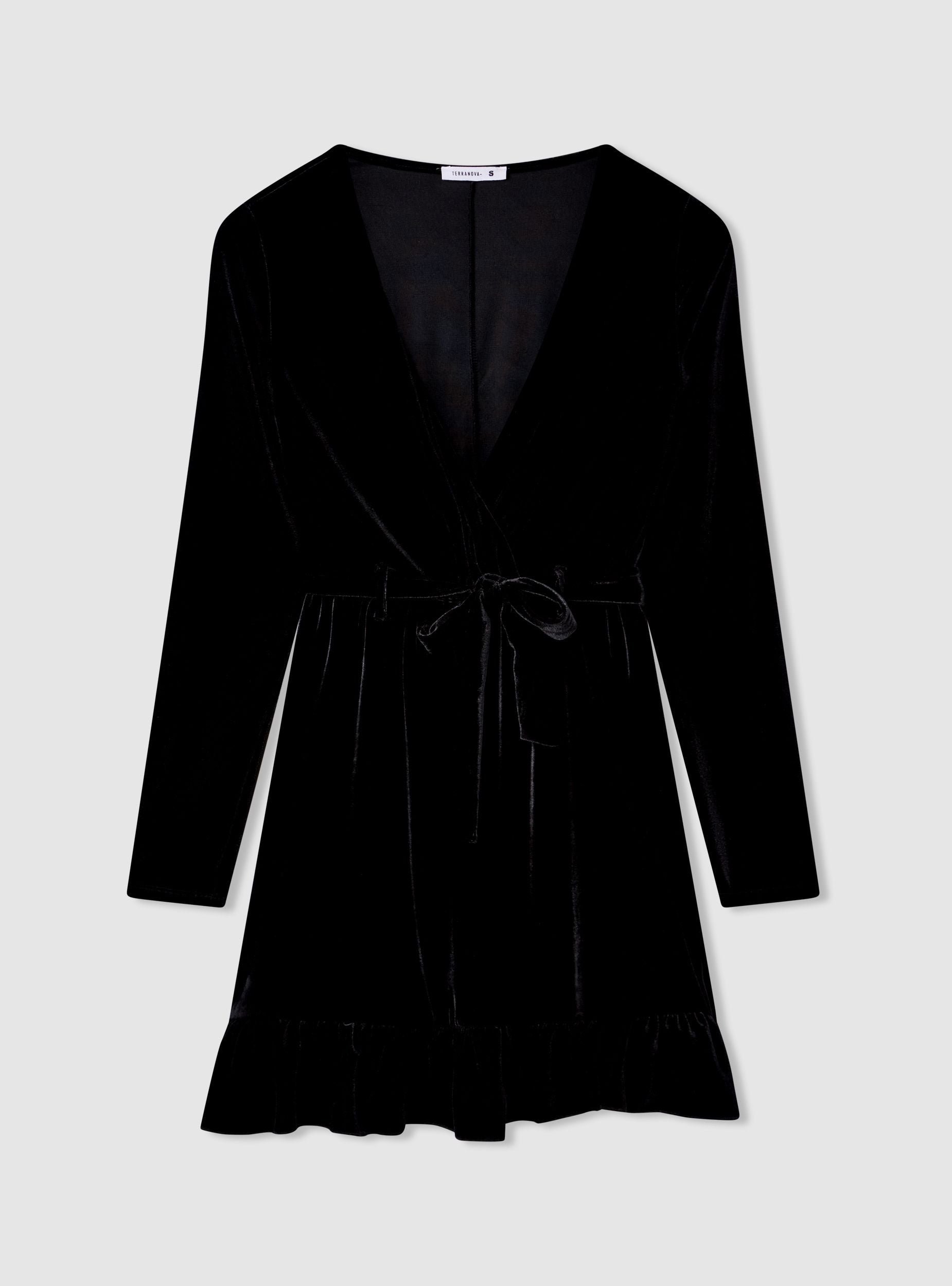 Sukienka damska z jednolitej aksamitki z kopertowym krojem i dekoltem w serek, stworzona na wieczory i wydarzenia. Model ma długie rękawy, pasek do wiązania w talii podkreślający sylwetkę oraz krótką spódnicę z marszczoną falbaną. Mini długość łatwa do zestawienia z kozakami lub czółenkami. Kobiecy i uniwersalny design, idealny w połączeniu z marynarką lub płaszczem dla eleganckiego wyglądu.Szczegóły