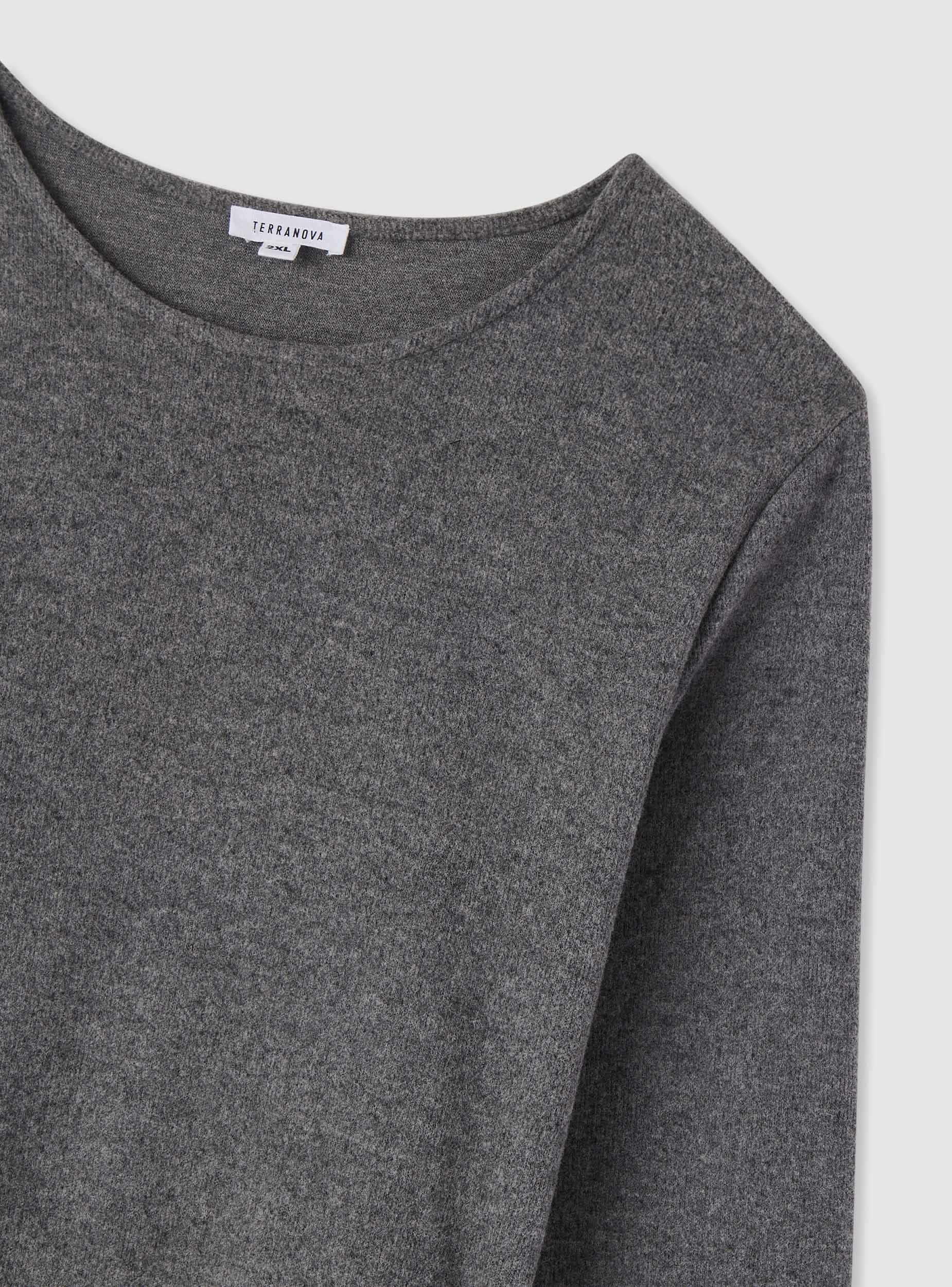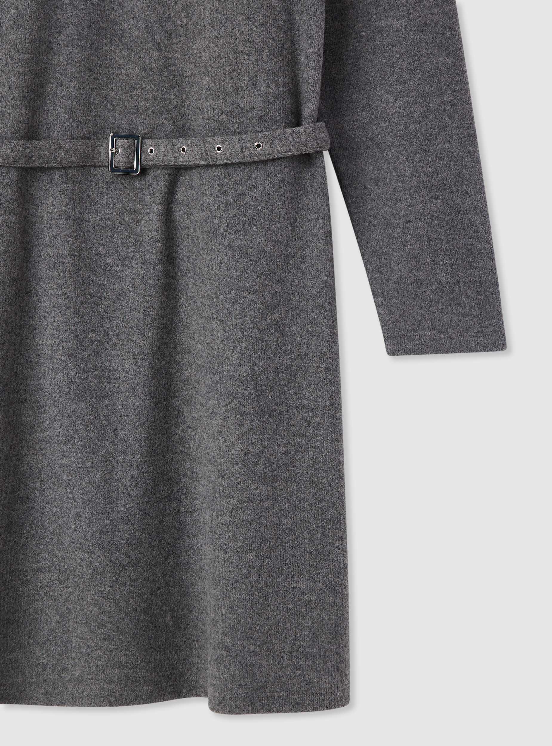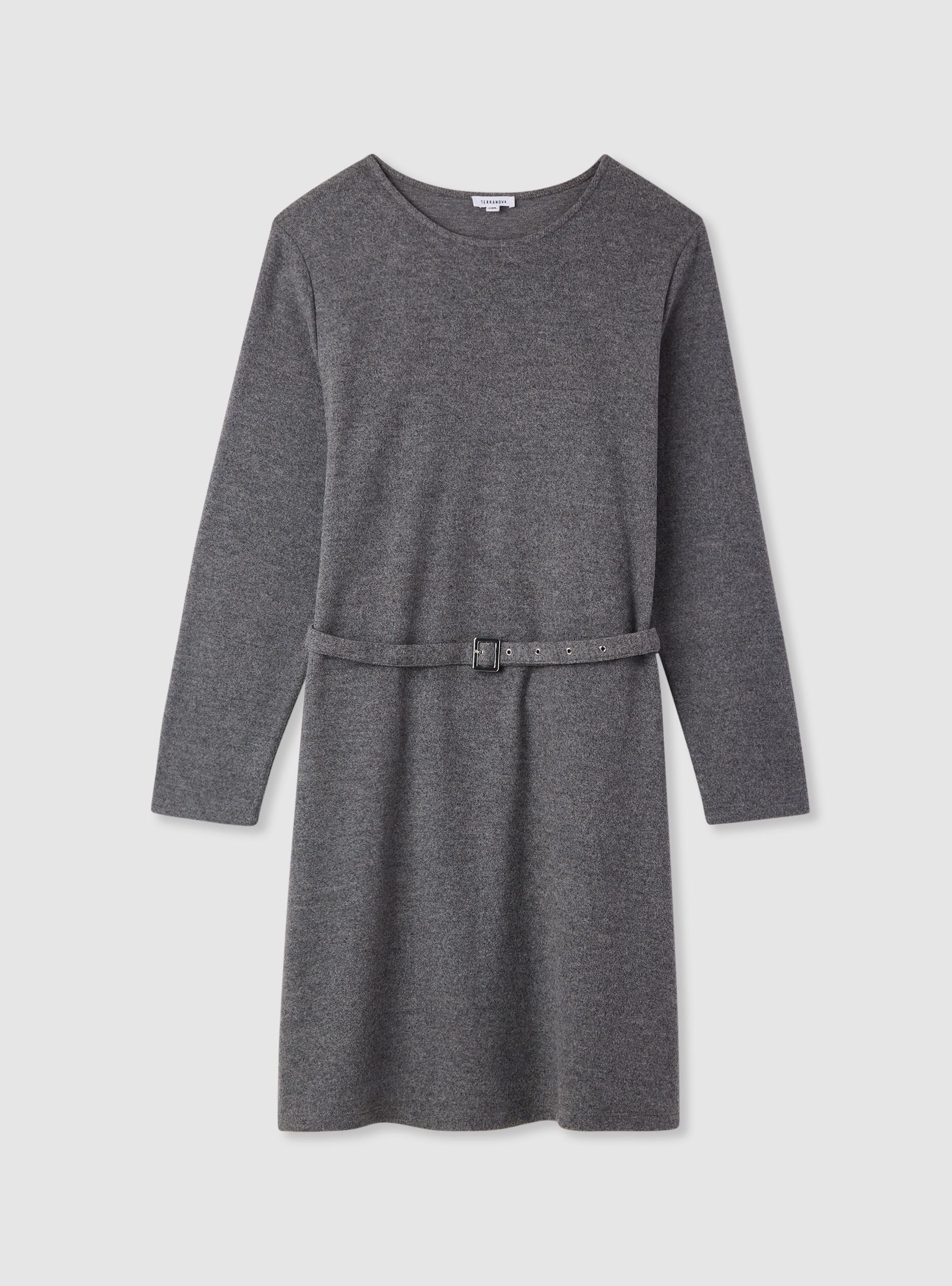 Sukienka damska w jednolitym kolorze z okrągłym dekoltem i długimi rękawami. Prosty krój podkreślony wąskim paskiem z klamrą w talii, który definiuje sylwetkę. Długość powyżej kolana. Łatwa do zestawienia z kozakami lub sneakersami na czas wolny oraz z marynarką lub trenczem do biura. Komfortowe dopasowanie i czysty, prosty design, który łatwo łączyć z innymi elementami garderoby.