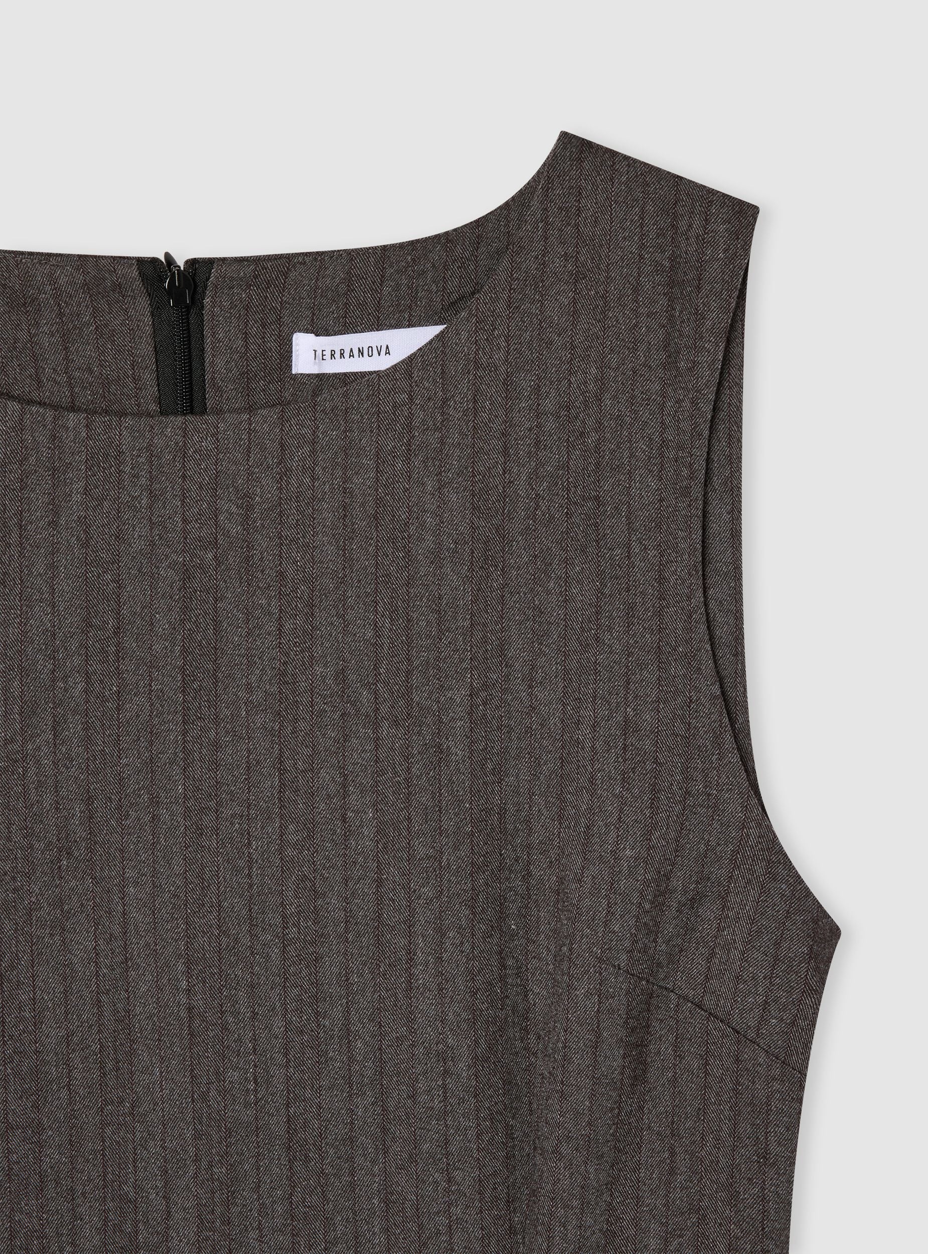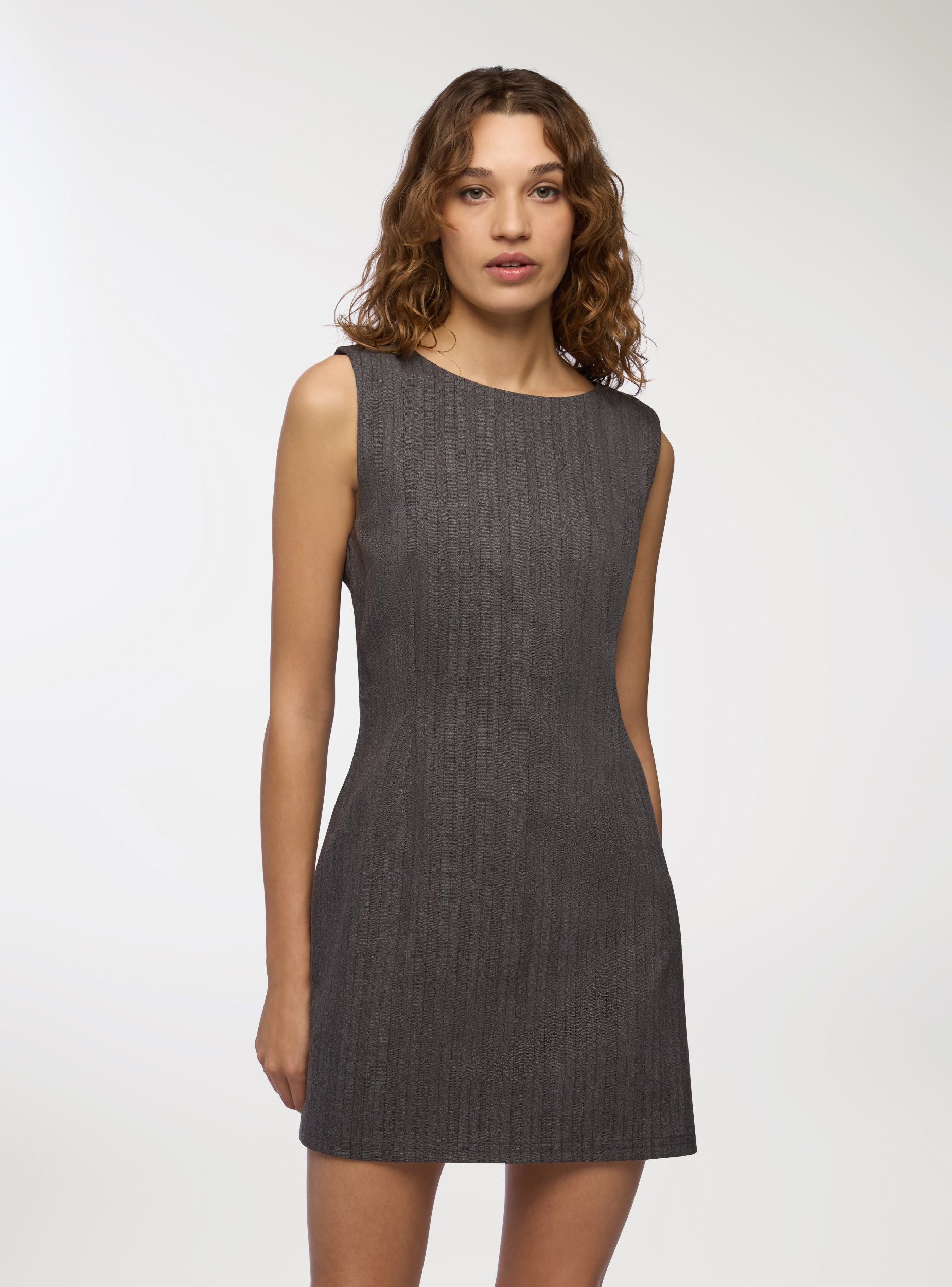 Sukienka damska z okrągłym dekoltem, charakteryzująca się bezrękawnym krojem i zapięciem na zamek błyskawiczny z tyłu. Posiada wzór w jodełkę, który sprawia, że jest idealna na oficjalne lub zawodowe okazje. Regularny krój i prosty fason czynią ją wszechstronną i odpowiednią do łączenia z eleganckimi lub casualowymi dodatkami.
