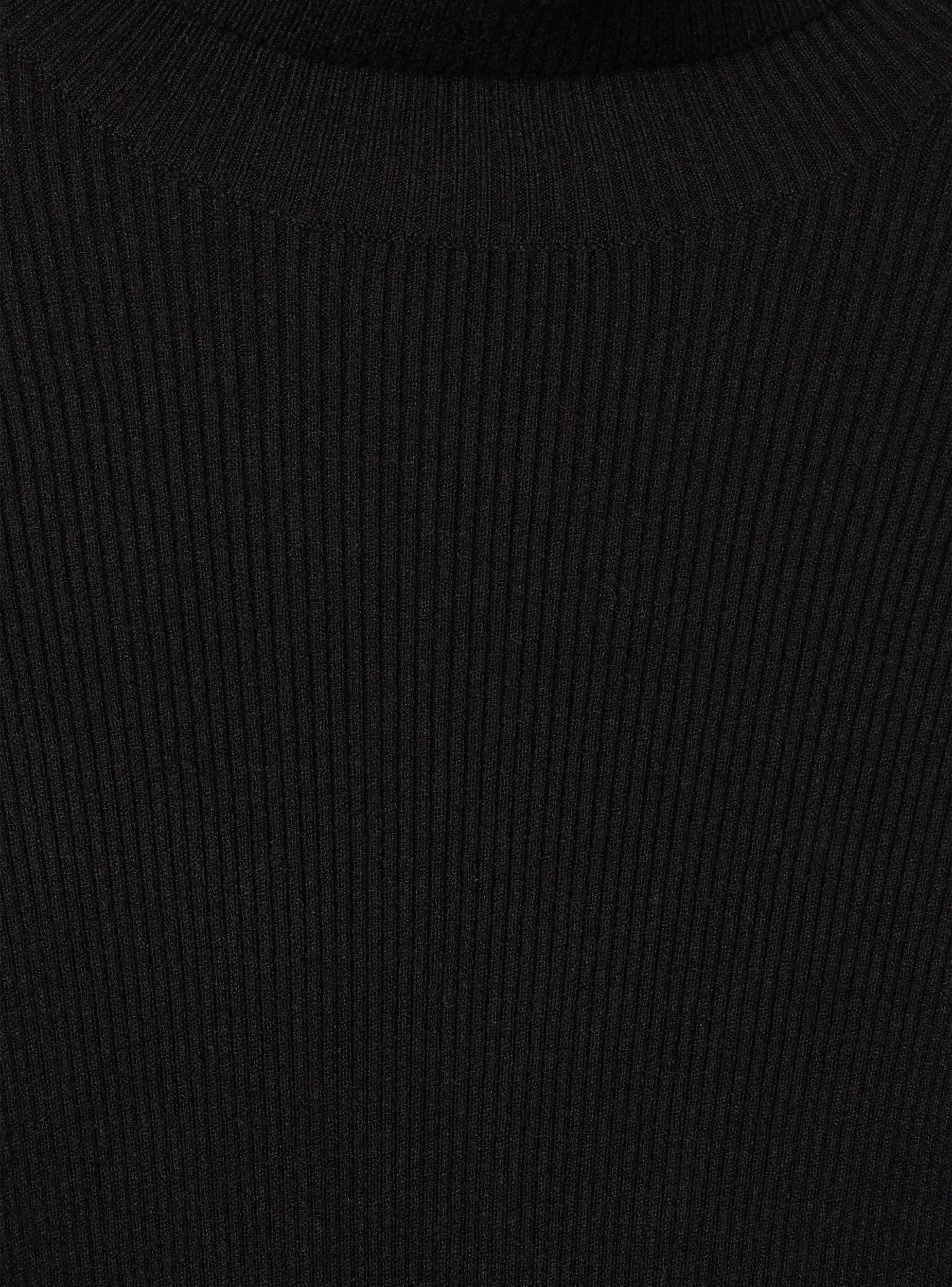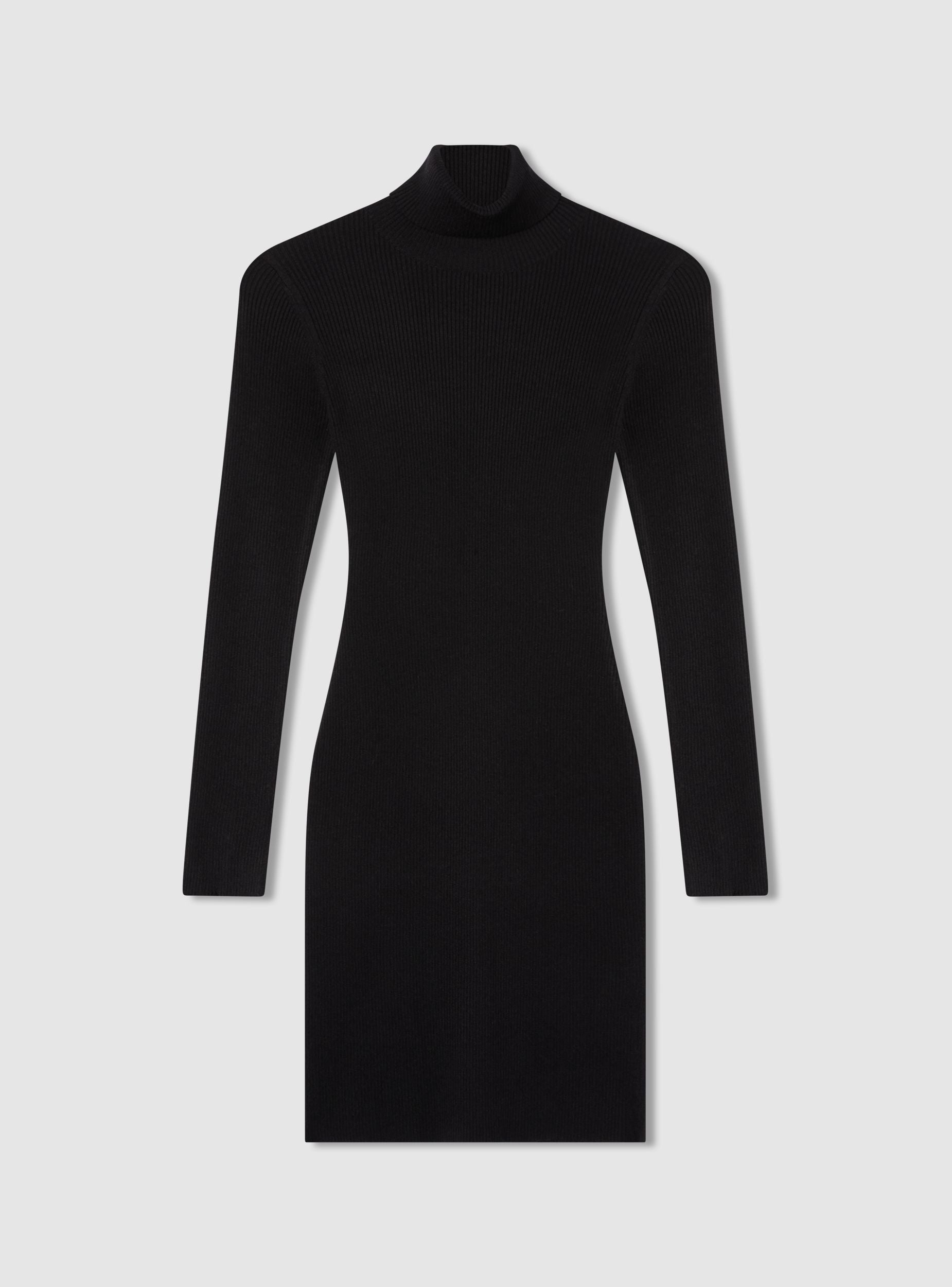 Sukienka damska z jednolitej dzianiny, charakteryzująca się dopasowanym krojem i elegancko otulającym kołnierzem typu golf. Długie rękawy i prążkowane wykończenie podkreślają sylwetkę, czyniąc ją idealną do wyrafinowanych i nowoczesnych stylizacji. Doskonała do noszenia z wysokimi botkami lub botkami za kostkę, jest wszechstronnym elementem garderoby na zimę, odpowiednim zarówno do biura, jak i na wieczorne wyjścia.