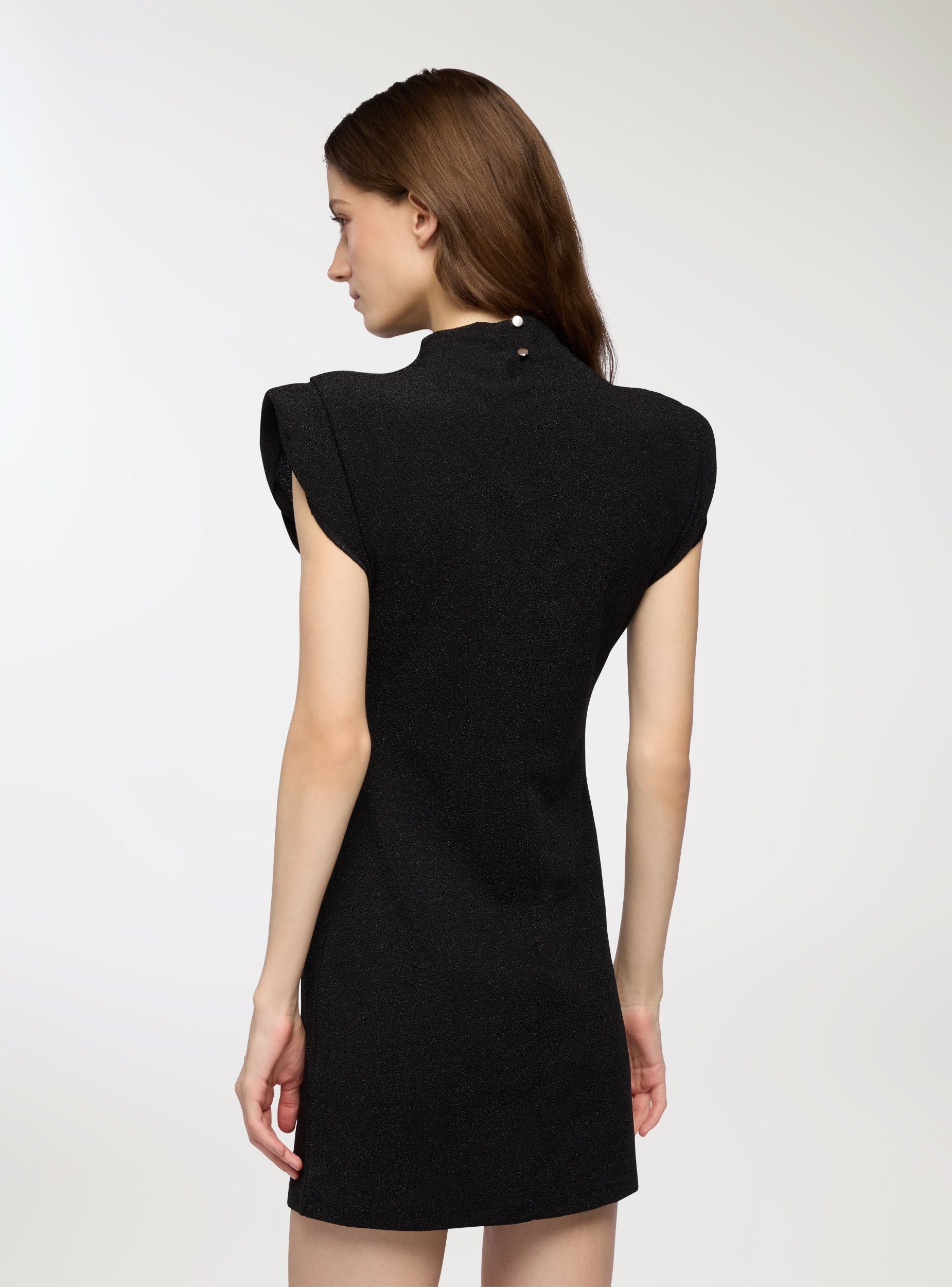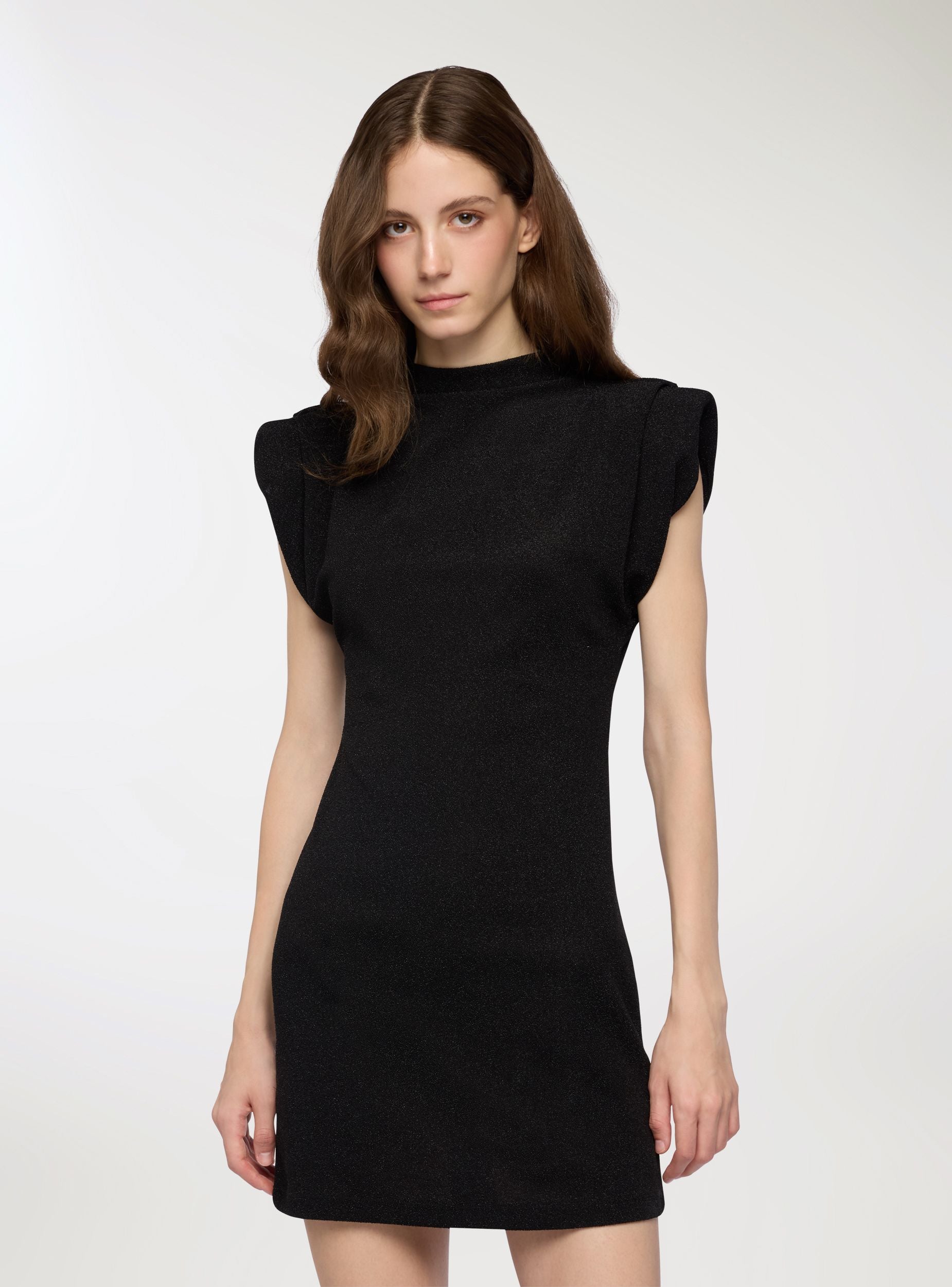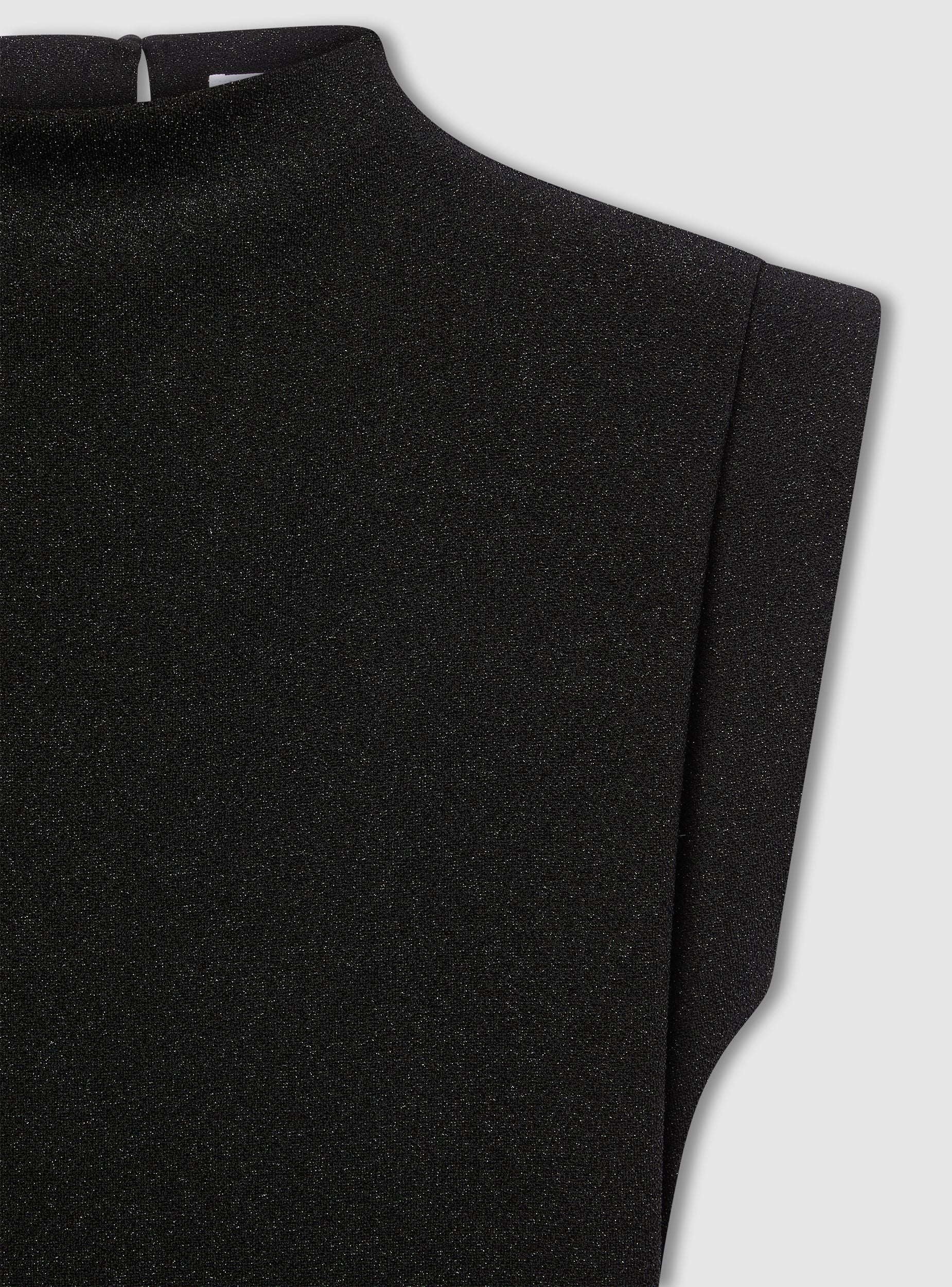 Sukienka damska z golfem i poduszkami na ramionach, w jednolitym, błyszczącym kolorze. Prosty krój bez rękawów, z małym otworem z tyłu i guzikiem przy szyi. Idealna na wieczory i wydarzenia, pasuje do strukturalnych marynarek i wysokich sandałów lub do kozaków i kopertówek dla zdecydowanego wyglądu. Czysty design podkreślający sylwetkę w nowoczesnym stylu.Szczegóły