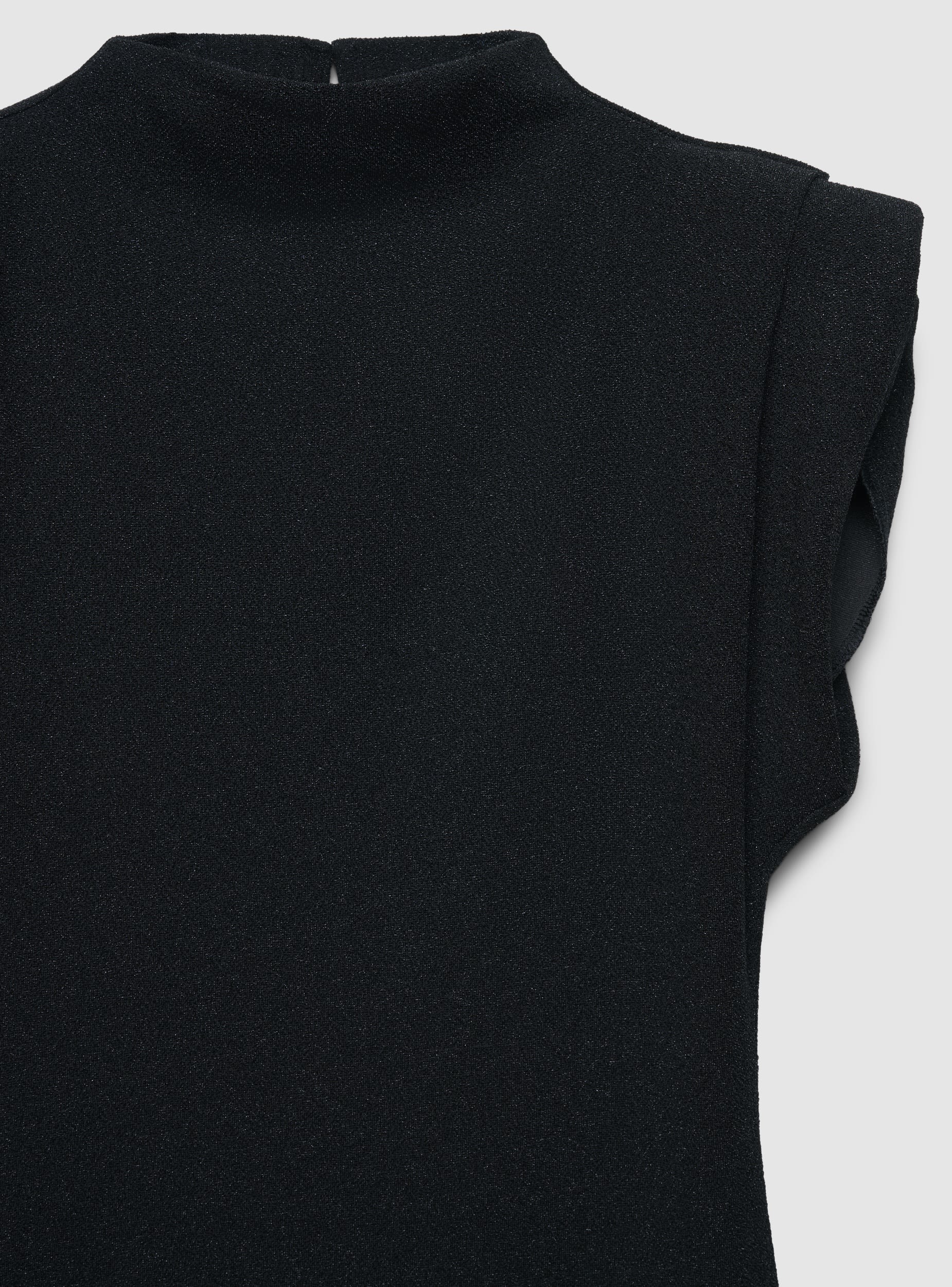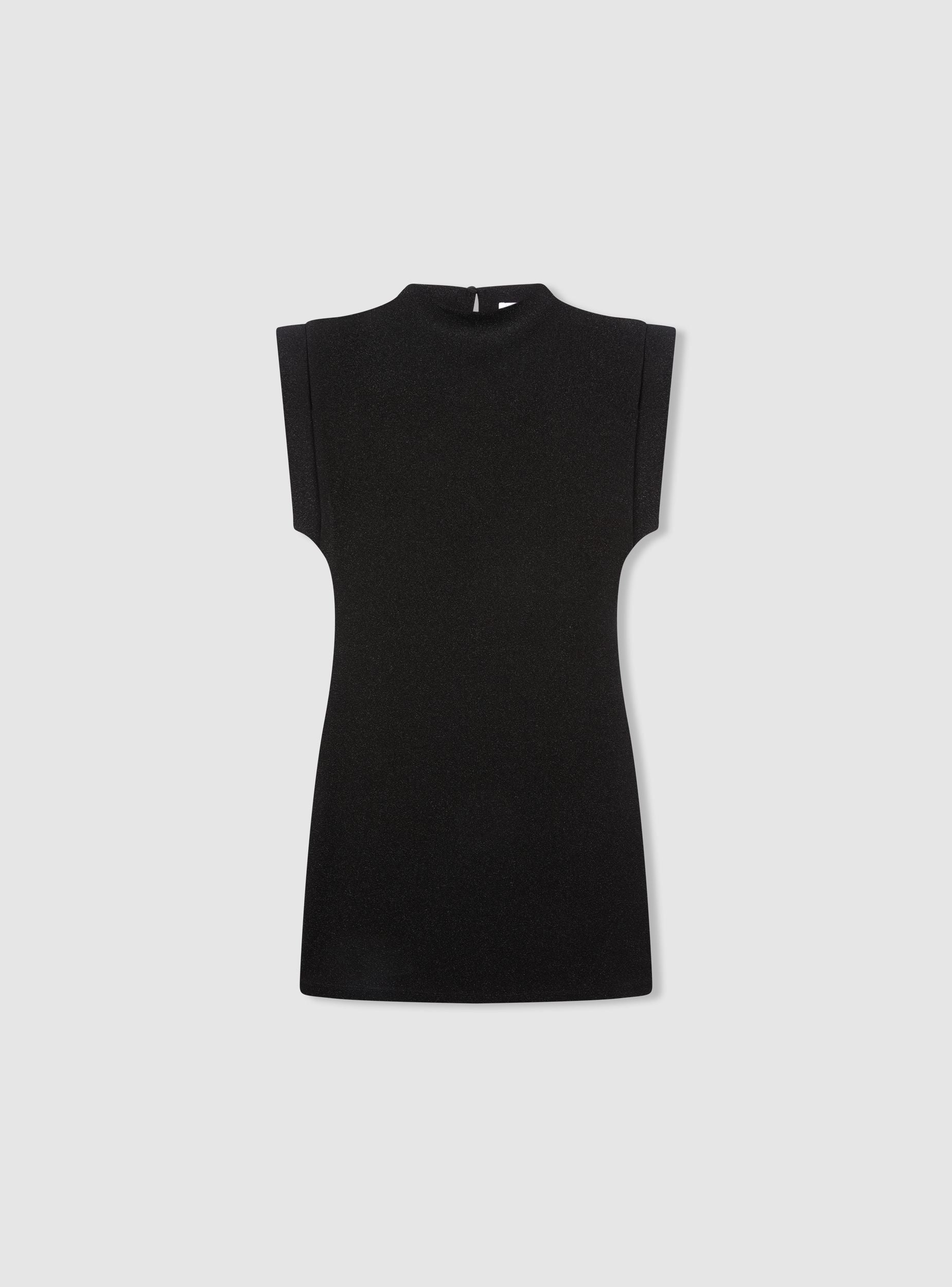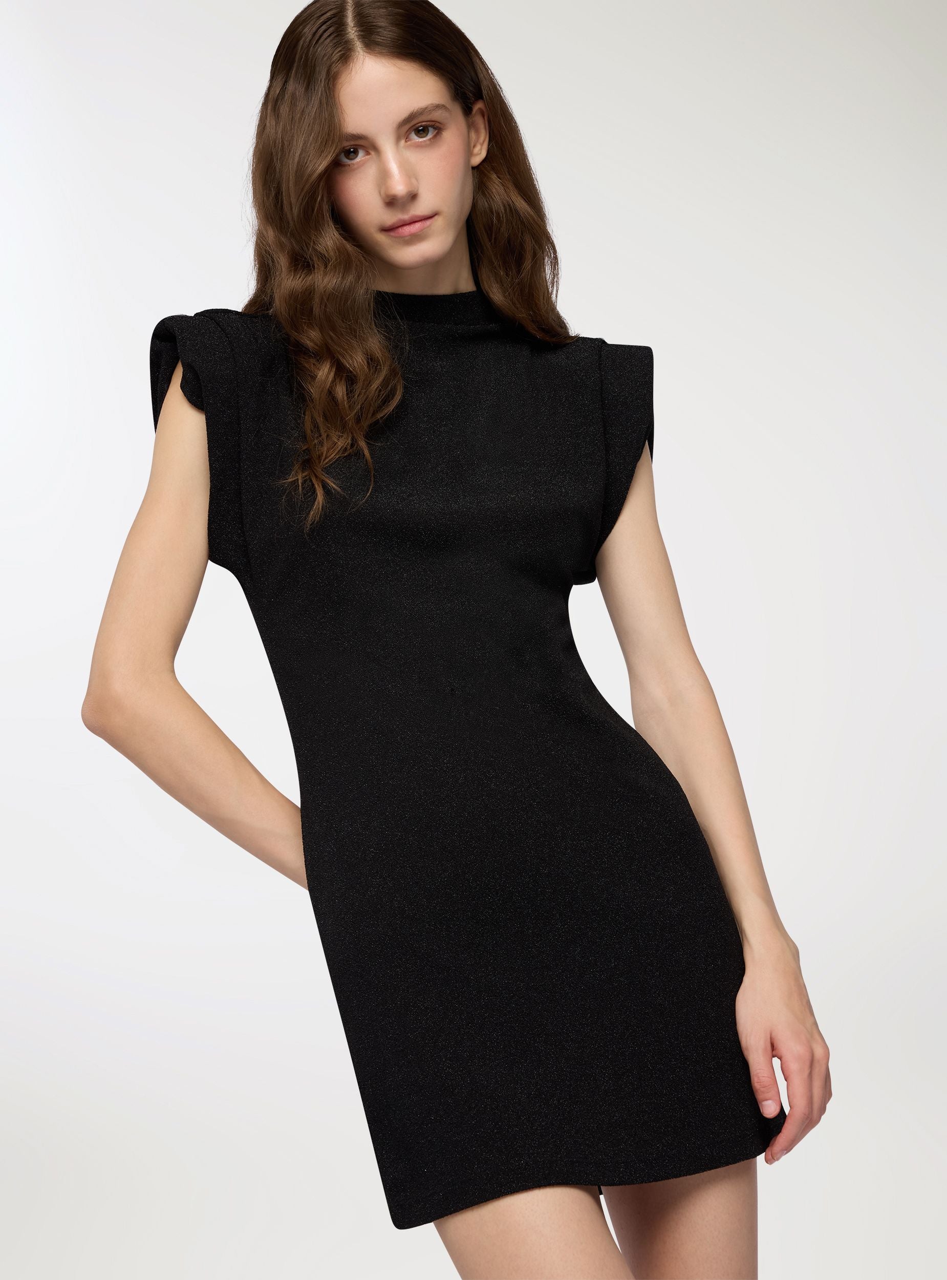 Sukienka damska z golfem i poduszkami na ramionach, w jednolitym, błyszczącym kolorze. Prosty krój bez rękawów, z małym otworem z tyłu i guzikiem przy szyi. Idealna na wieczory i wydarzenia, pasuje do strukturalnych marynarek i wysokich sandałów lub do kozaków i kopertówek dla zdecydowanego wyglądu. Czysty design podkreślający sylwetkę w nowoczesnym stylu.Szczegóły
