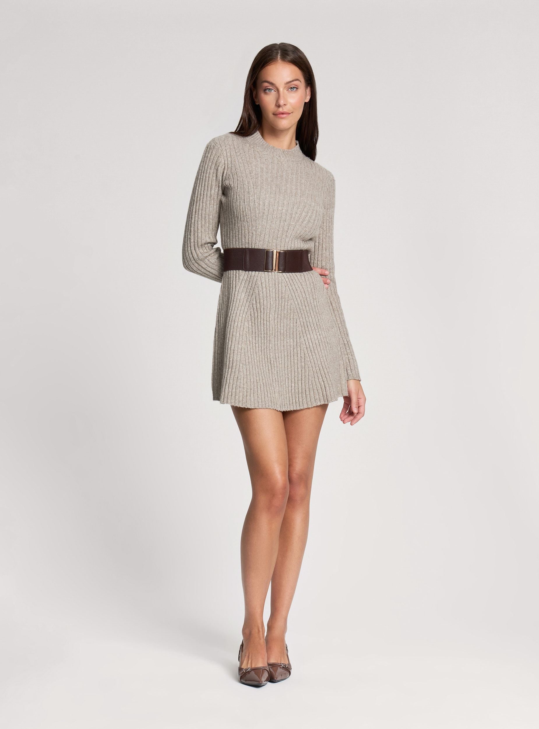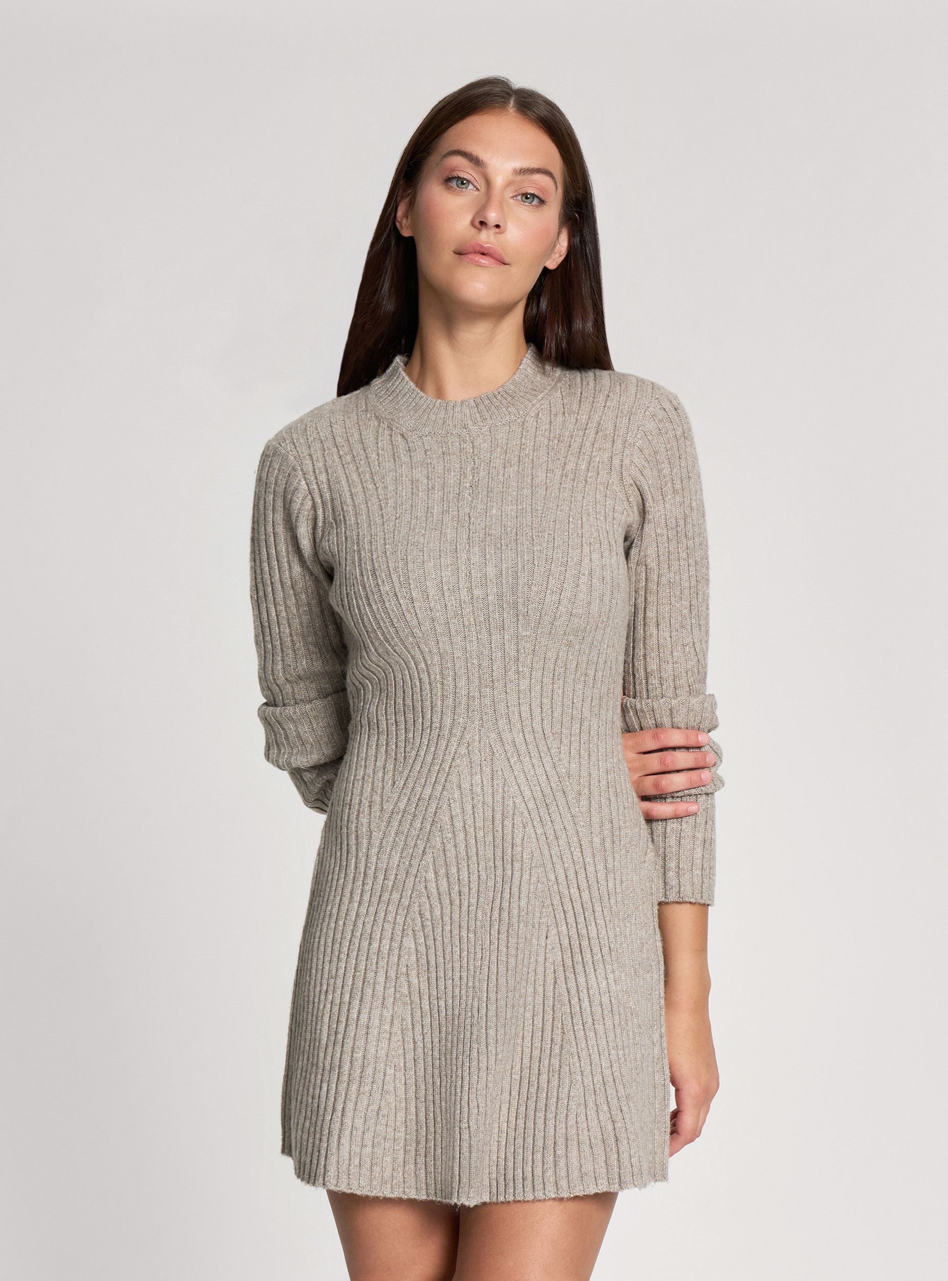 Sukienka damska z prążkowanego dzianiny, idealna na jesień i zimę. Pionowe prążkowanie wysmukla sylwetkę i podkreśla talię, natomiast rozszerzany dół dodaje ruchu i kobiecości. Długi rękaw i okrągły dekolt sprawiają, że jest idealna zarówno na co dzień, jak i na bardziej eleganckie okazje. Do zestawienia z wysokimi kozakami lub botkami, tworząc kompletną i wszechstronną stylizację.