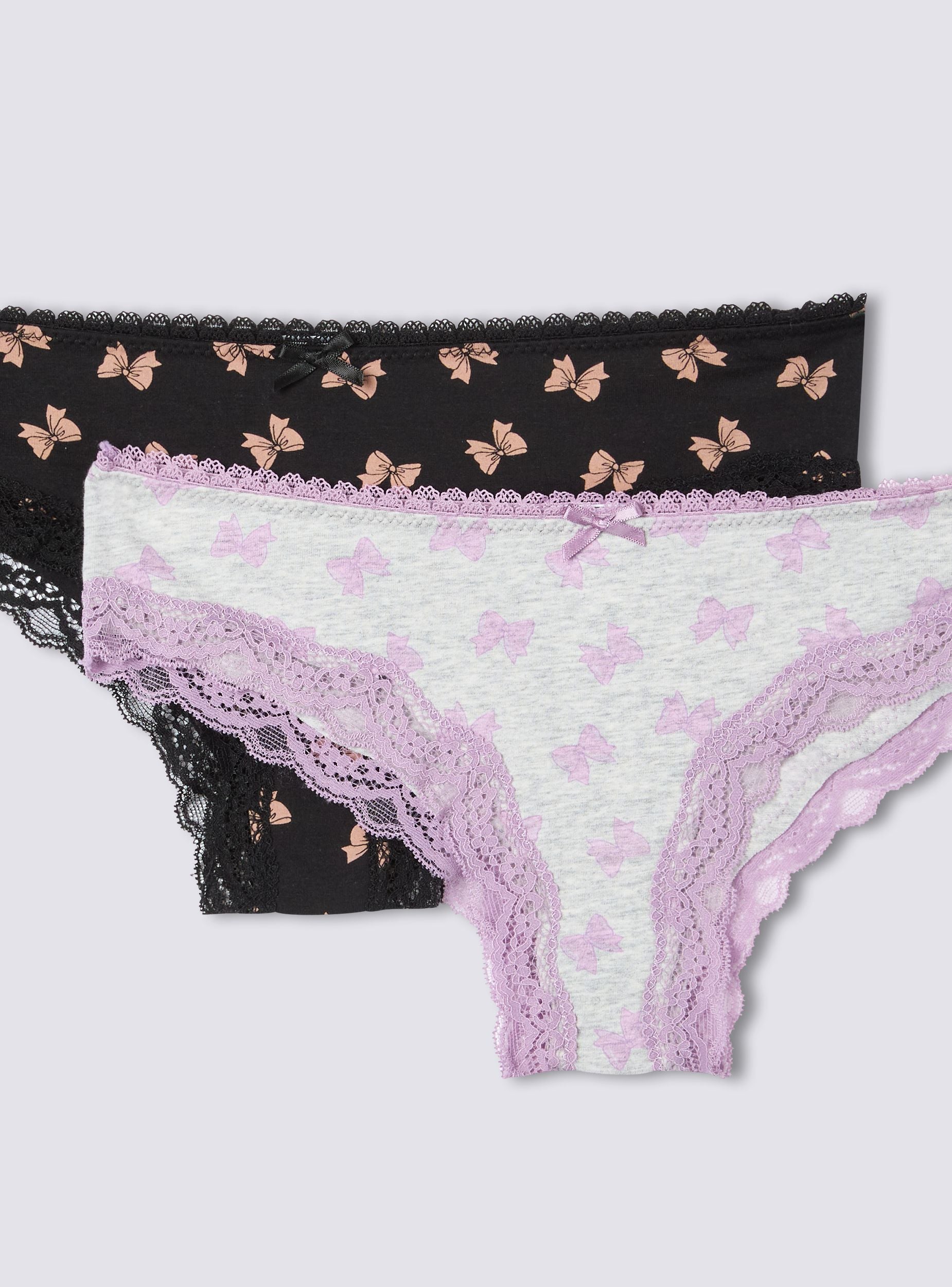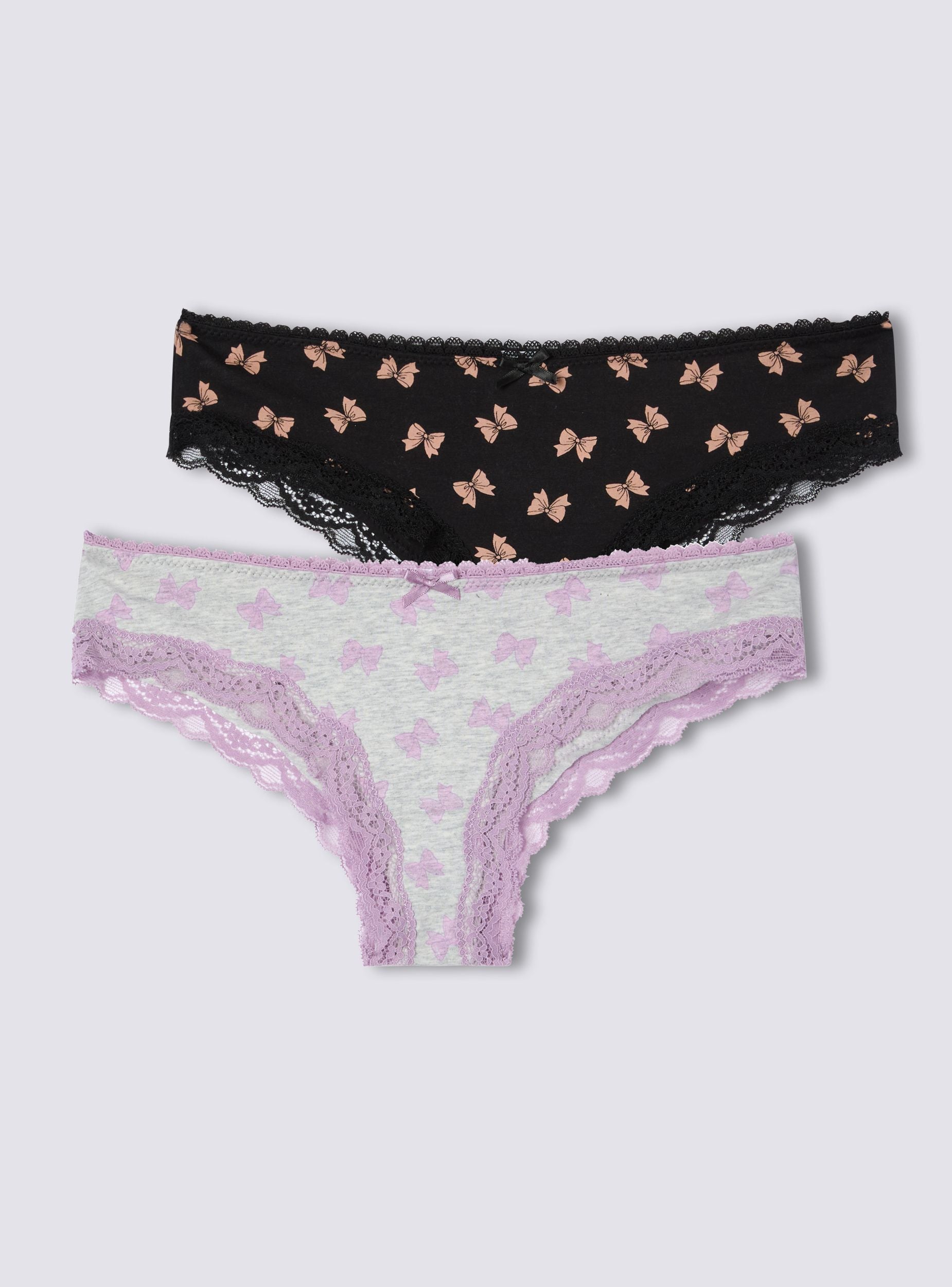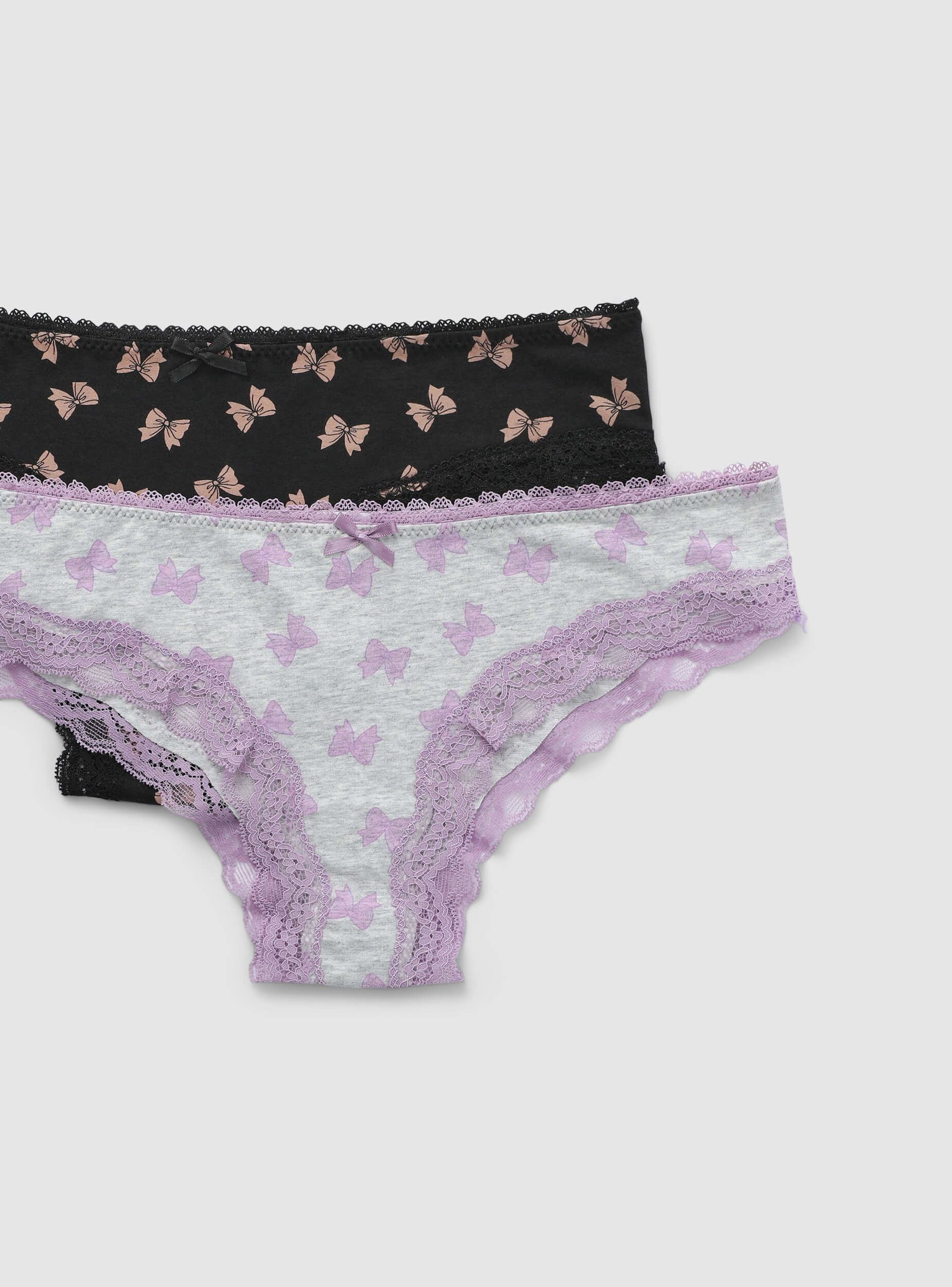 Opakowanie składające się z 2 damskich majtek o delikatnym i kobiecym designie. Oba modele zdobione są eleganckim wzorem w kokardki i wzbogacone o koronkowe detale, które dodają wyrafinowania. Aplikowana kokardka dopełnia wygląd nutą elegancji. Idealne dla tych, którzy pragną bielizny starannie wykonanej i komfortowej na każdą okazję.Szczegóły