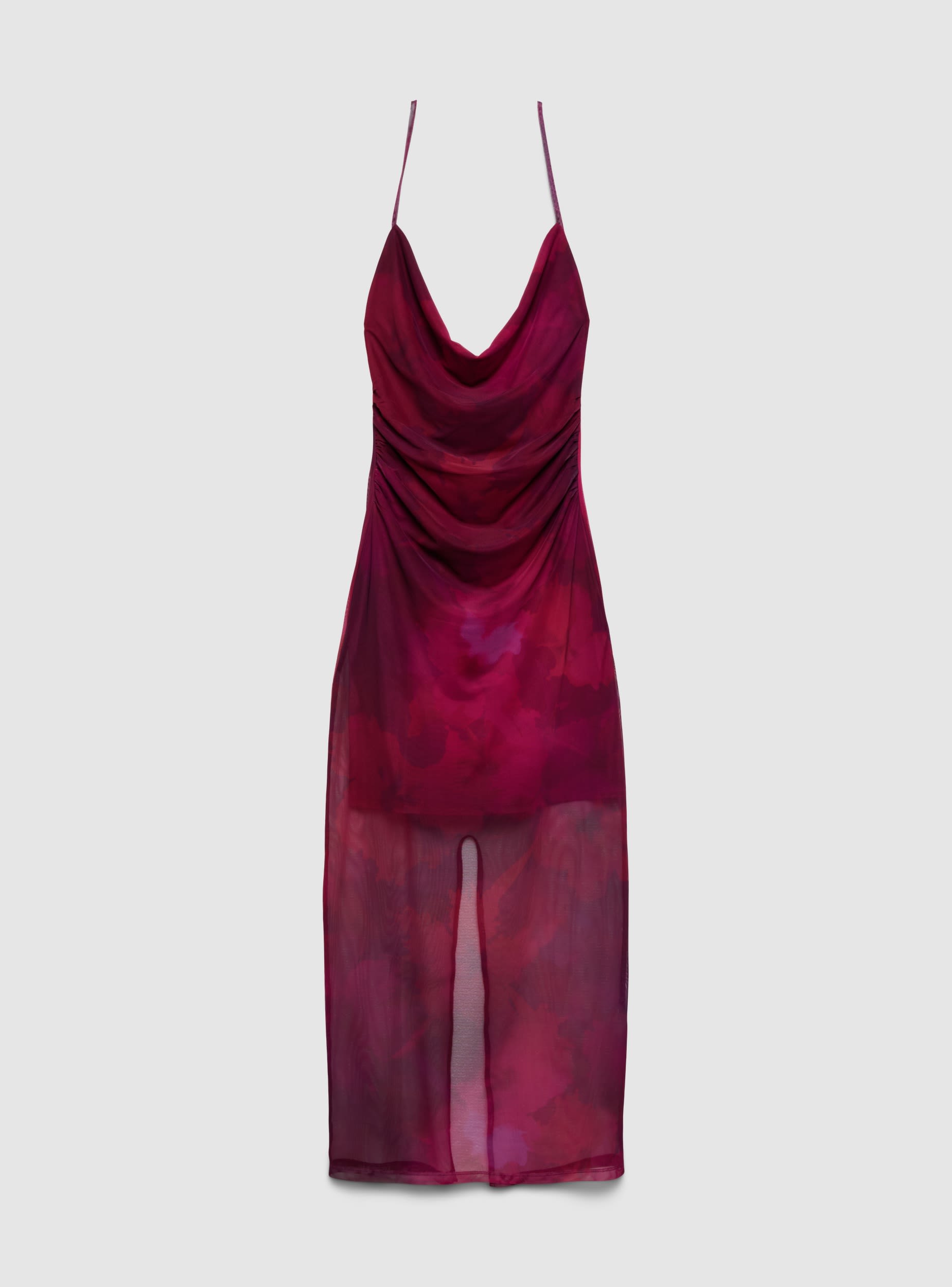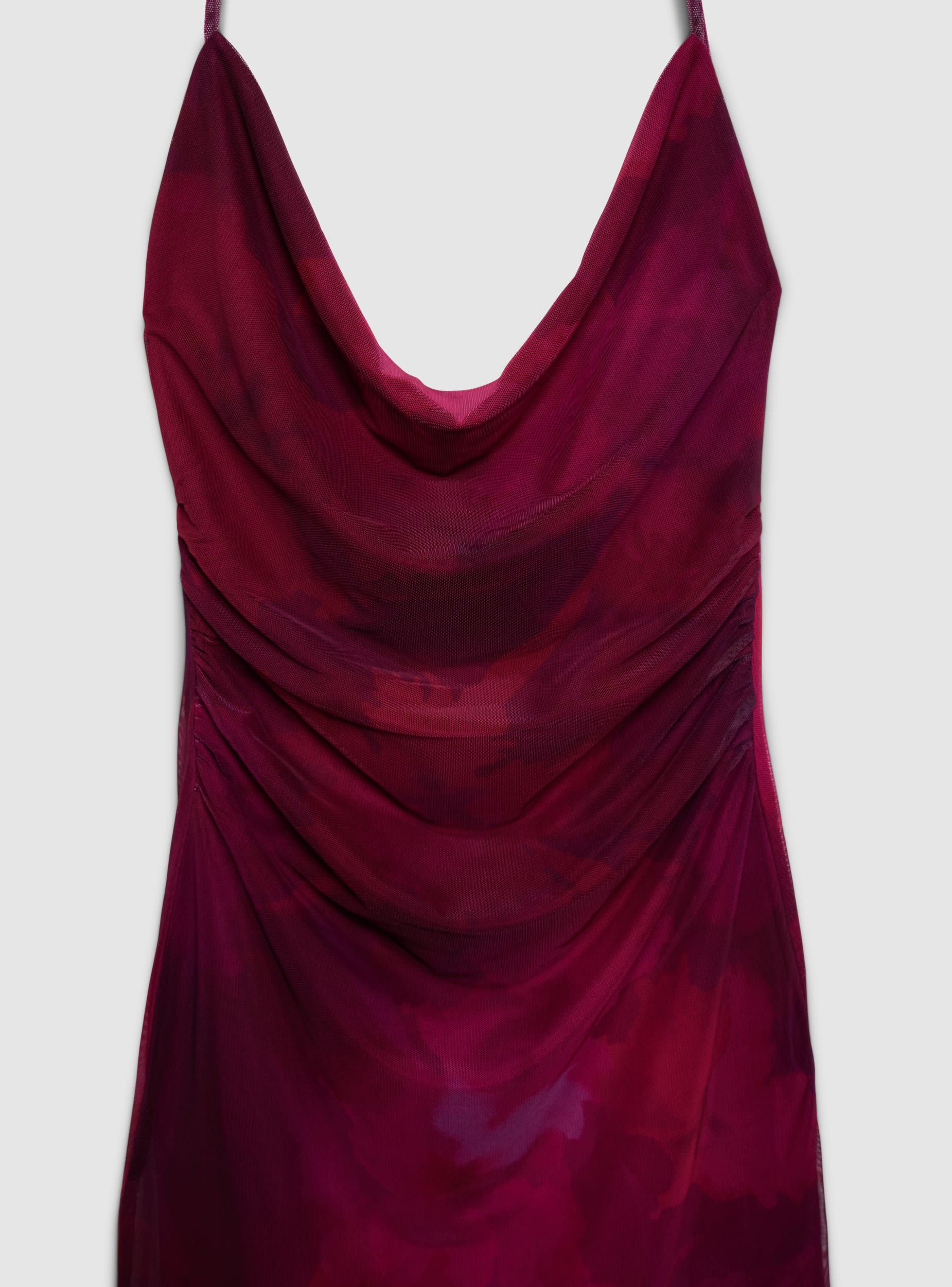 Abito da donna lungo con stampa sfumata, pensato per look da sera e occasioni speciali. Il modello a spalline sottili presenta scollo drappeggiato effetto cascata e arricciature sui fianchi che valorizzano la silhouette. Spacco frontale per maggiore movimento. Da abbinare a sandali e mini bag per un outfit d’impatto.Dettagli