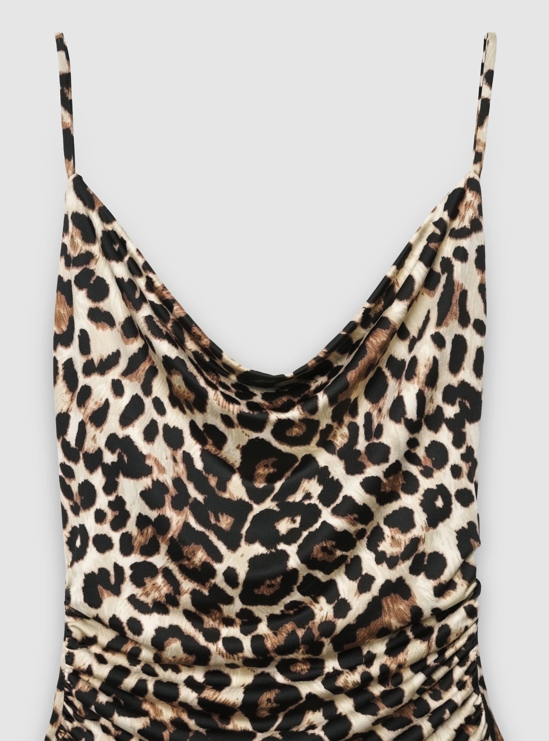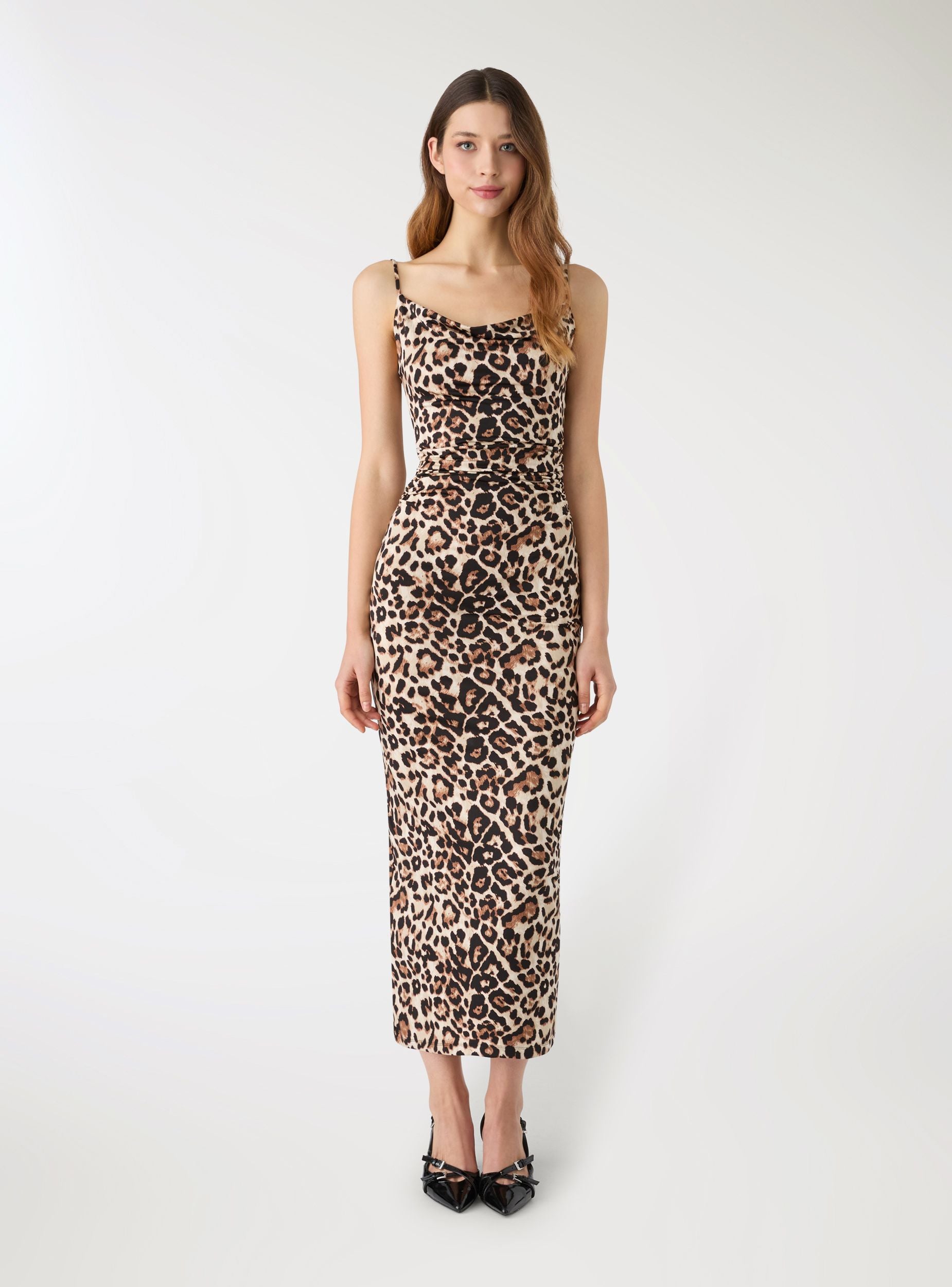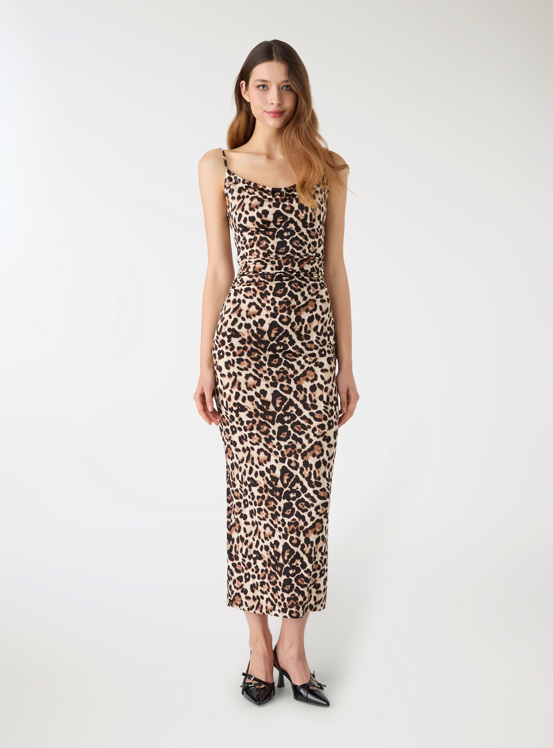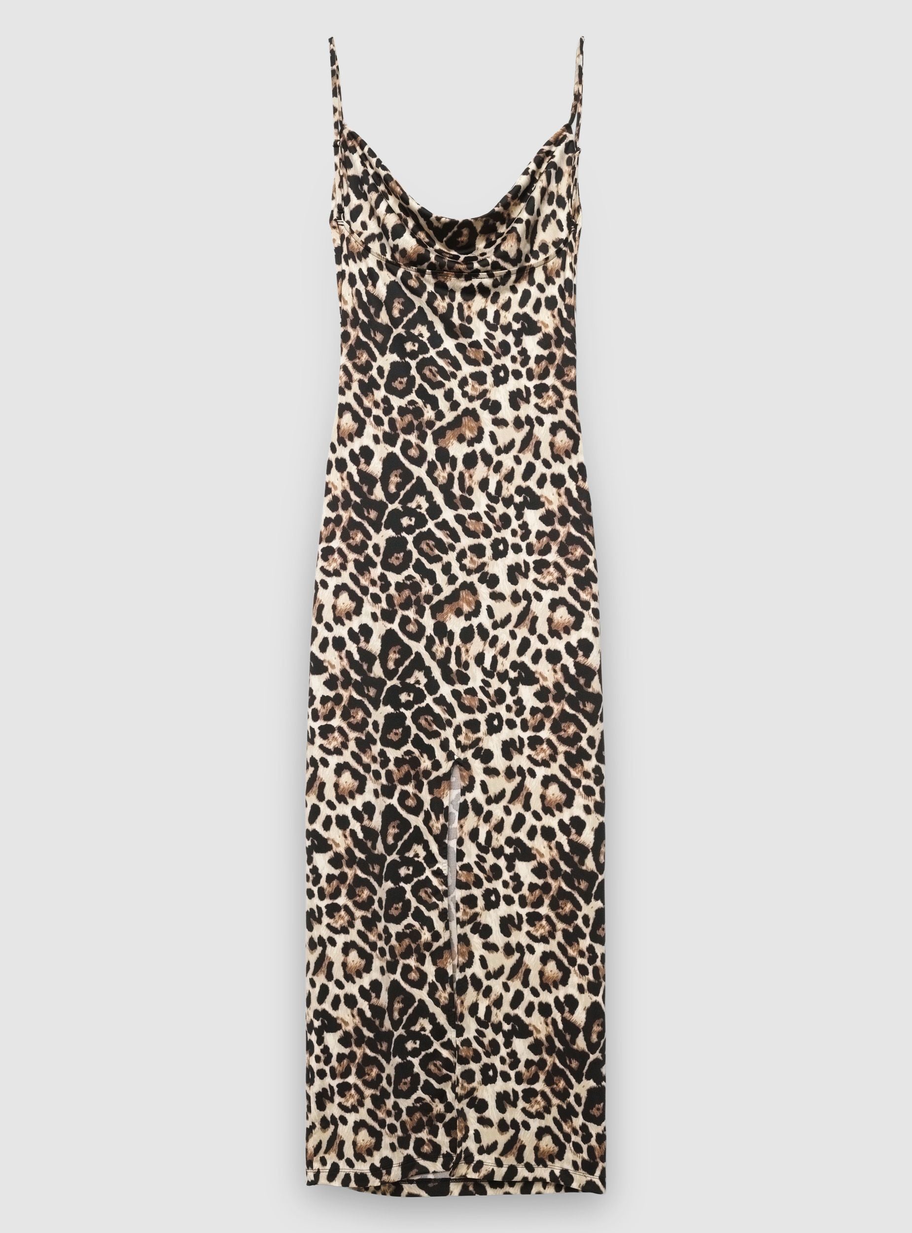 Abito da donna con spalline sottili e scollo morbido drappeggiato. Lo spacco posteriore facilita il movimento. Tessuto elasticizzato. Fantasia animalier ideale per serate, eventi o uscite trendy, facile da abbinare a sandali con tacco e clutch per un look deciso.Dettagli