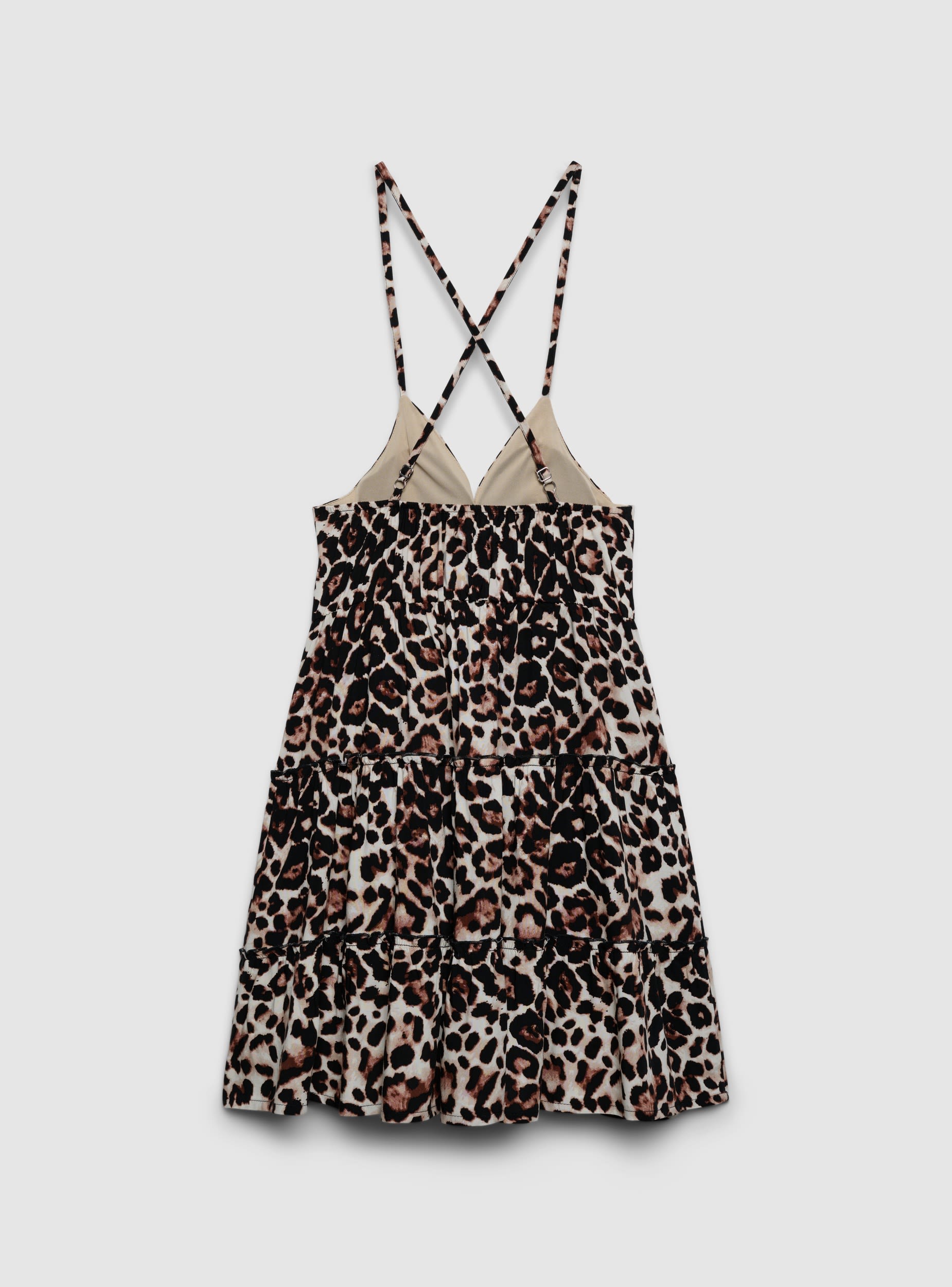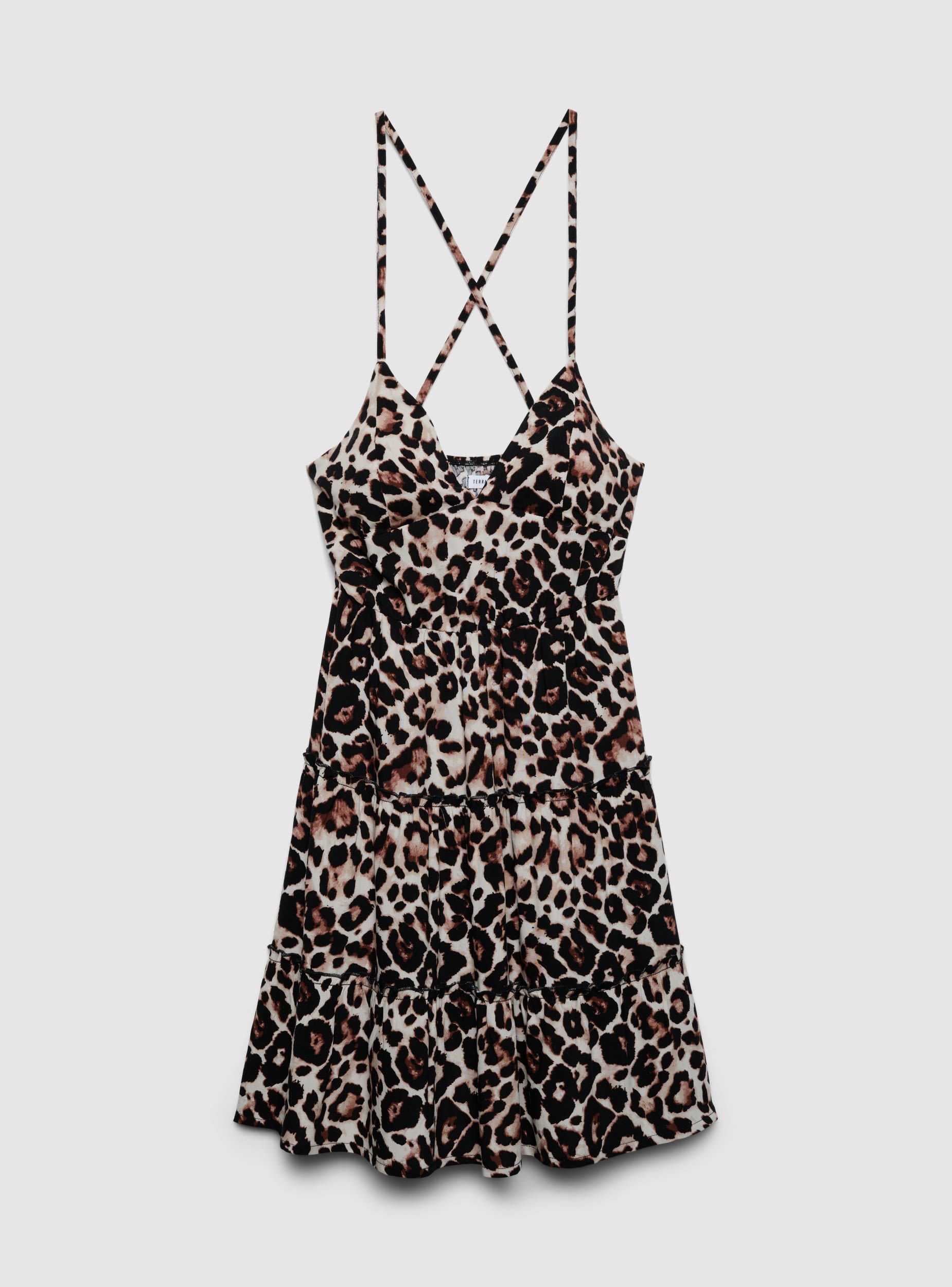 Abito da donna con stampa animalier e scollo a V, pensato per look estivi da città e vacanza. Le bretelline sottili regolabili si incrociano sul retro e valorizzano le spalle, mentre la vita elasticizzata definisce la silhouette con comfort. Gonna a balze con volume e movimento, facile da abbinare a sandali o sneakers. Senza chiusura e senza tasche.Dettagli