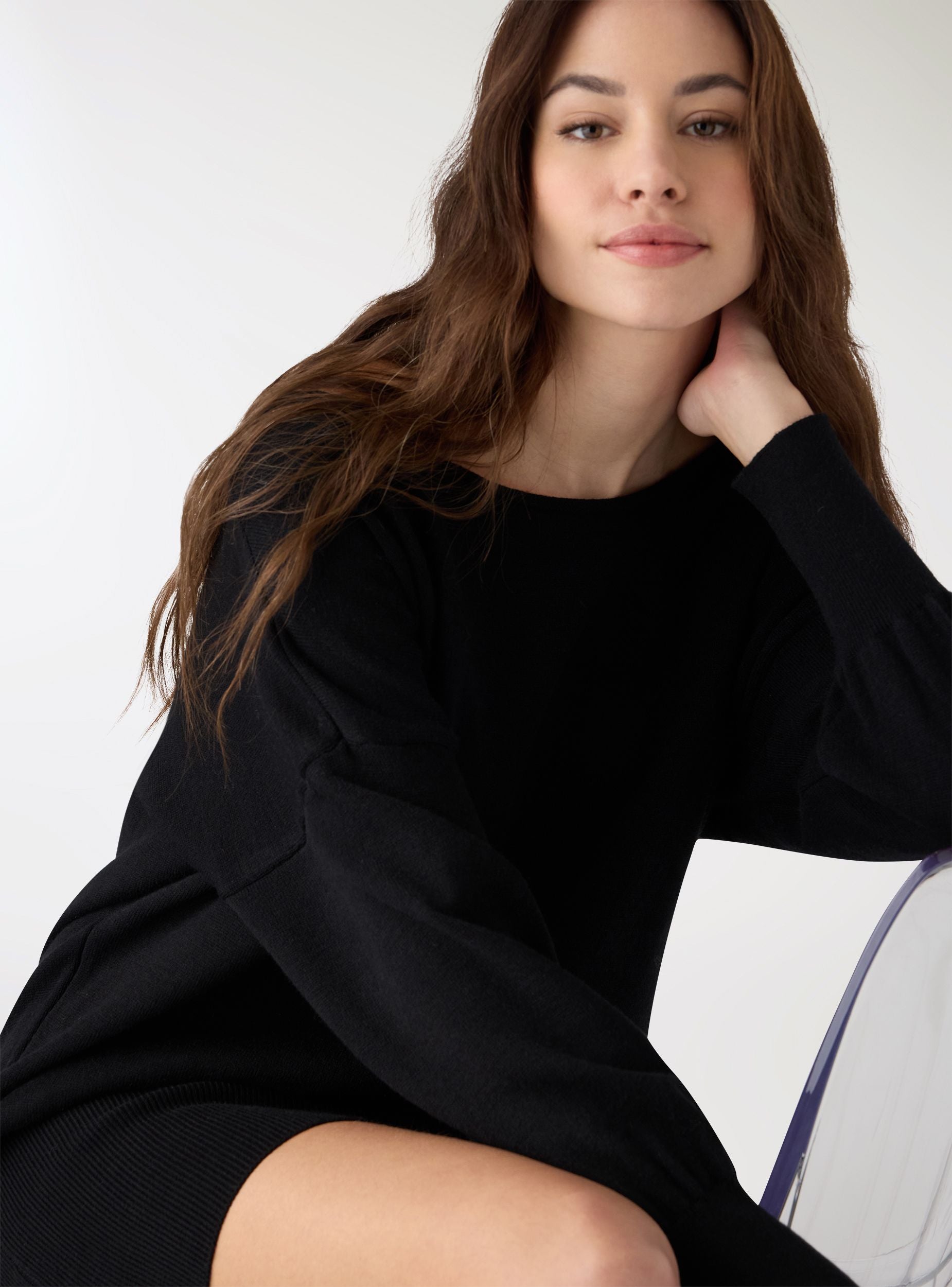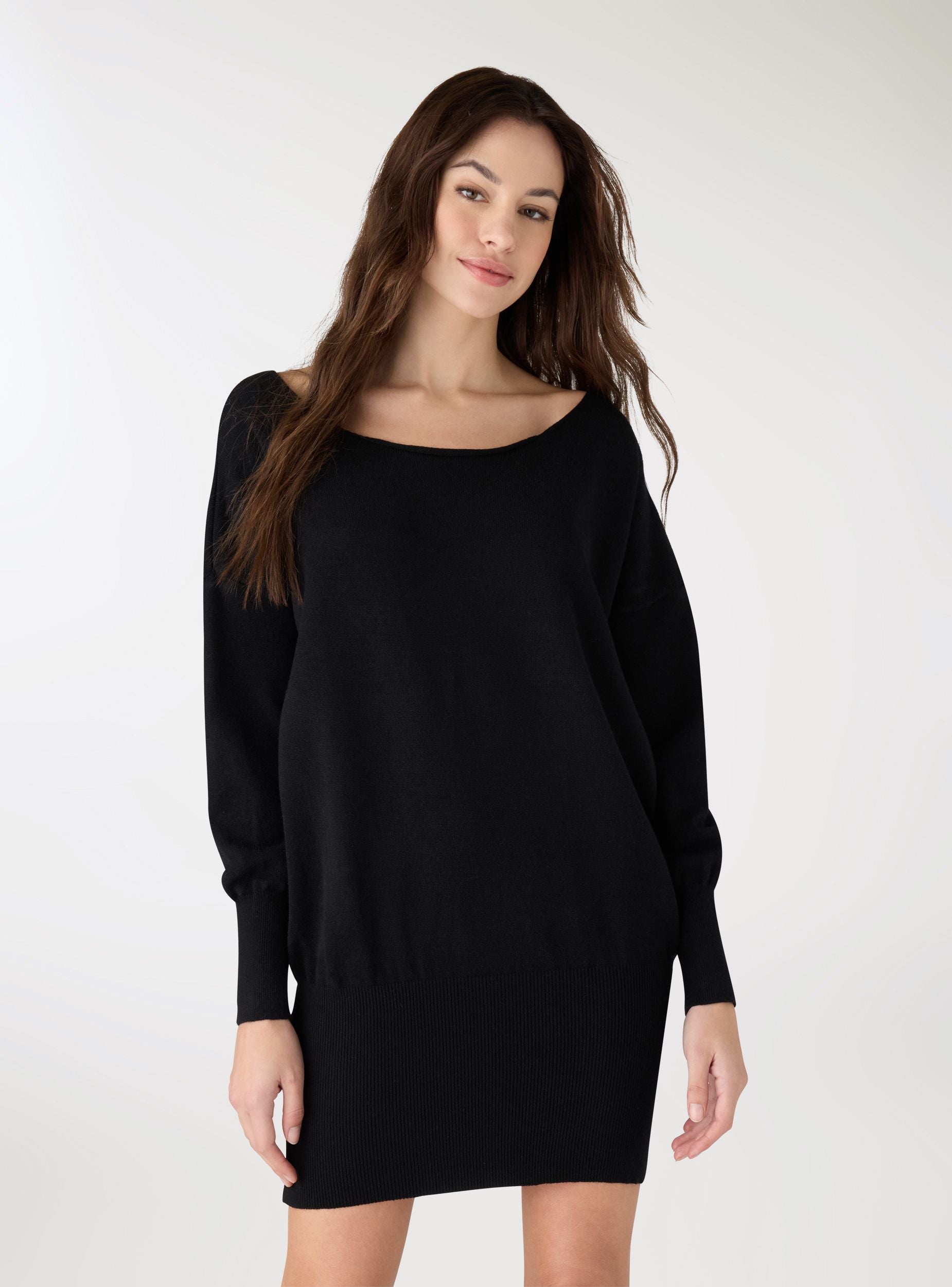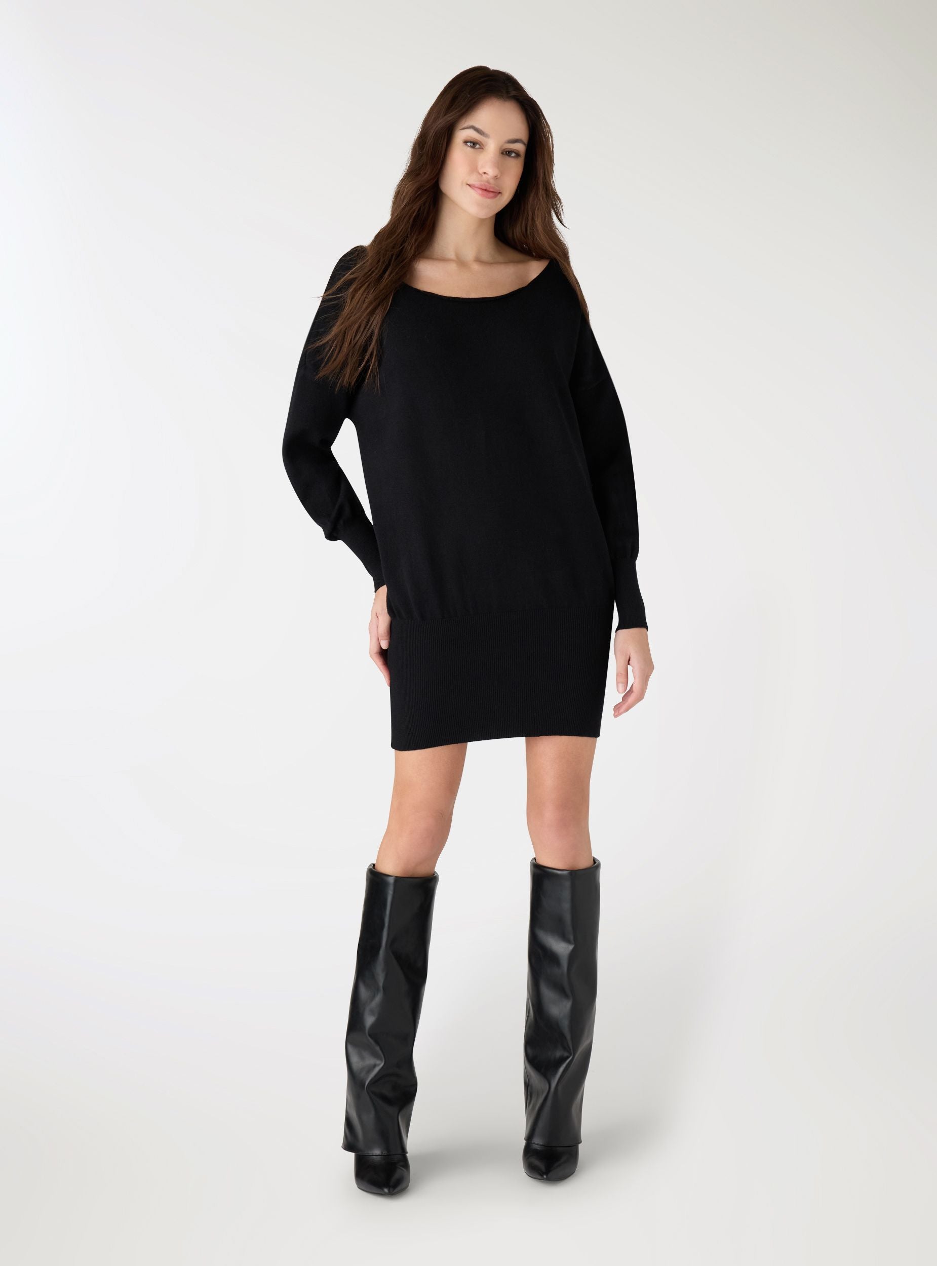 Abito da donna a tinta unita in maglia, ideale per look casual o da ufficio. Presenta scollo a barca, maniche lunghe con polsi a costine e fondo a fascia elasticizzata che valorizza la silhouette. La vestibilità è regular e la lavorazione in maglia lo rende confortevole per il tempo libero o abbinato a stivaletti e cintura per un outfit più curato. Nessuna chiusura, design essenziale e pulito.Dettagli