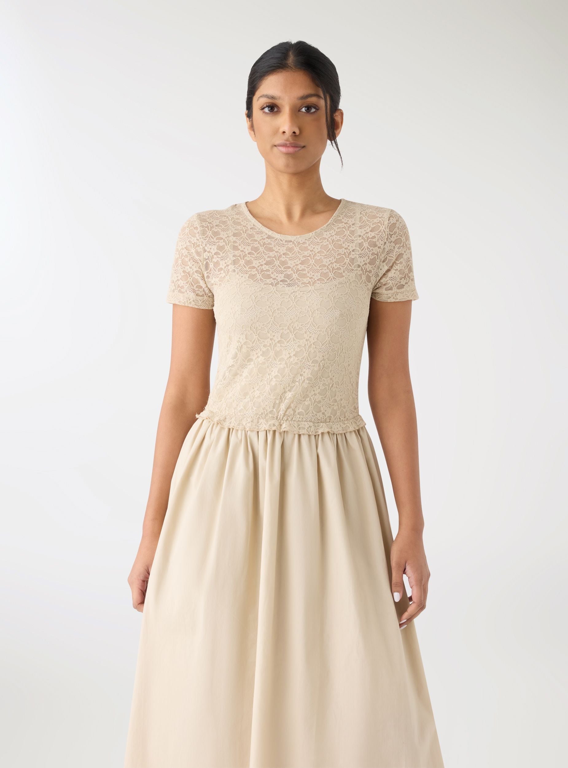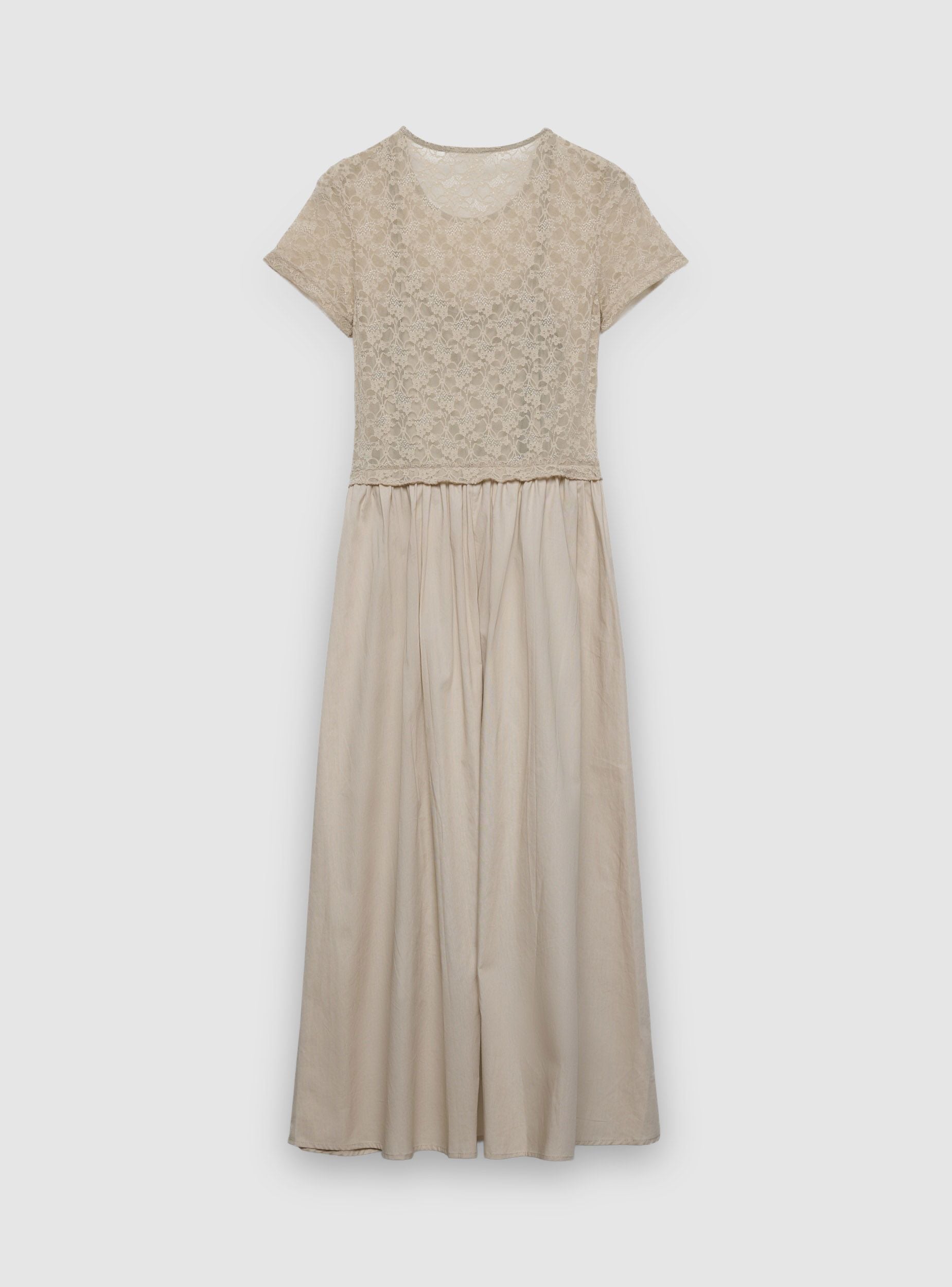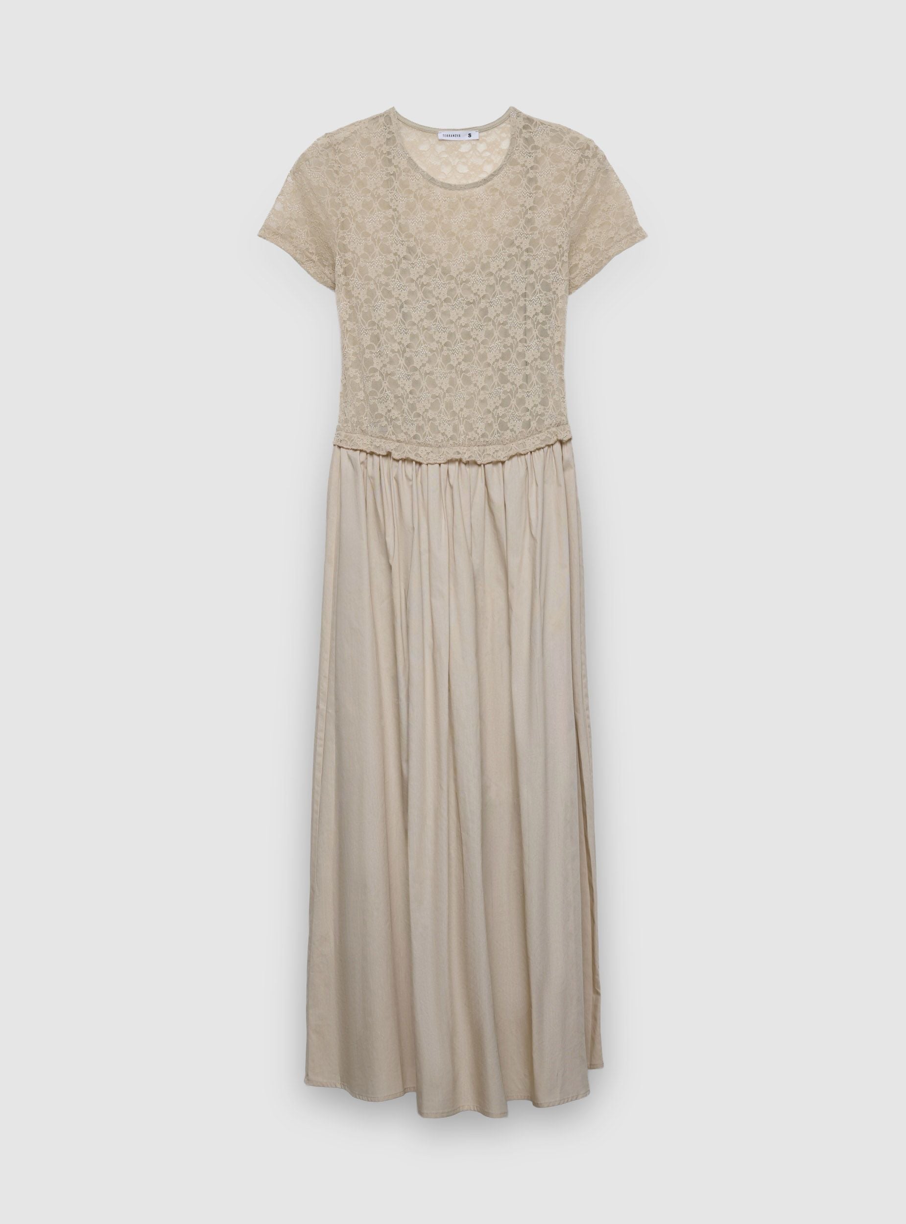 Abito da donna lungo a fantasia tinta unita con corpino in pizzo e gonna fluida. Collo tondo e maniche corte valorizzano la linea, mentre la vita segnata ed elasticizzata crea una vestibilità femminile. Perfetto per cerimonie, serate o eventi speciali, si abbina a sandali con tacco o a una giacca leggera. Ideale per un look romantico e versatile per molte occasioni.Dettagli
