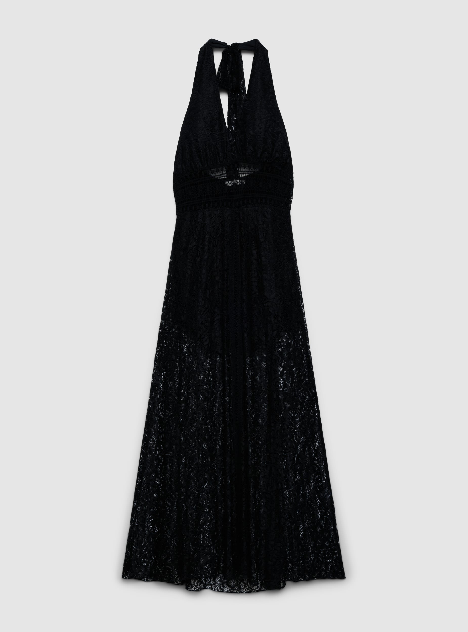 Abito da donna lungo in pizzo con scollo profondo all’americana e laccetto da annodare dietro al collo. Il busto è sagomato con fascia in vita e inserti traforati che valorizzano la silhouette, mentre la gonna scende morbida fino al fondo. Ideale per cerimonie e serate, da abbinare a sandali e clutch per un look elegante.Dettagli