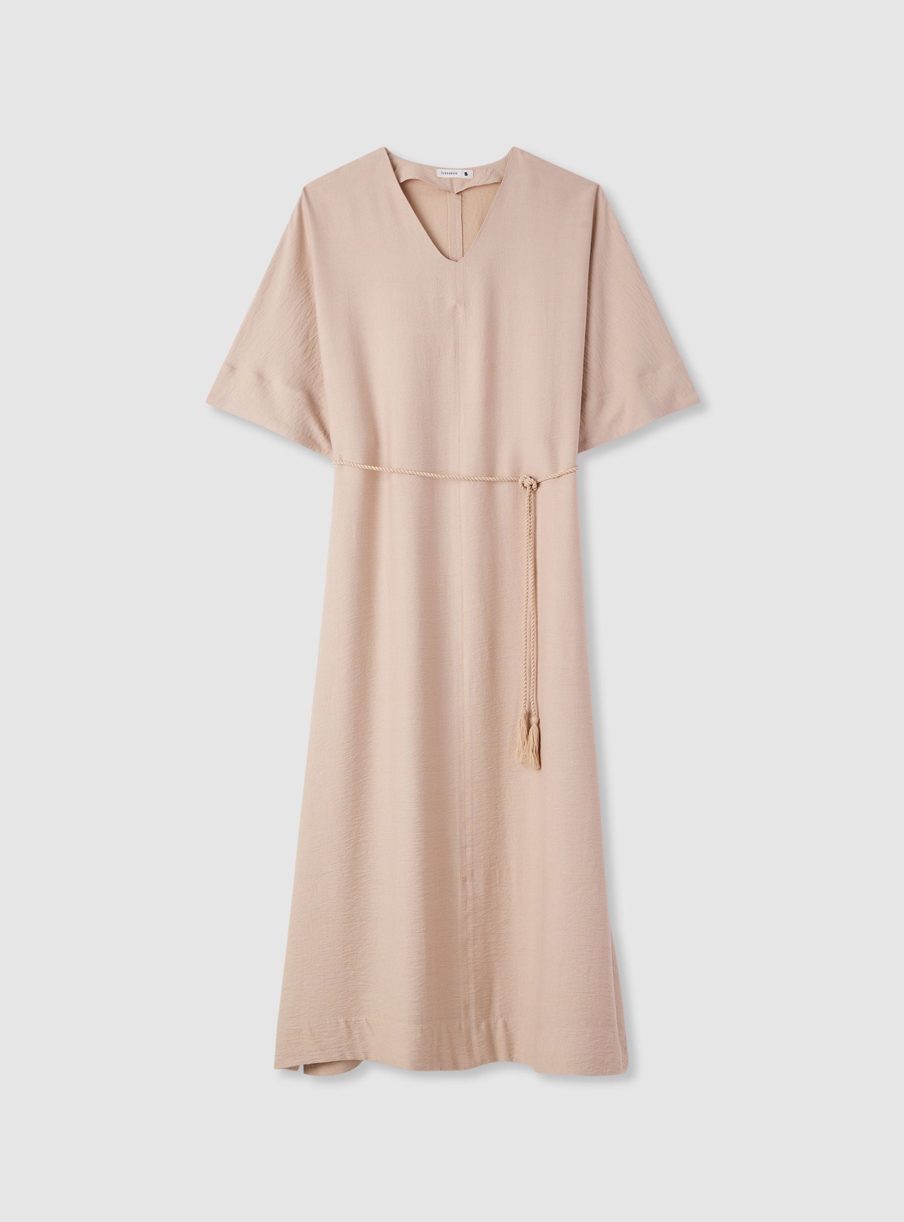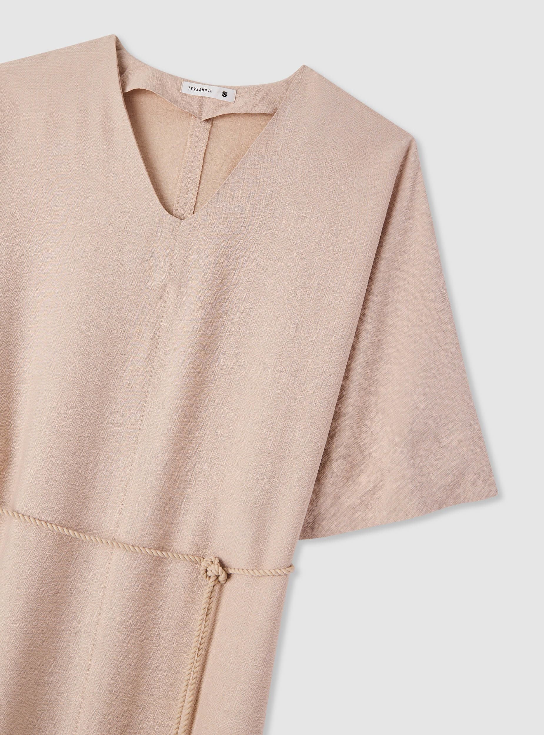 Abito da donna a tinta unita con scollo a V e maniche corte, caratterizzato da cintura in corda con nappine che valorizza il punto vita. La linea è morbida e lunga, ideale per look quotidiani o per il tempo libero con sandali flat, ma anche con zeppe e una borsa a tracolla per uscite serali.Dettagli