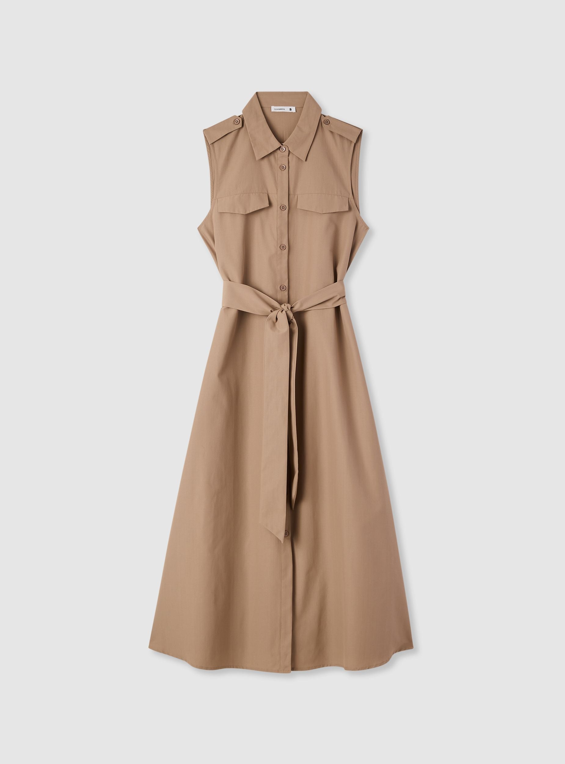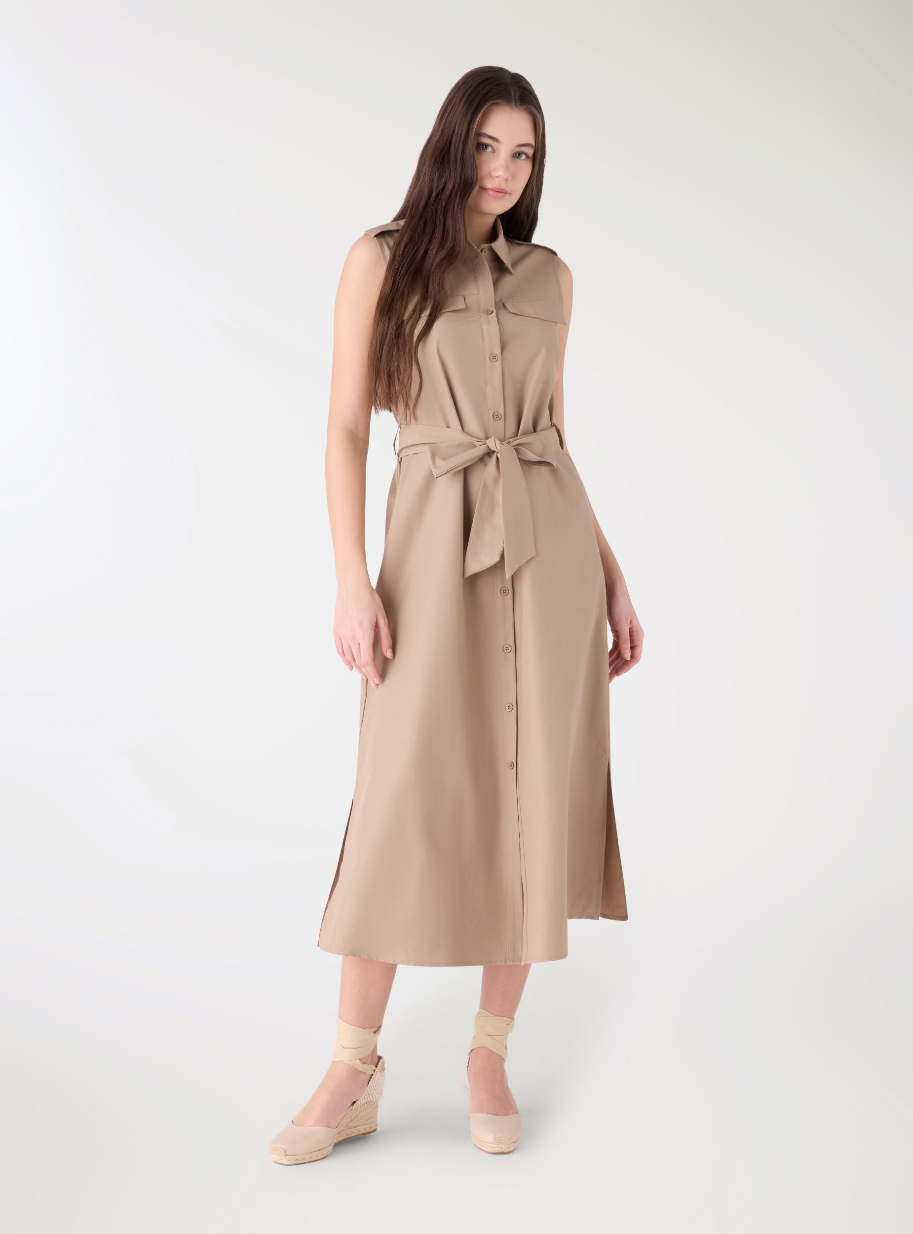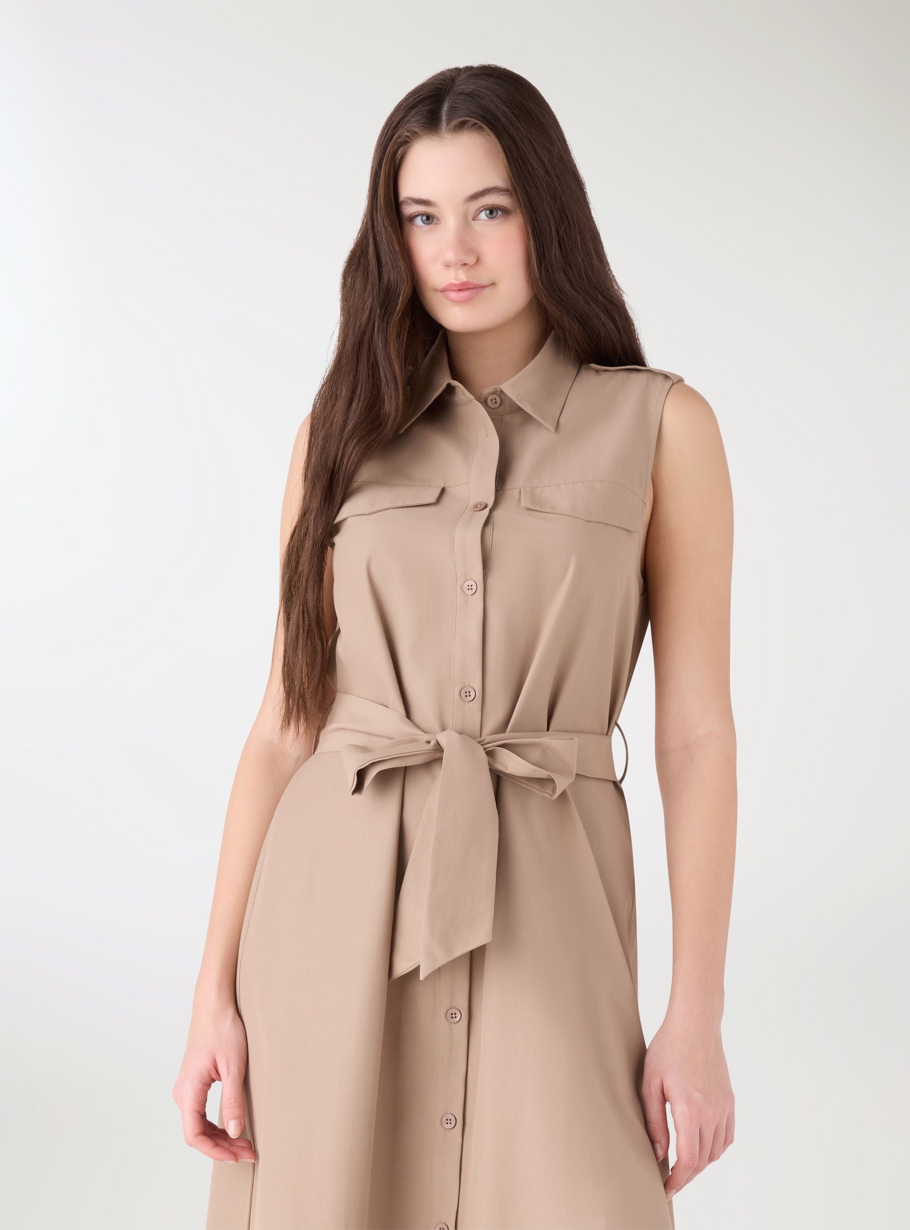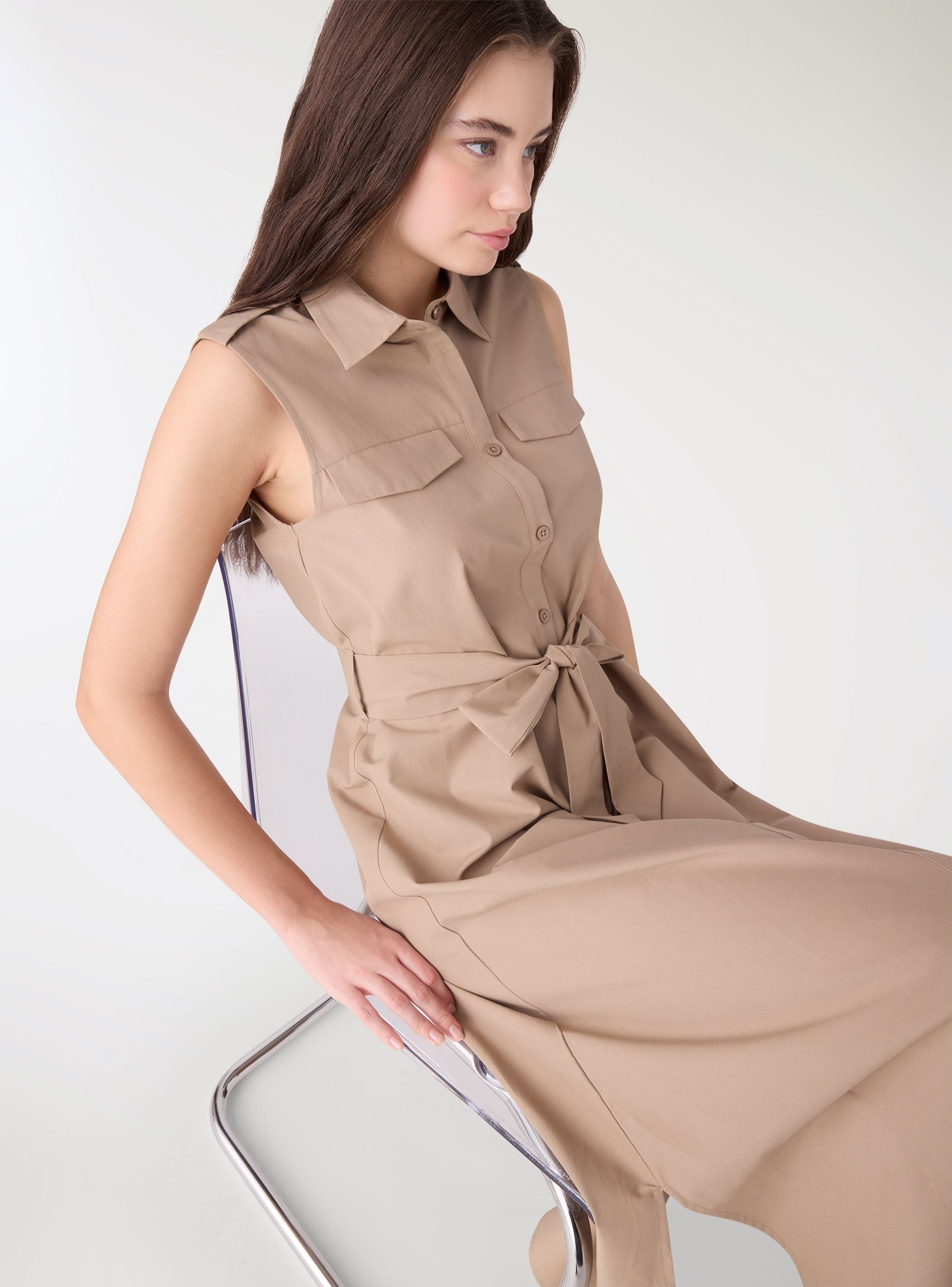 Abito da donna tinta unita in stile chemisier, con collo a camicia e chiusura frontale con bottoni. Il taglio lungo valorizza la silhouette grazie alla cintura da annodare in vita. Presenta tasche applicate con patta sul petto e spalline con bottoni per un tocco utility. Perfetto con sandali o sneakers per look da giorno e city outfit.Dettagli