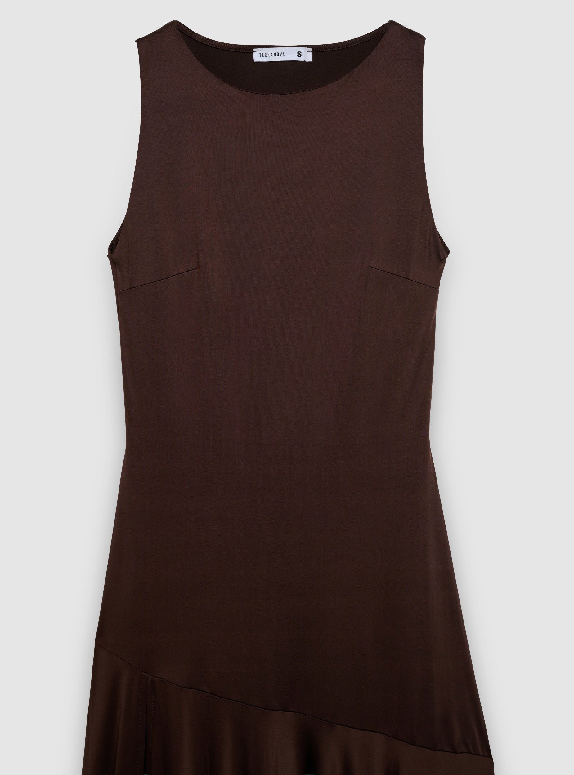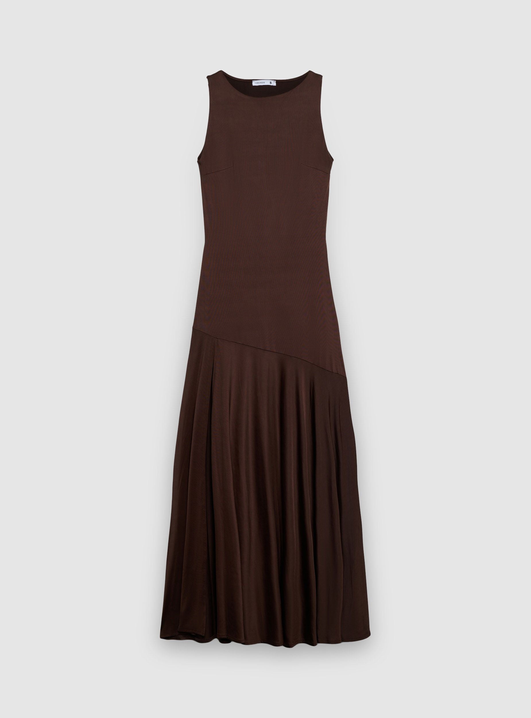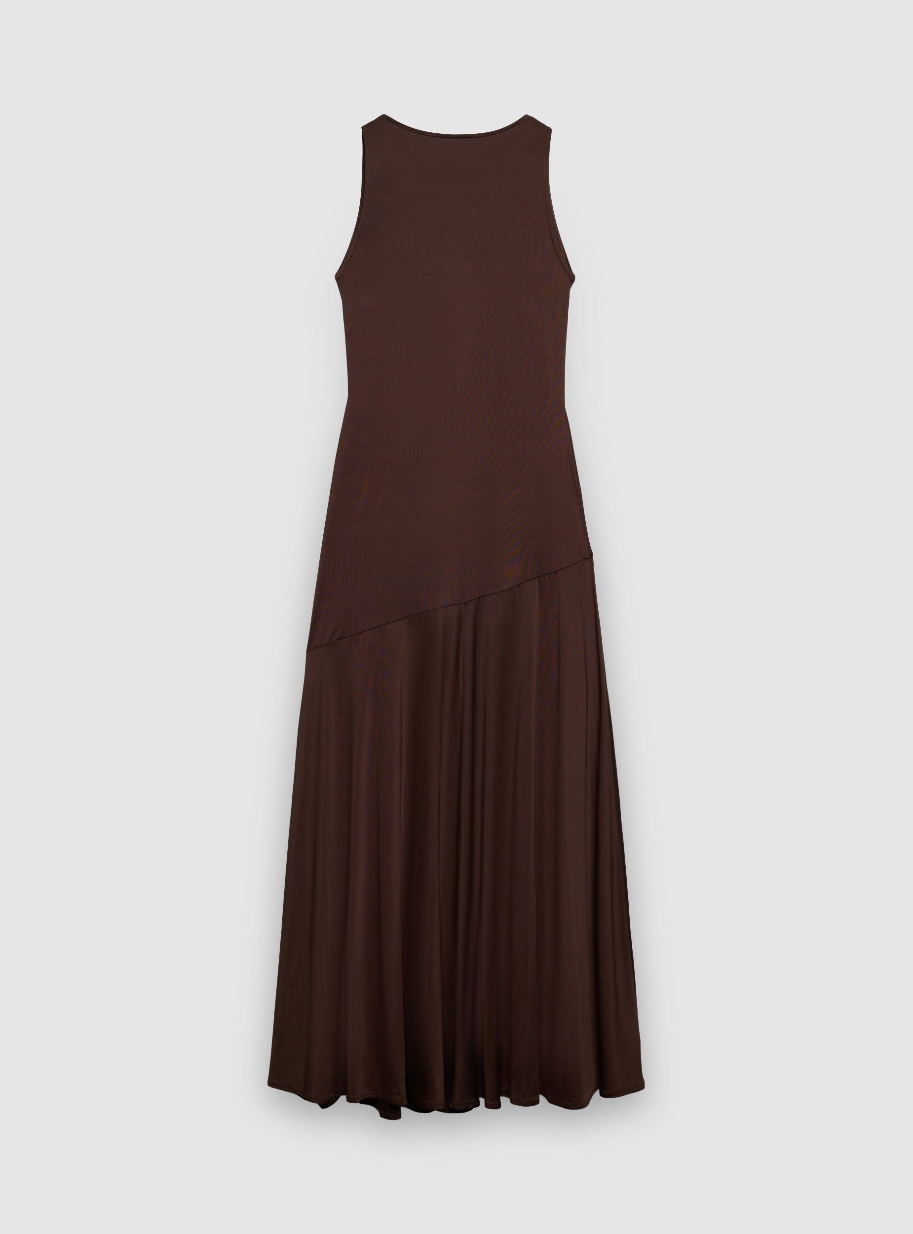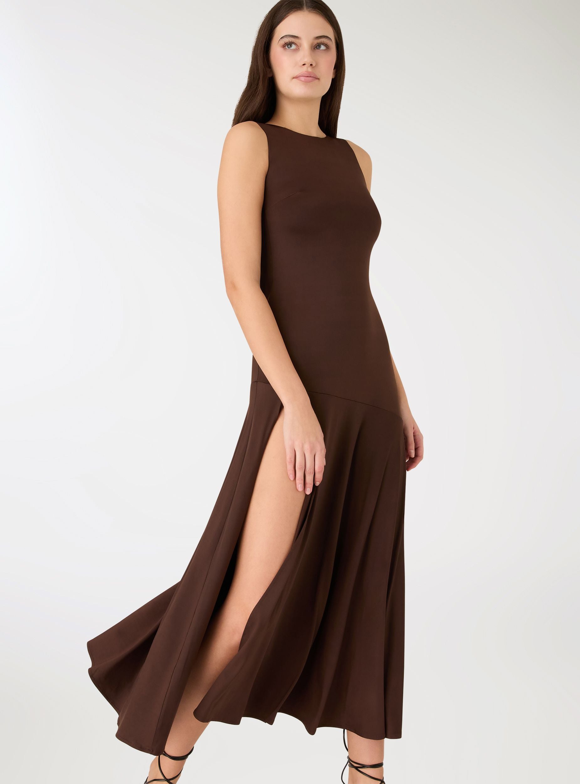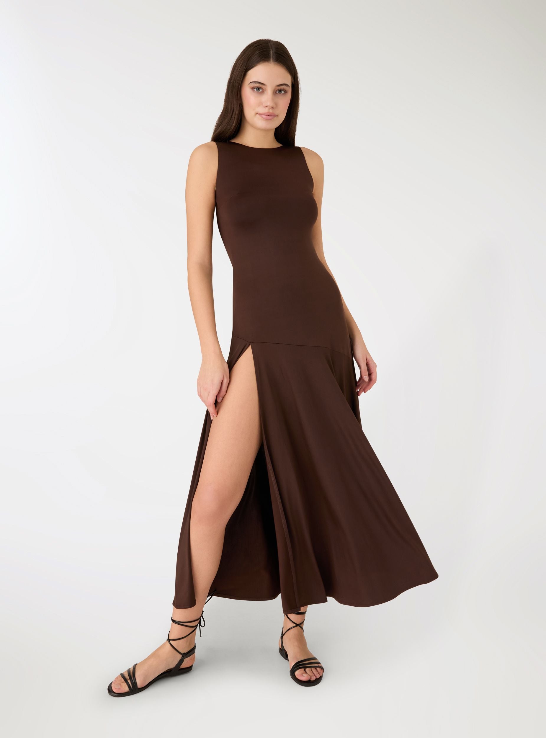 Abito da donna lungo a tinta unita con linea svasata e taglio asimmetrico in vita che valorizza la figura. Modello senza maniche con scollo tondo, perfetto per serate ed eventi eleganti. Il corpino segue il busto, mentre la gonna ampia dona movimento. Da abbinare a sandali alti e clutch per un look raffinato, oppure a blazer per un tocco formale.Dettagli
