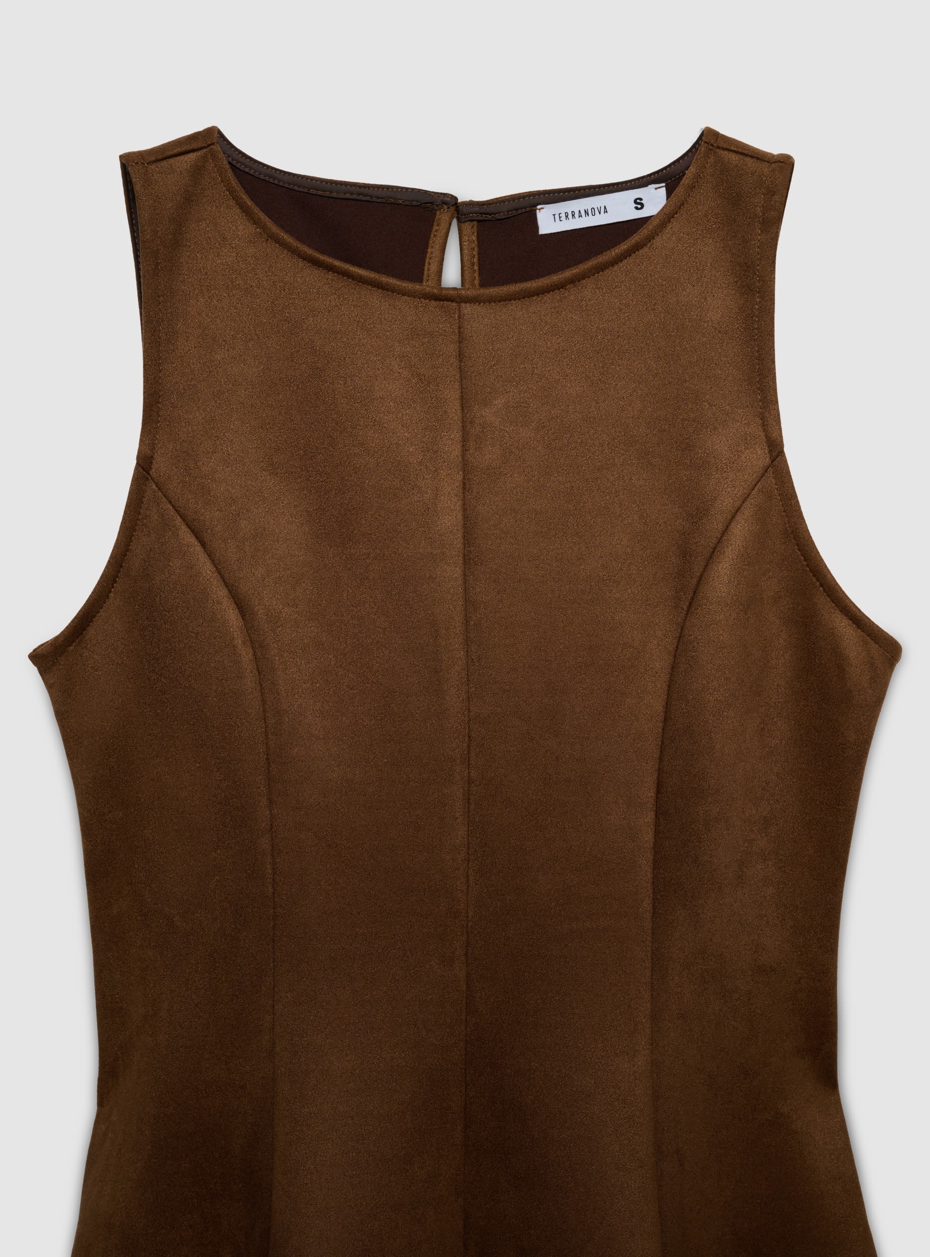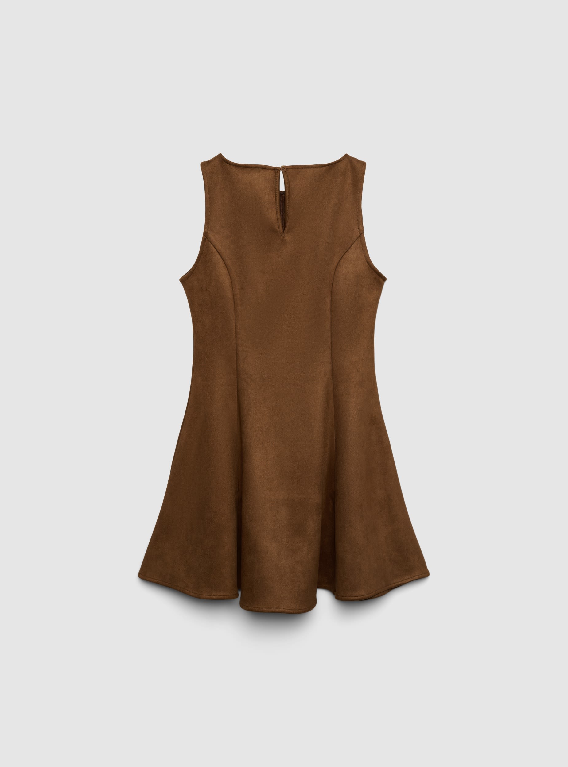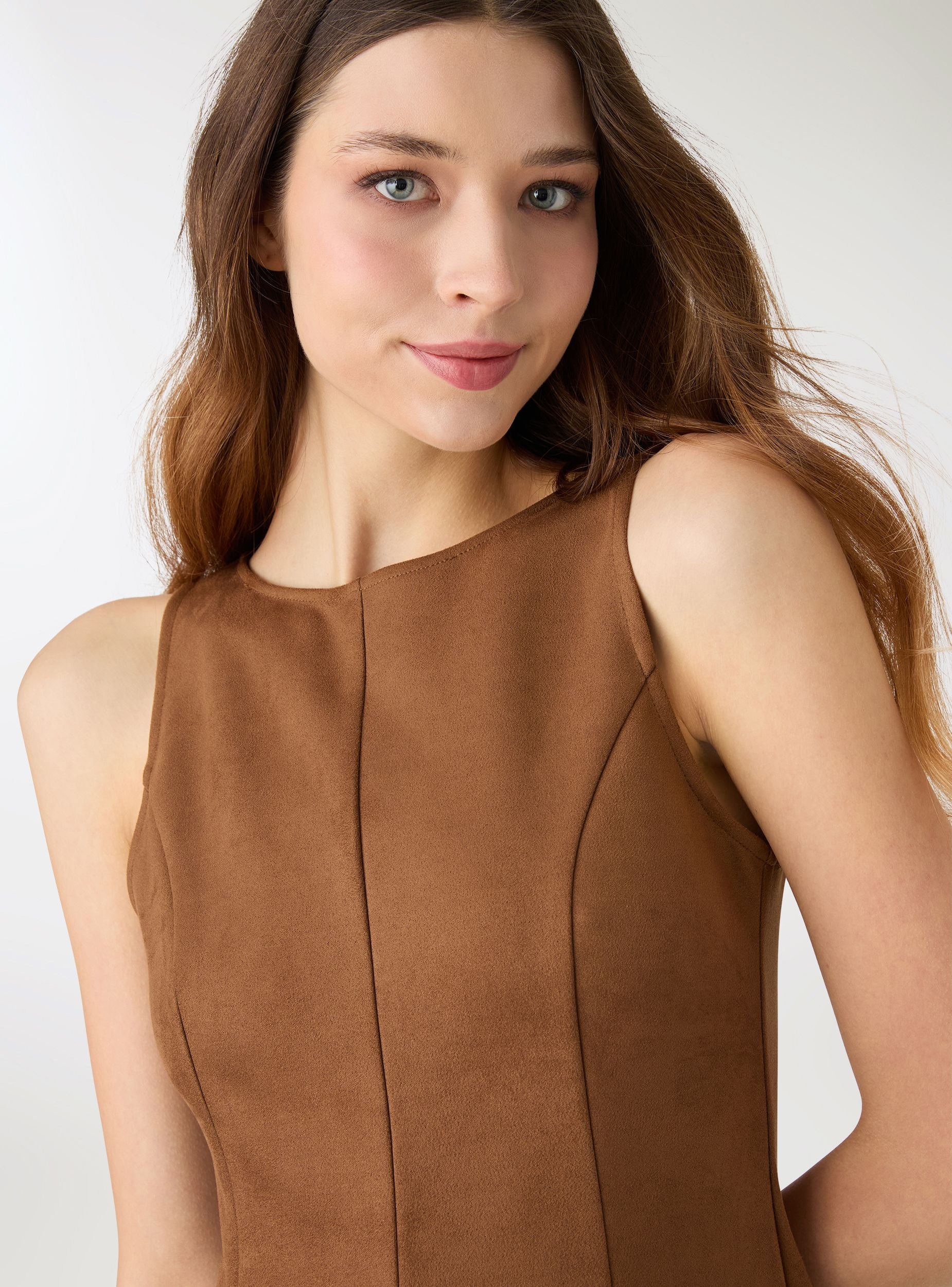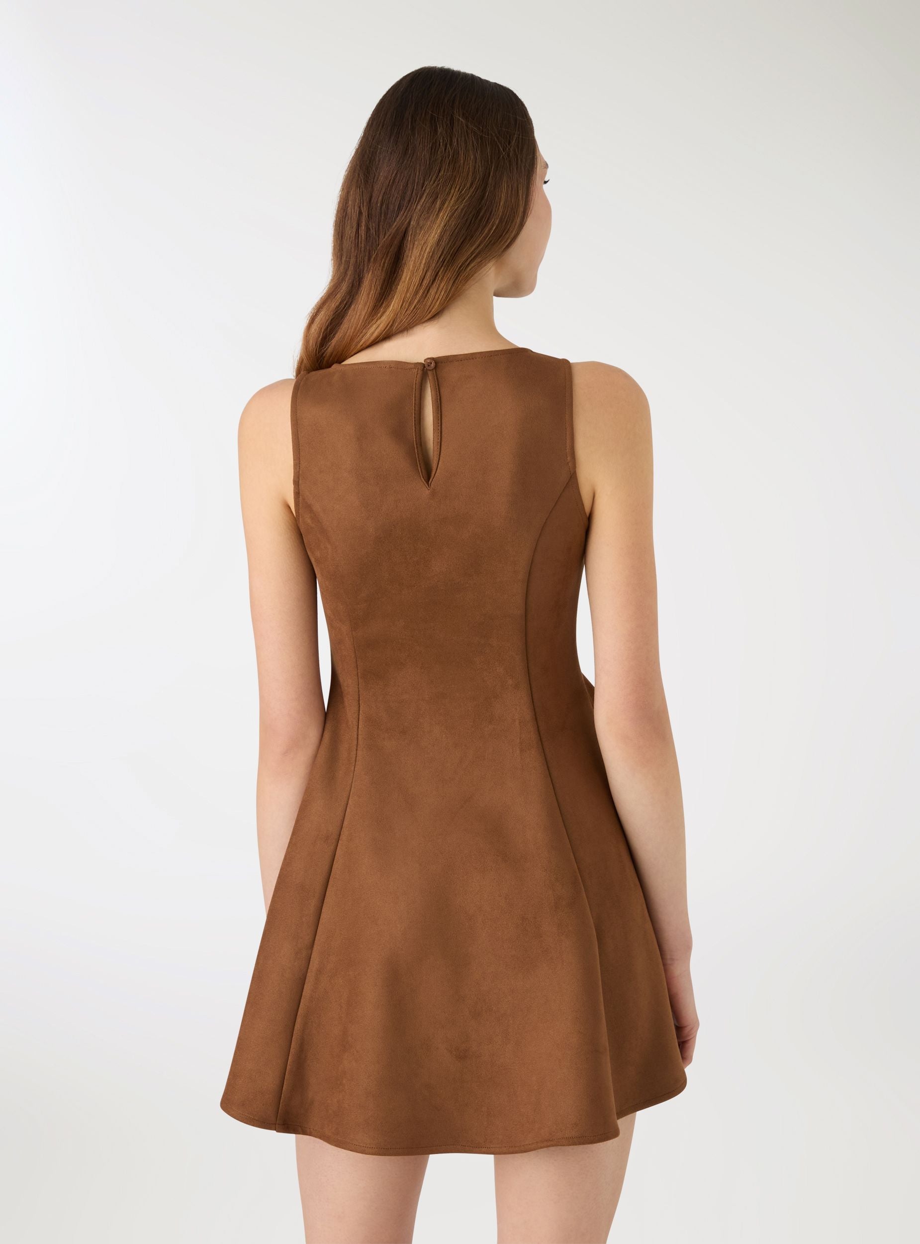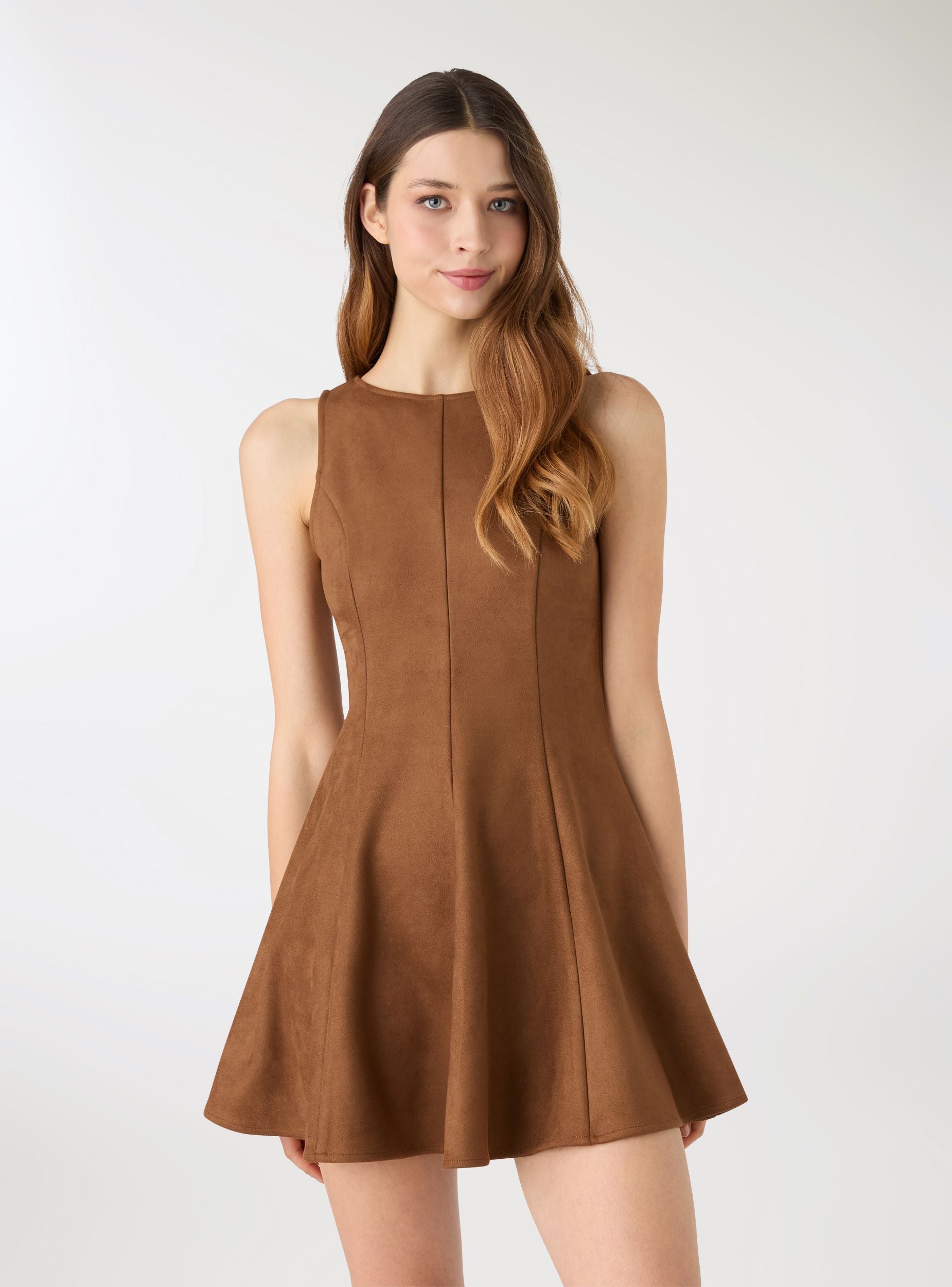 Abito da donna svasato a tinta unita, ideale per look versatili dal giorno alla sera. Modello senza maniche con scollo rotondo e linea godet che valorizza la silhouette offrendo movimento. Chiusura posteriore con piccolo bottone. Perfetto con stivaletti e giacca corta per un outfit urban, oppure con sandali e accessori per occasioni più eleganti. Tessuto morbido effetto dainetto.Dettagli