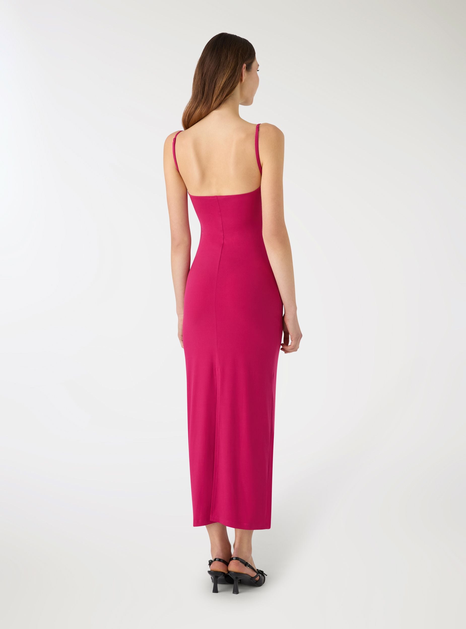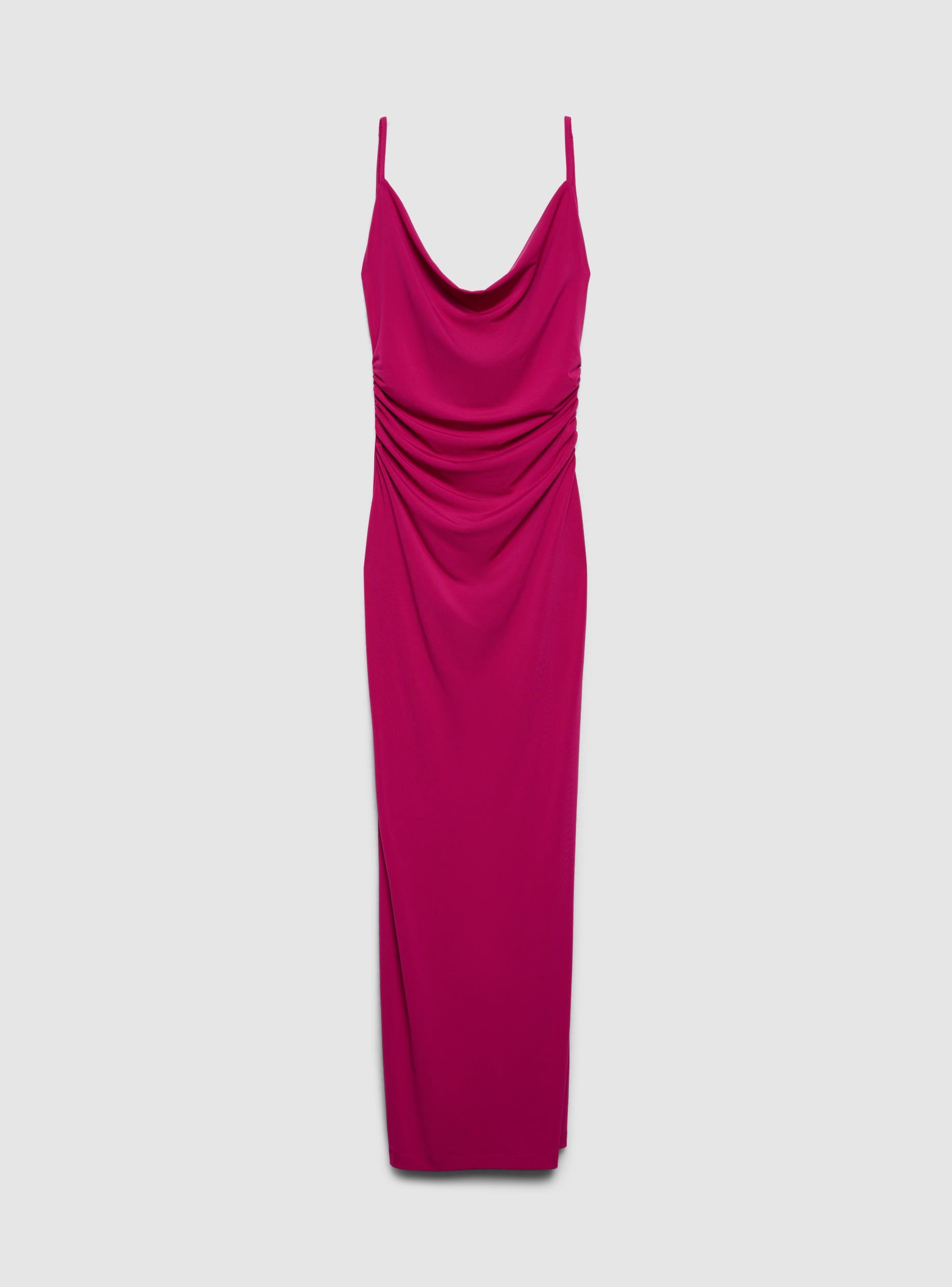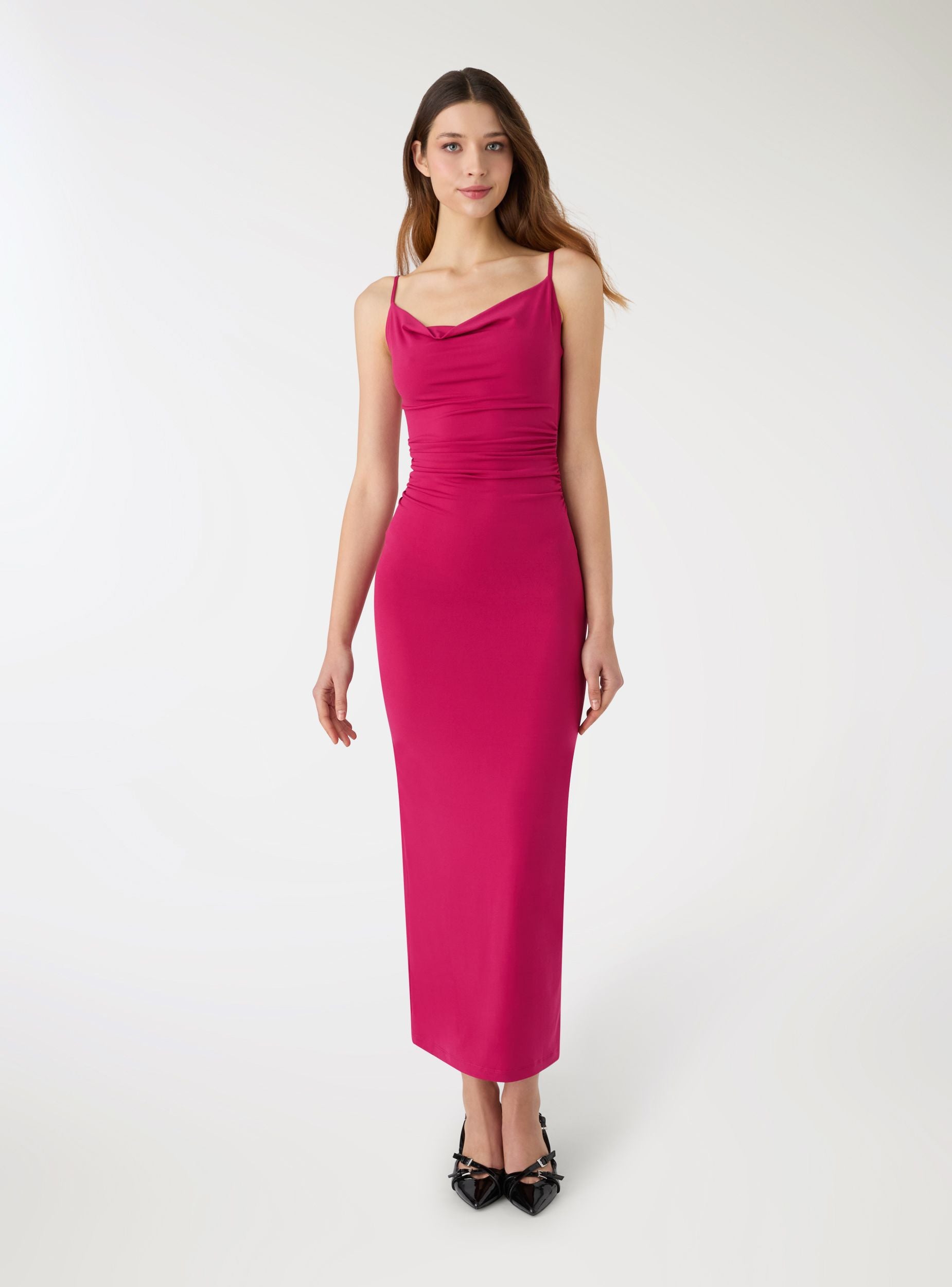 Abito da donna lungo a tinta unita con scollo morbido drappeggiato e spalline sottili regolabili. La linea segue la figura con arricciature sui fianchi che valorizzano le forme, mentre lo spacco posteriore facilita il movimento. Perfetto per serate, eventi o cene eleganti, si abbina a sandali alti e mini borse, oppure a un blazer leggero per un look più formale.Dettagli