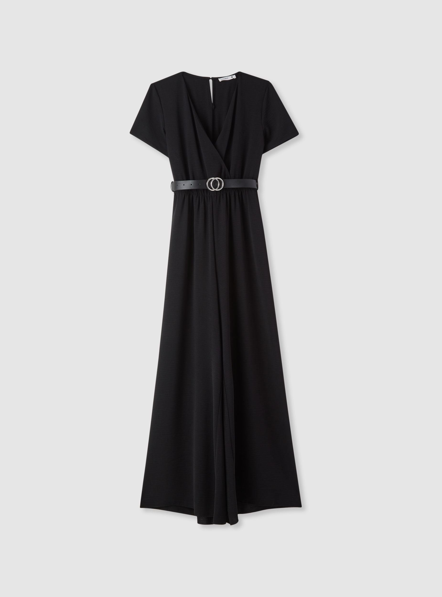Abito da donna a tinta unita con scollo incrociato e maniche corte. La vita è evidenziata da una cintura con fibbia a doppio anello e arricciatura che valorizza la silhouette. Gonna svasata per un movimento fluido. Perfetto per occasioni eleganti o serate, si abbina a sandali con tacco e clutch per un look raffinato.Dettagli