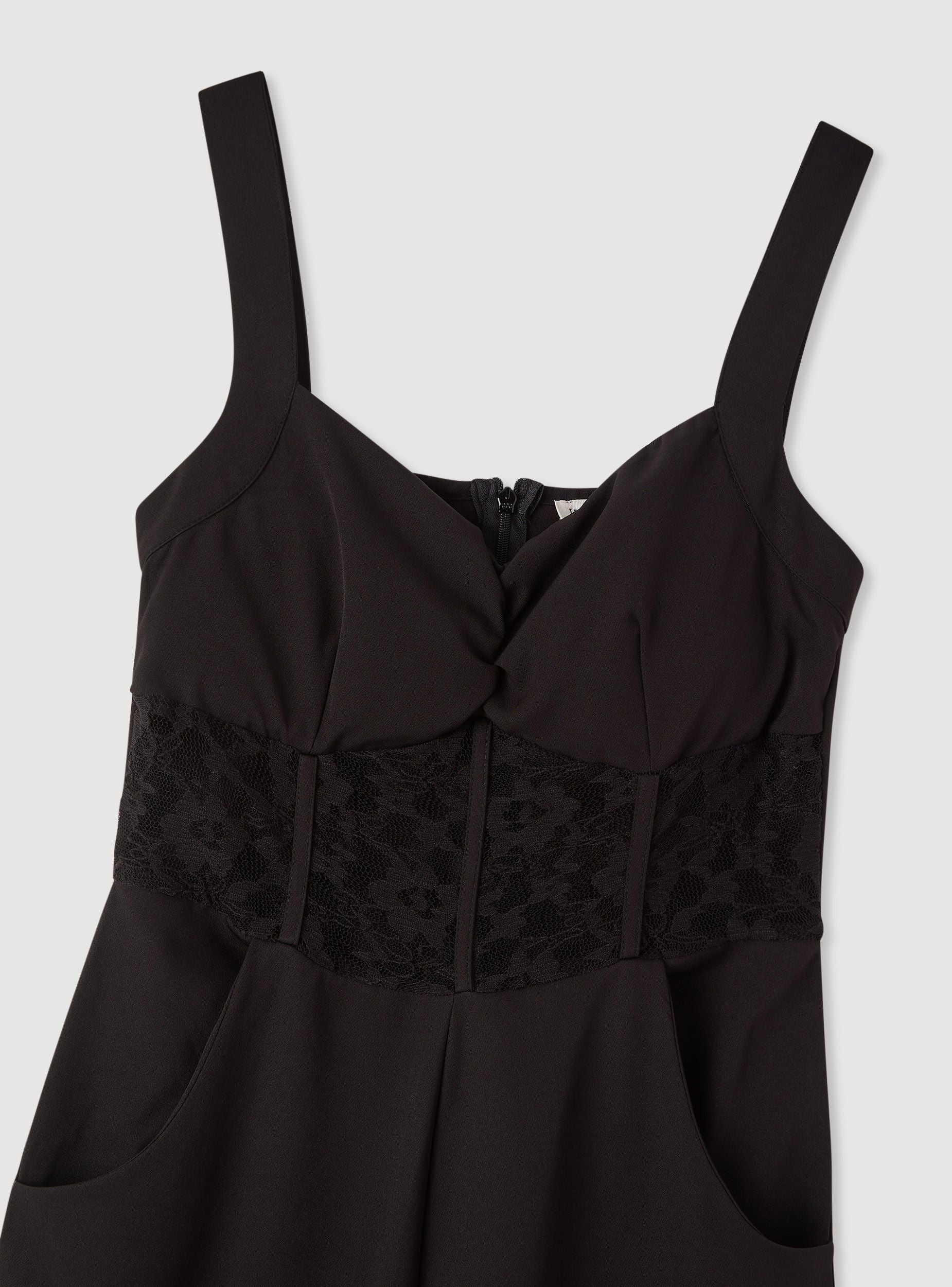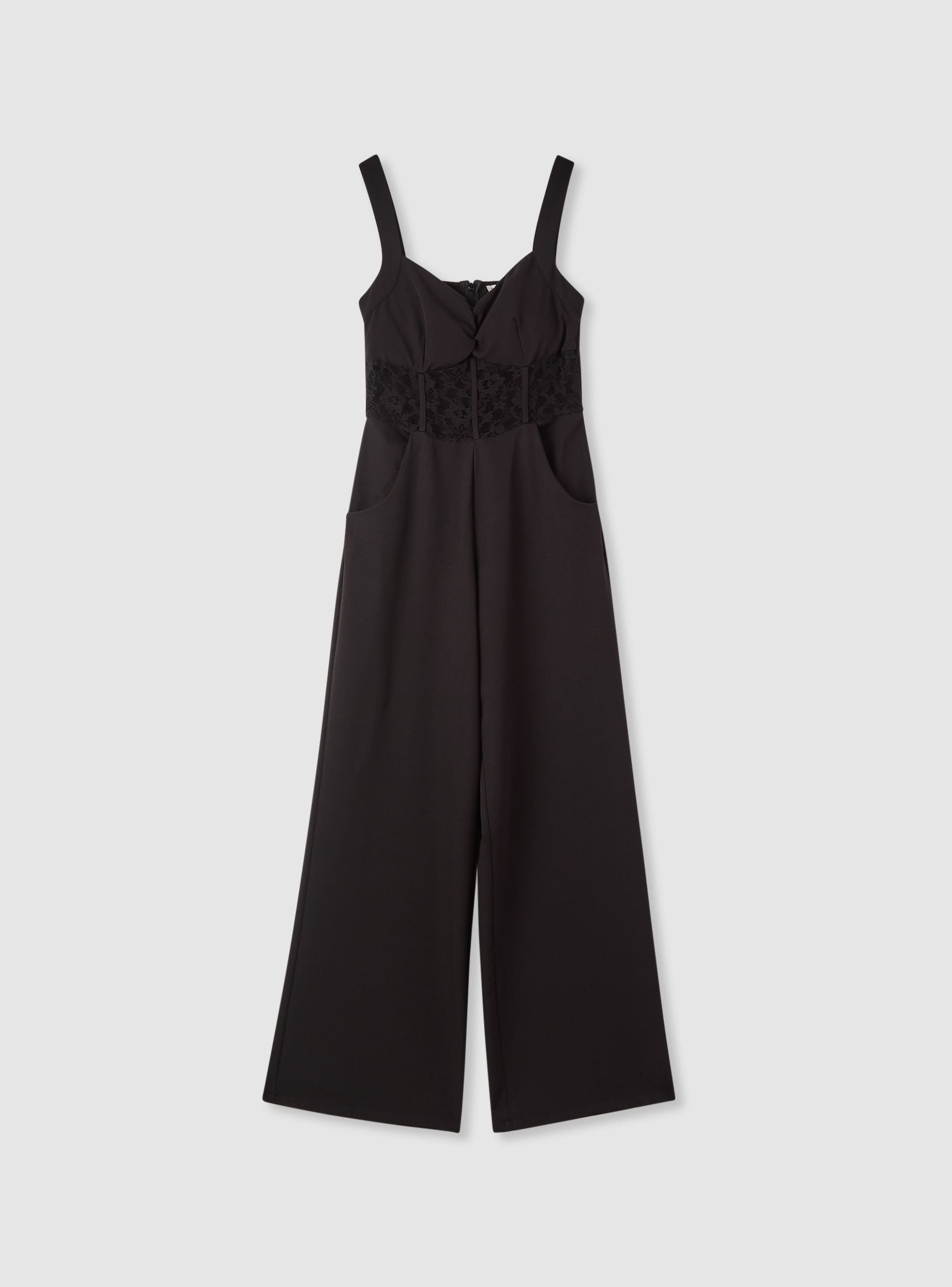 Tuta da donna a tinta unita con spalline larghe e bustino effetto corsetto in pizzo, ideale per serate e occasioni eleganti. La chiusura posteriore è con zip e la scollatura è a cuore leggermente arricciata. La gamba è ampia e lunga, con tasche laterali per maggiore funzionalità. Facile da abbinare a sandali con tacco e blazer per un look raffinato.Dettagli