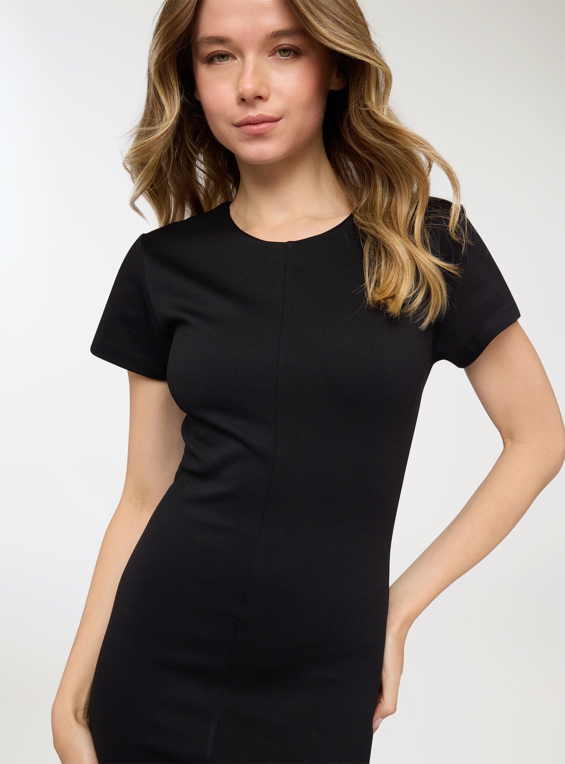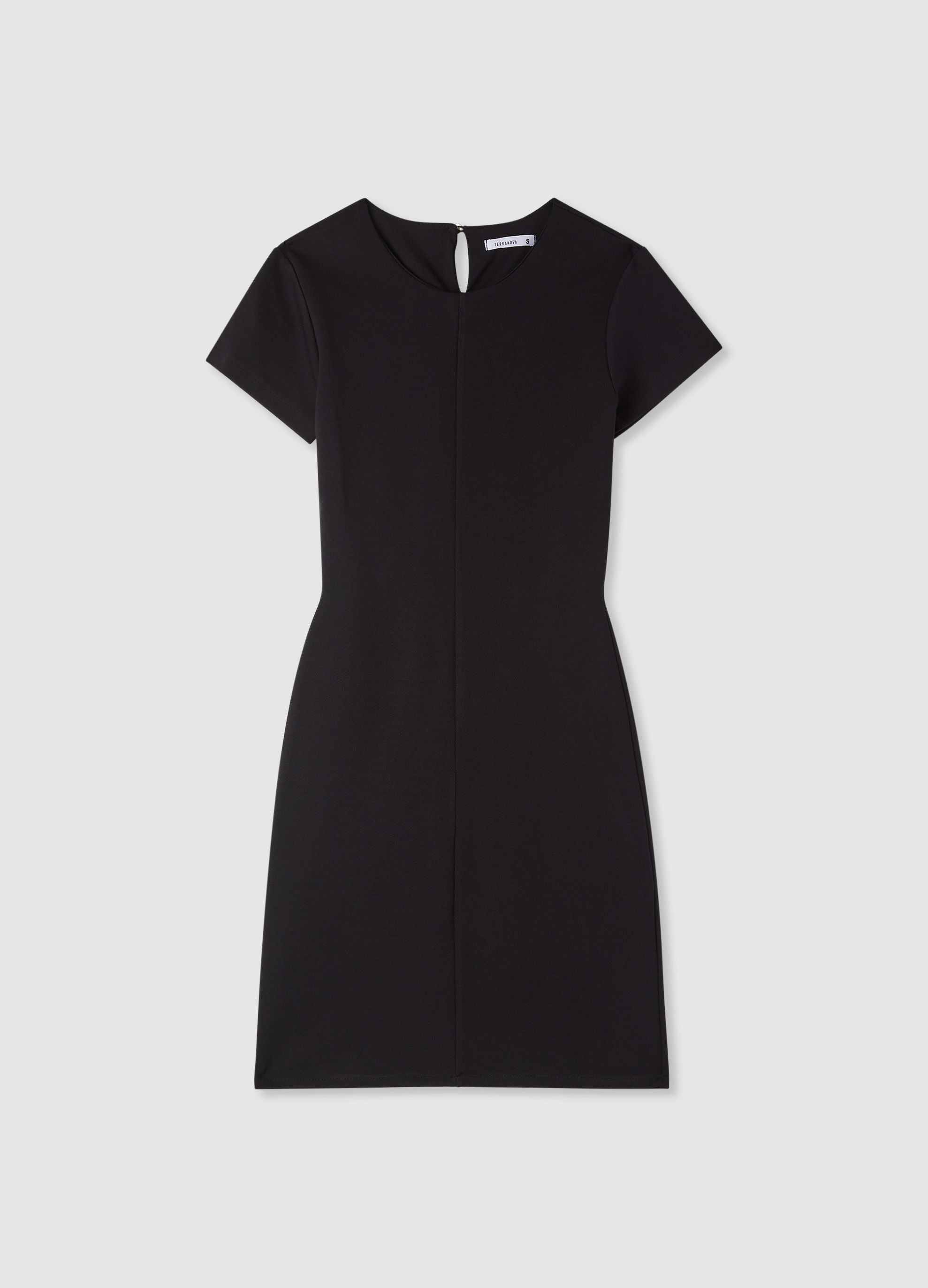 Abito da donna in tinta unita con linea dritta e vestibilità regular. Presenta girocollo, maniche corte e dettaglio di apertura posteriore con bottone. Lunghezza sopra il ginocchio, ideale per l’ufficio o il tempo libero. Facile da abbinare a blazer e décolleté per un look formale, oppure a cardigan e stivali per occasioni casual.Dettagli