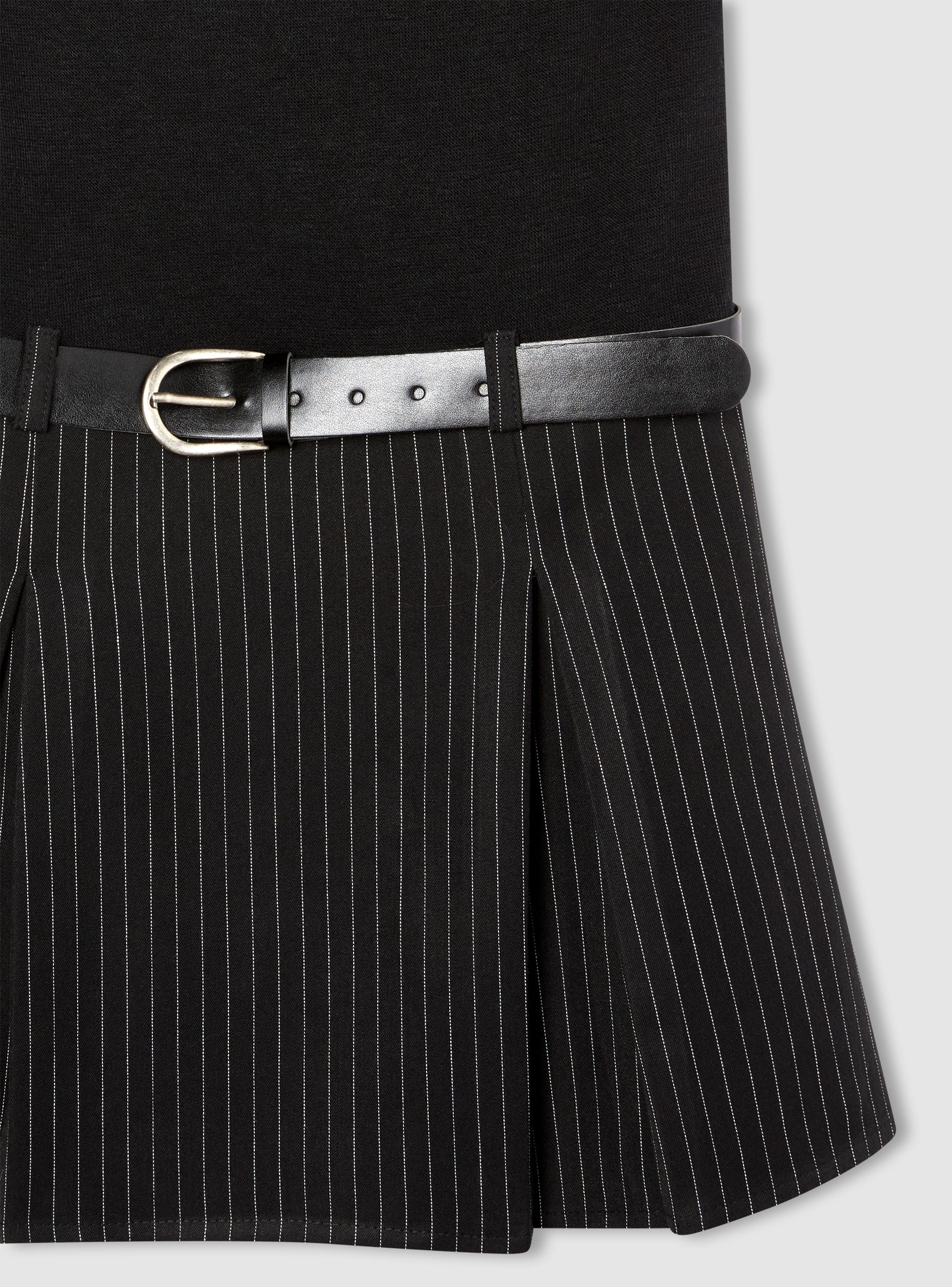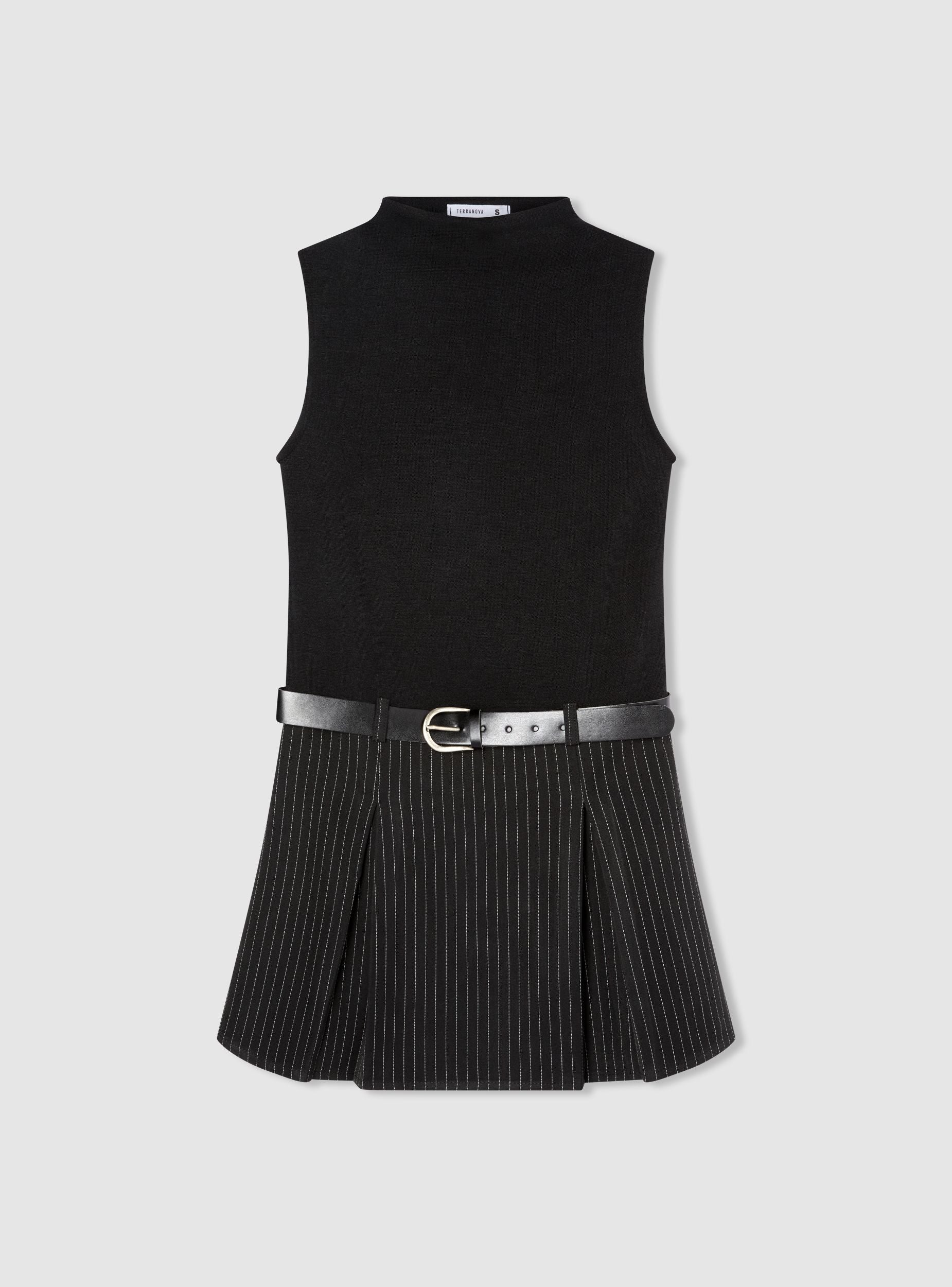 Abito da donna smanicato a tinta unita nella parte superiore, con collo alto e gonna mini a righe sottili. La gonna presenta pieghe ampie e cintura per definire il punto vita. Perfetto per l'ufficio, o uscite con amici, si abbina a stivali o scarpe stringate e a un blazer. Vestibilità regolare, chiusura senza zip, design moderno e femminile.Dettagli