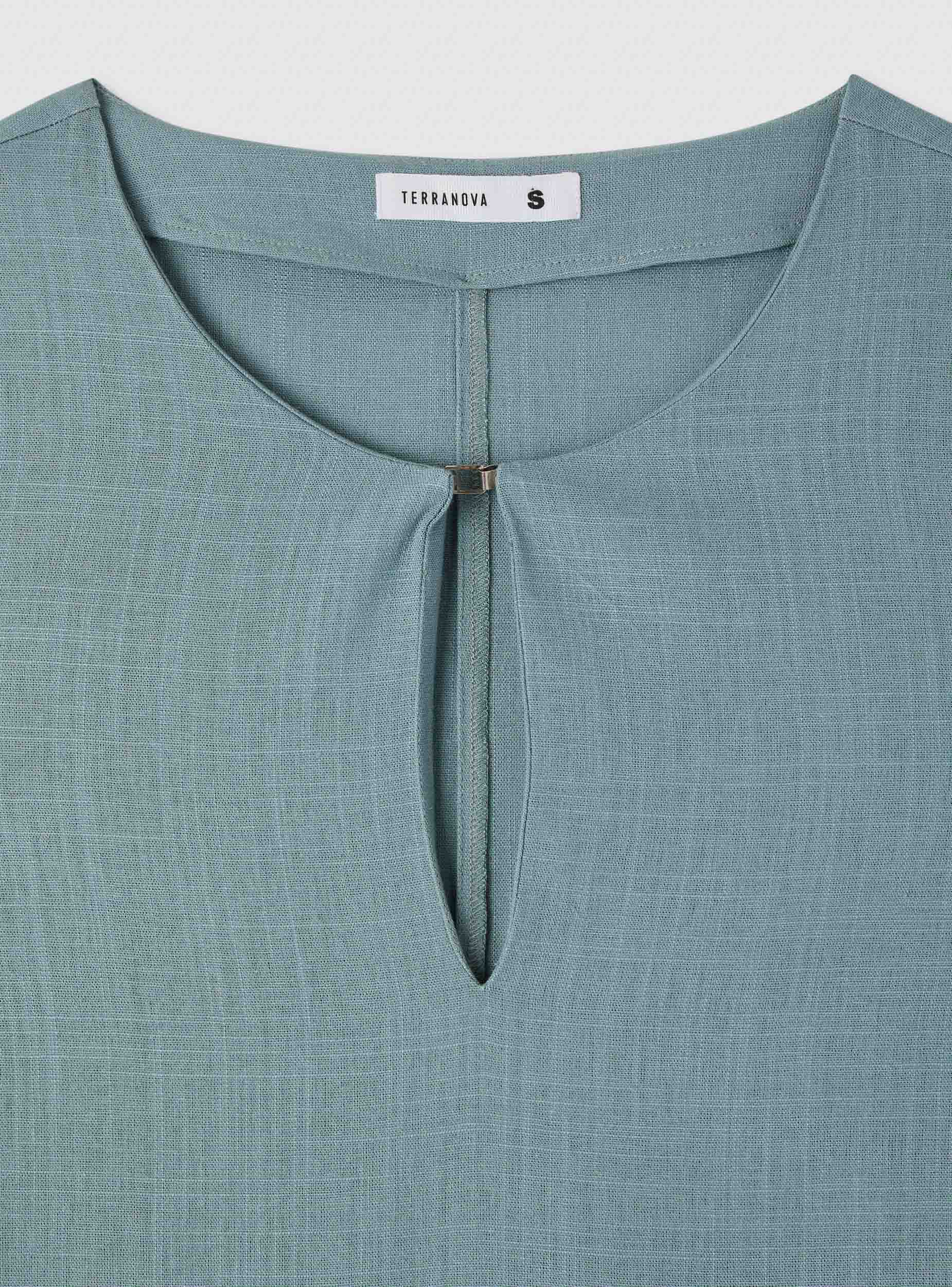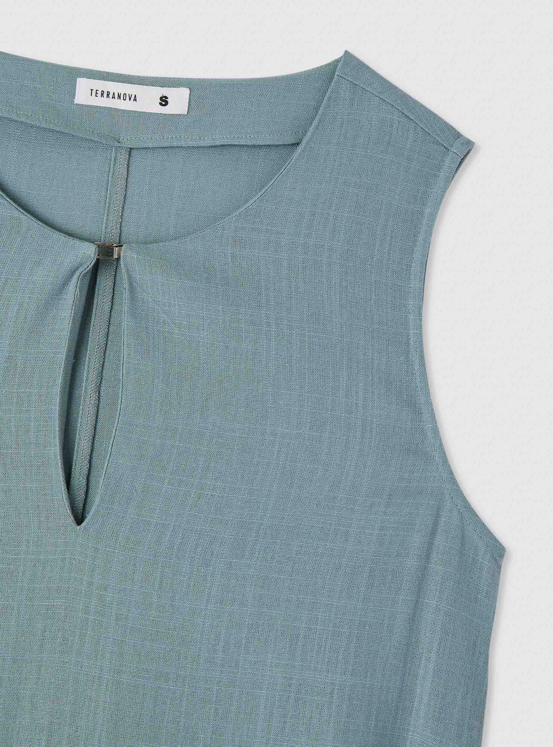 Abito da donna a tinta unita, lungo e senza maniche, con scollo rotondo impreziosito da apertura a goccia con piccolo dettaglio metallico. Linea fluida e confortevole, ideale per giornate estive o serate informali. Si abbina a sandali bassi o zeppe e una borsa a tracolla per un look curato. Tessuto effetto lino.Dettagli