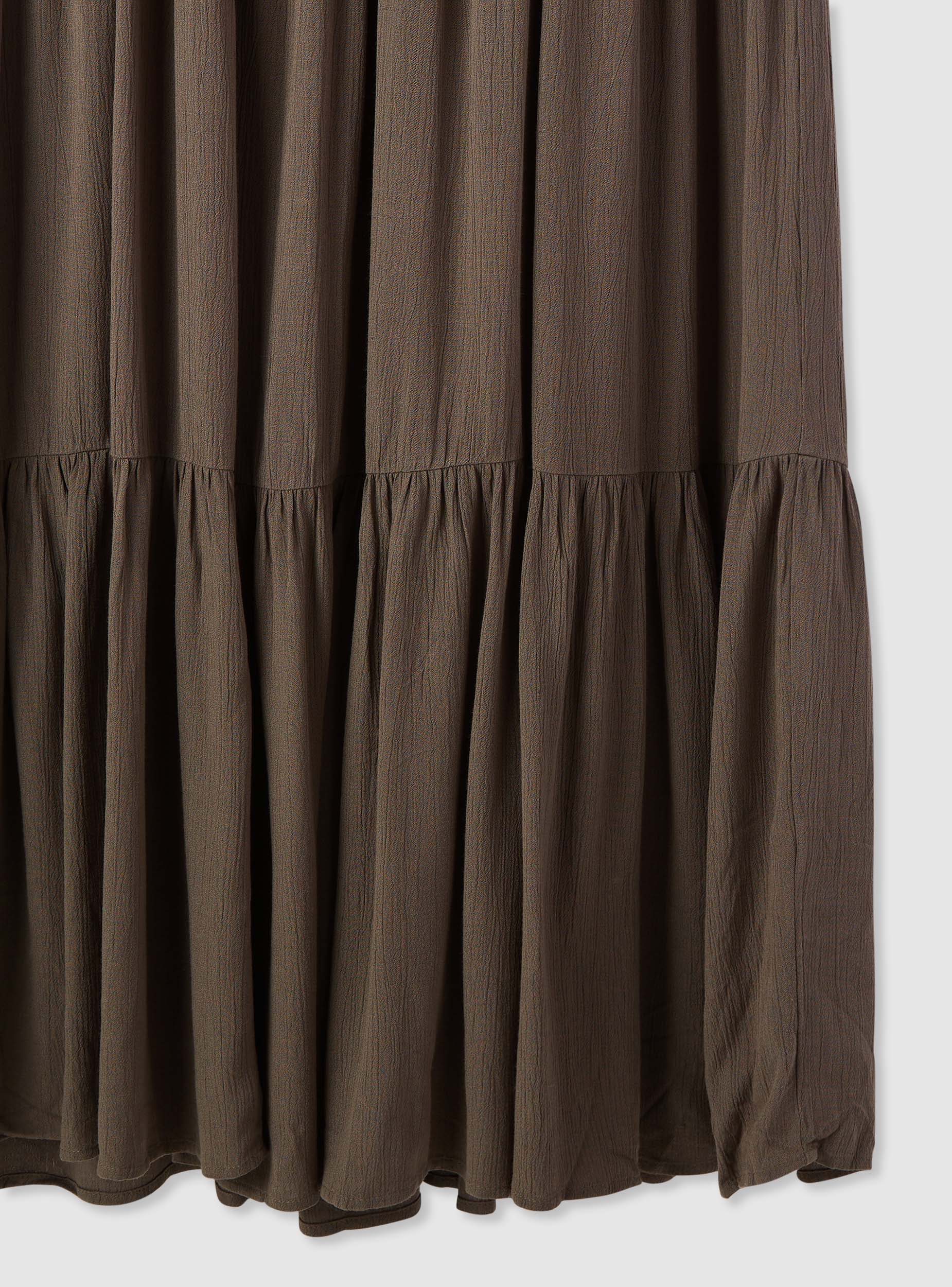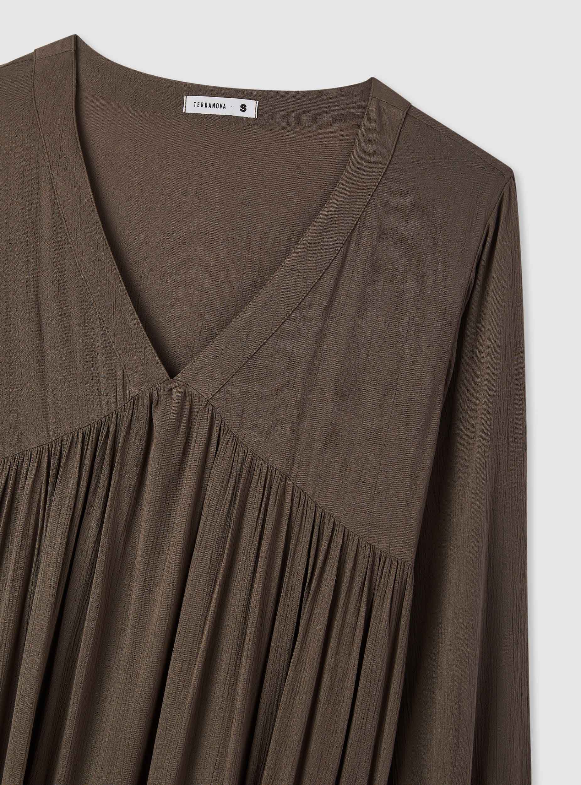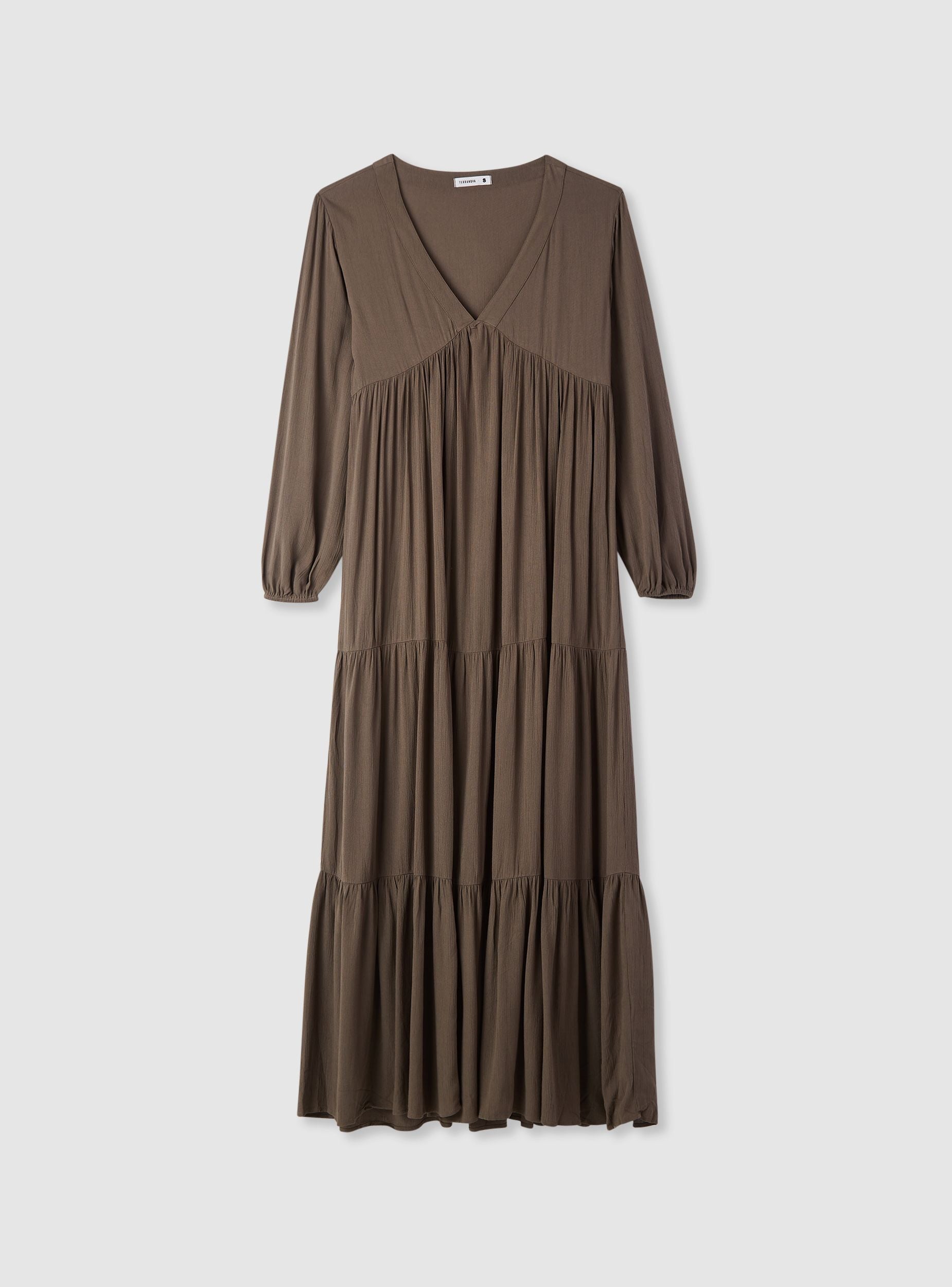 Abito da donna in tinta unita con linea morbida e balze che donano movimento. Scollo a V, maniche lunghe con polsino elasticizzato, ideale per look femminili da giorno. Perfetto con sandali o stivaletti e una cintura in vita per definire la vestibilità. Facile da abbinare per occasioni casual o uscite serali grazie al design fluido e versatile.Dettagli