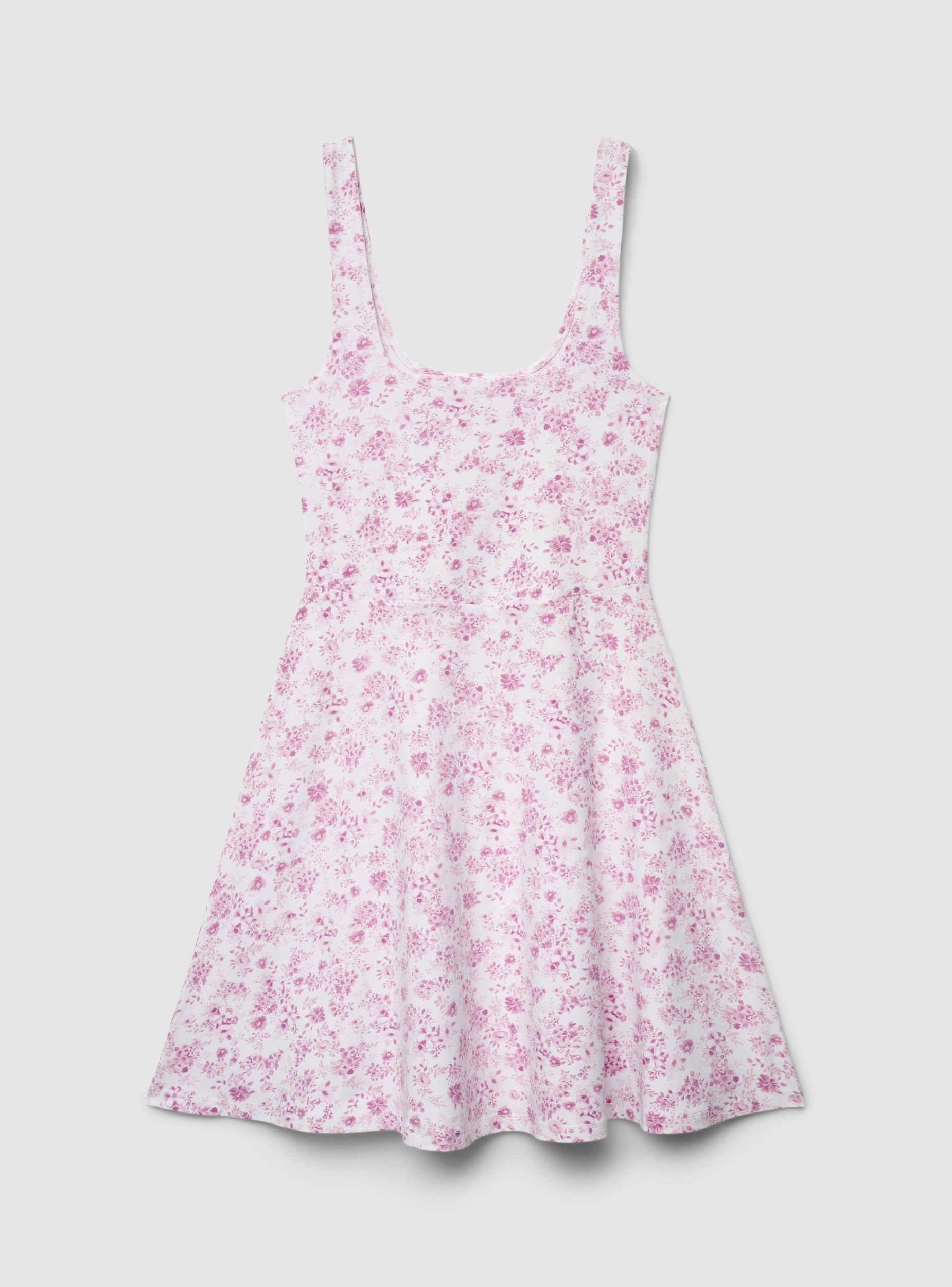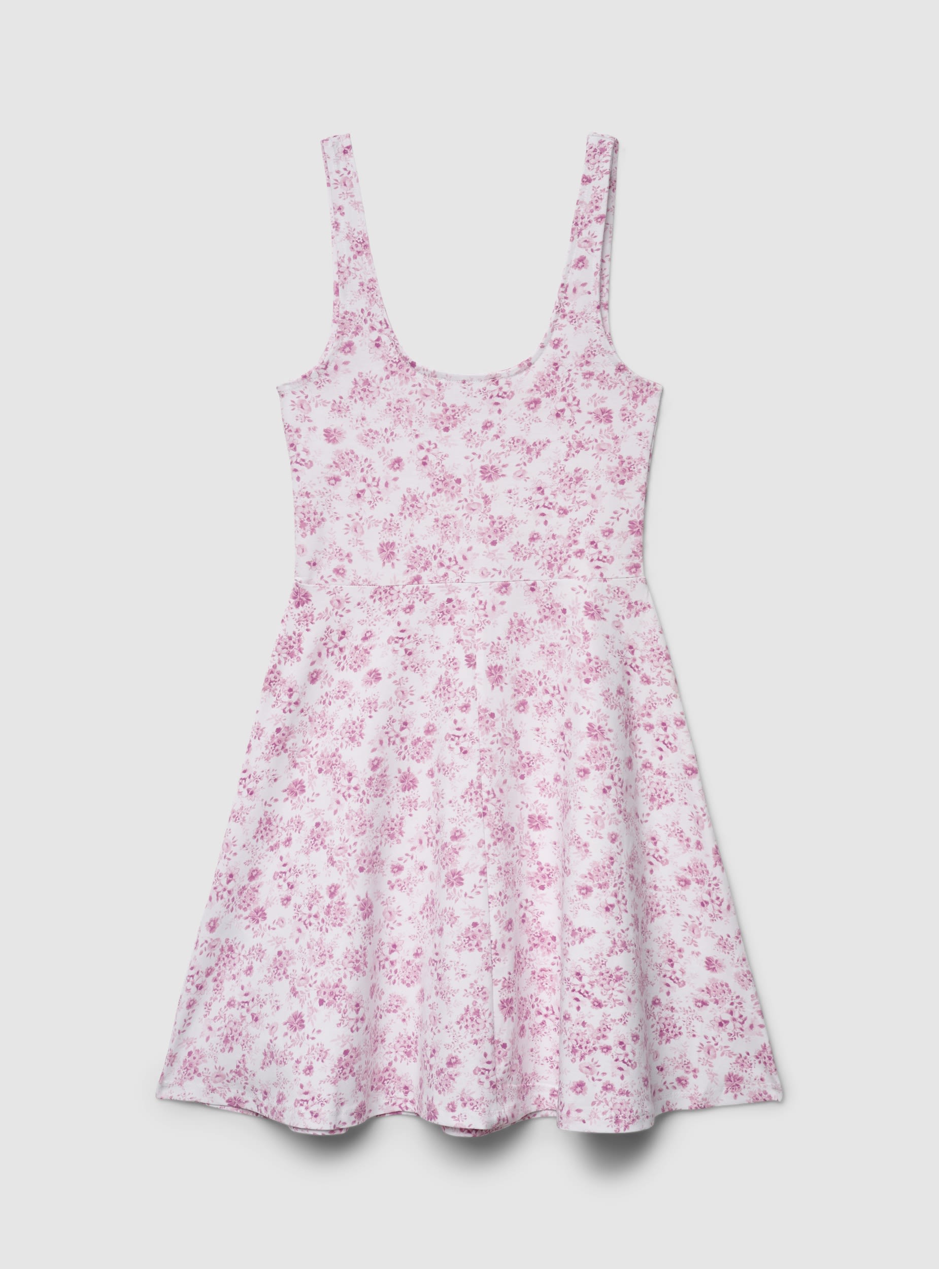 Abito da donna con stampa floreale e linea skater, pensato per look da giorno e uscite informali. Presenta scollo tondo ampio e spalline larghe, corpetto aderente con taglio in vita e gonna svasata che accompagna i movimenti. Modello senza maniche e senza chiusura visibile, facile da abbinare a sneakers, sandali o giacche leggere.Dettagli