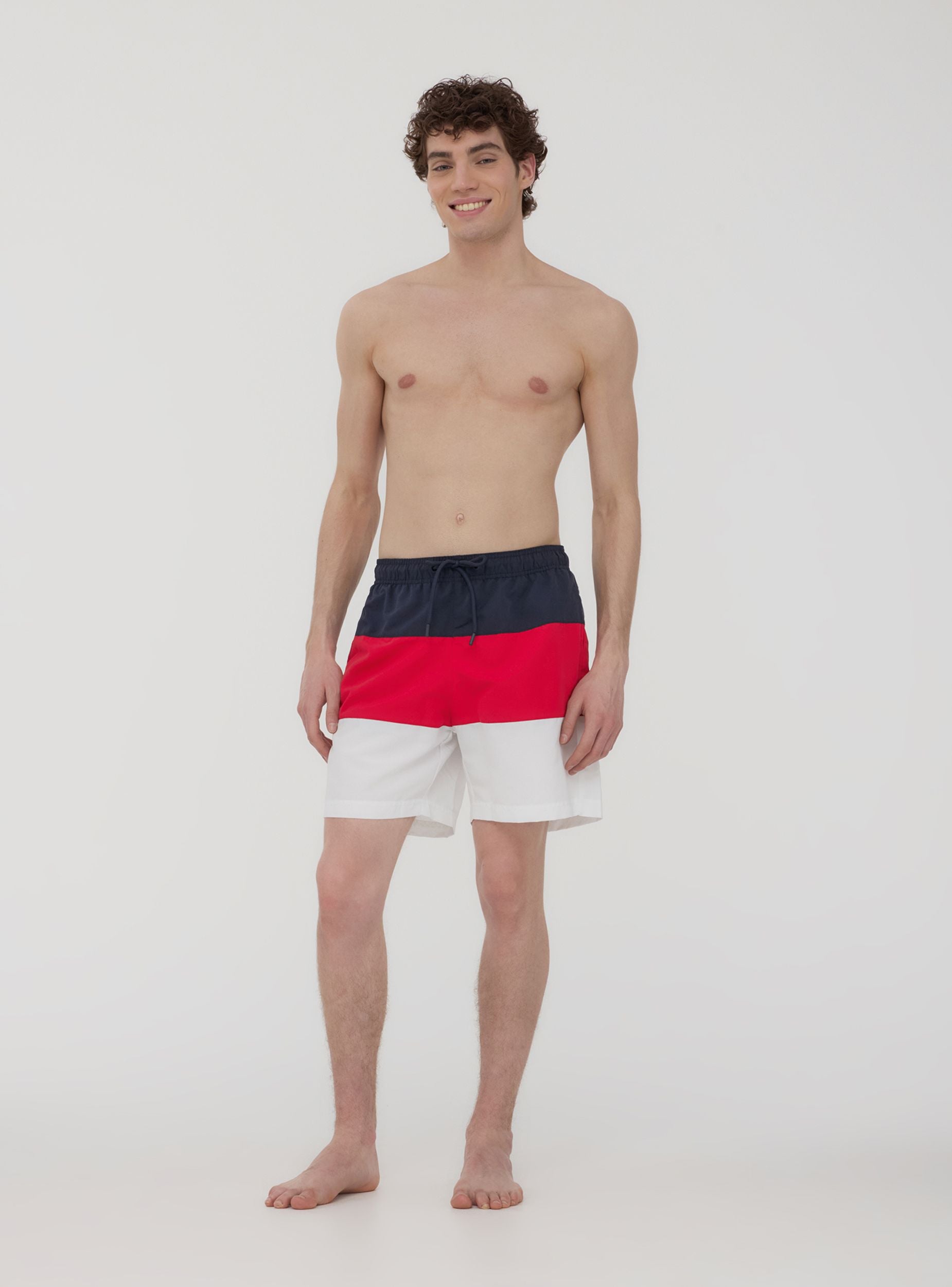 Costume da uomo in stile bermuda perfetto per le giornate in spiaggia o in piscina. Il design a righe block color dona un look moderno e dinamico, mentre la pratica coulisse in vita assicura una vestibilità regolabile e comoda. Dotato di tasche laterali per piccoli oggetti e una tasca posteriore con chiusura in velcro, è ideale per un outfit estivo versatile da abbinare a una t-shirt leggera e infradito.Dettagli