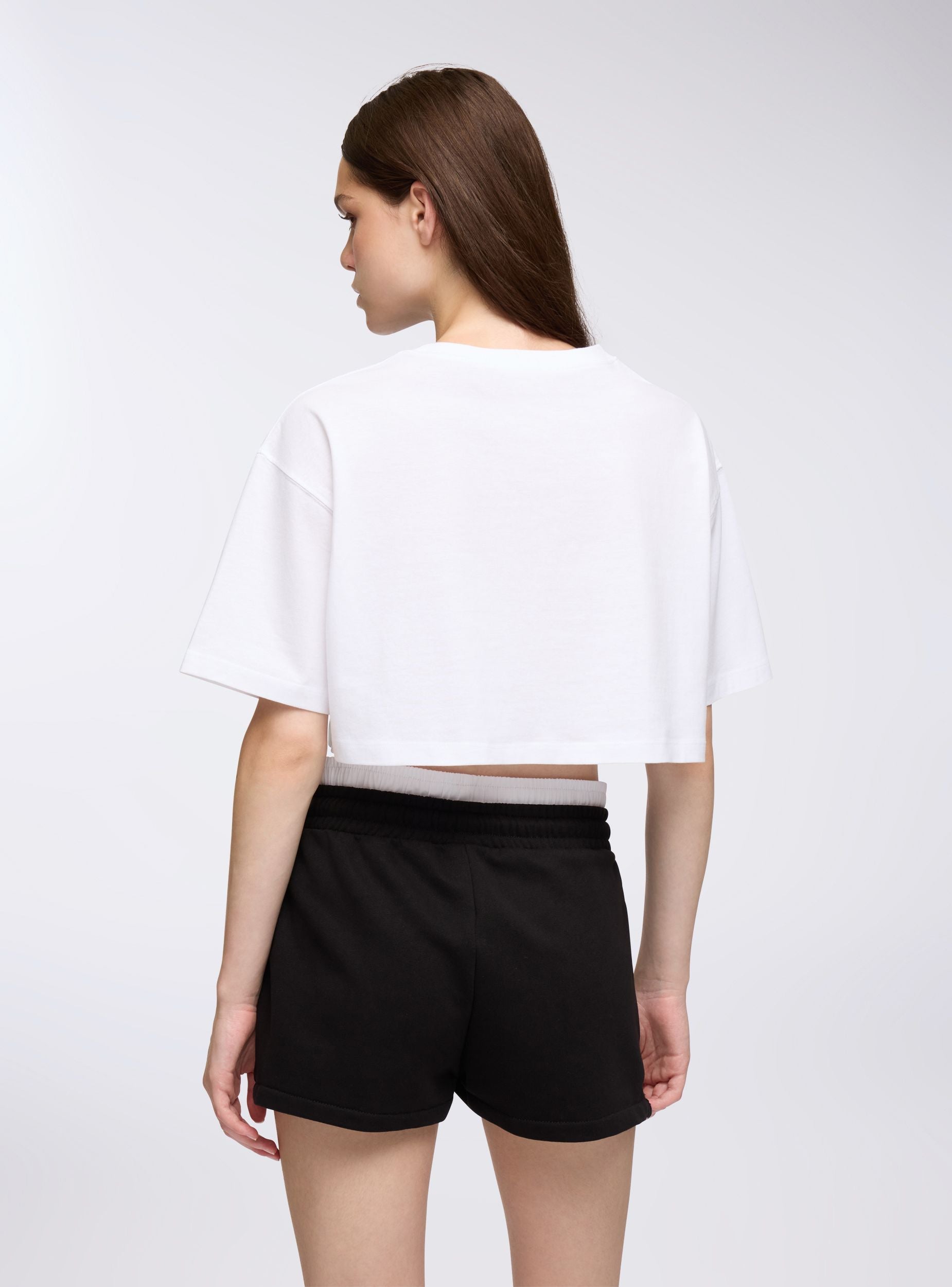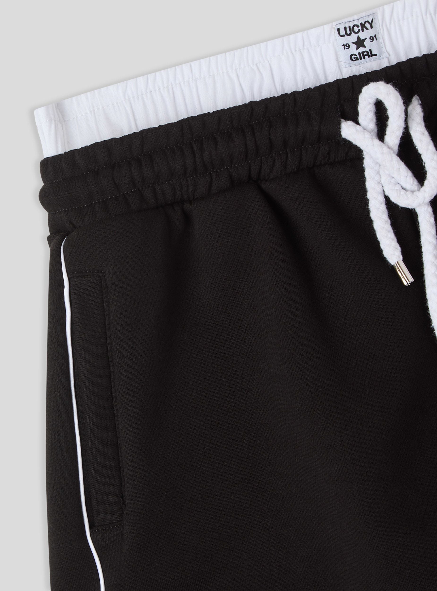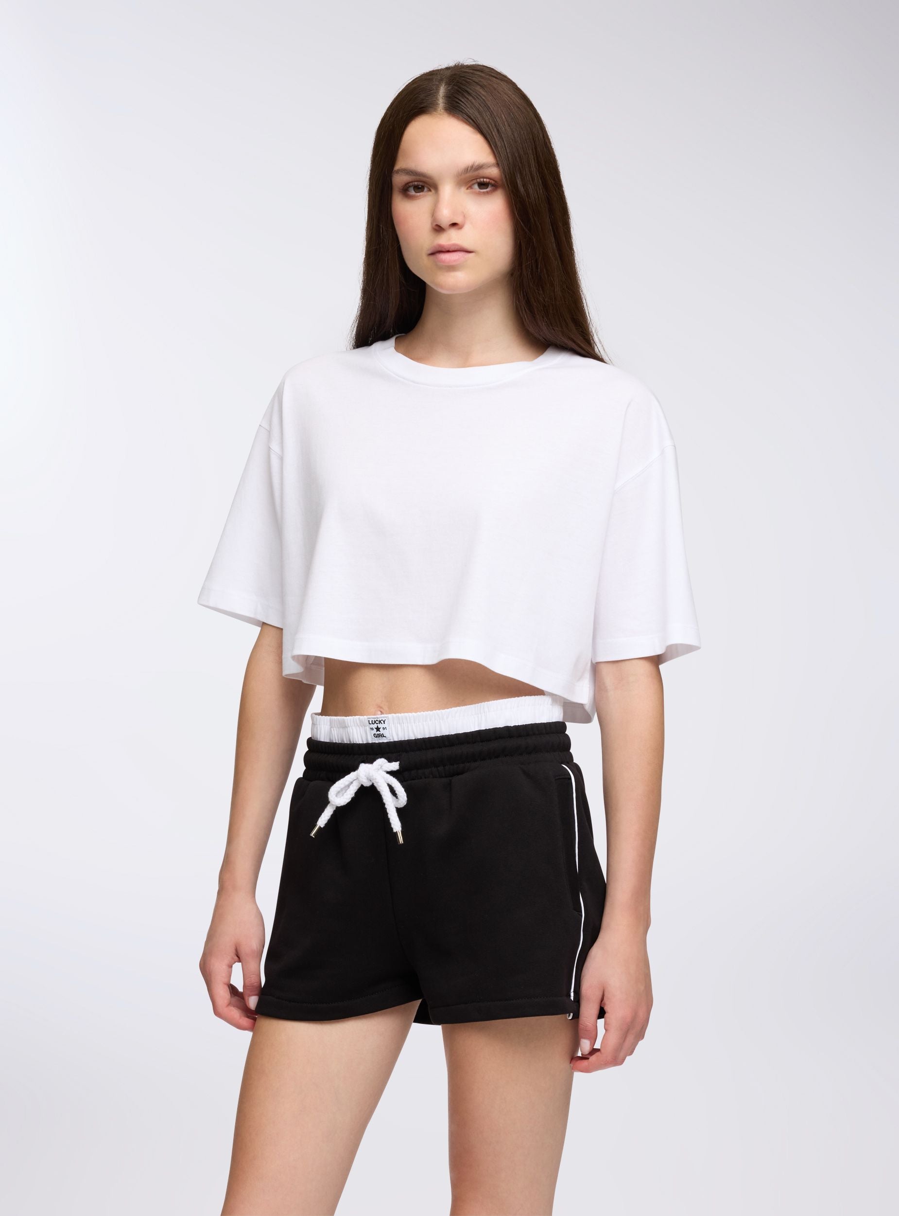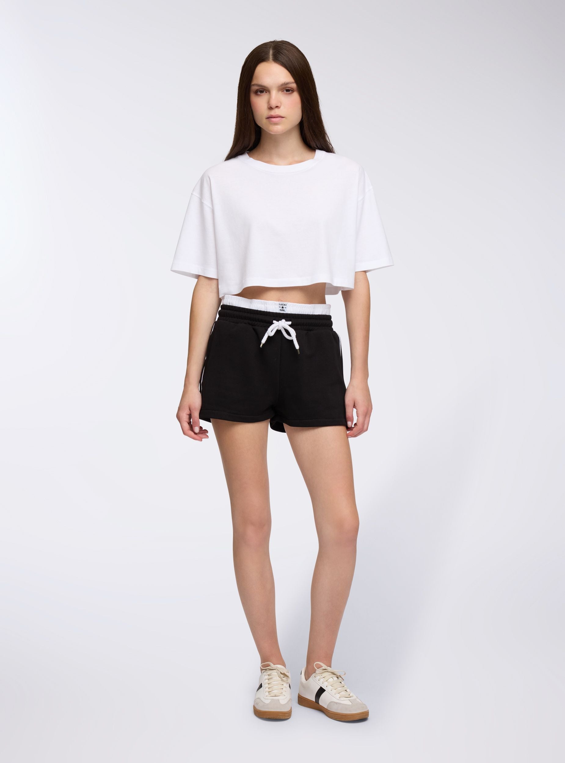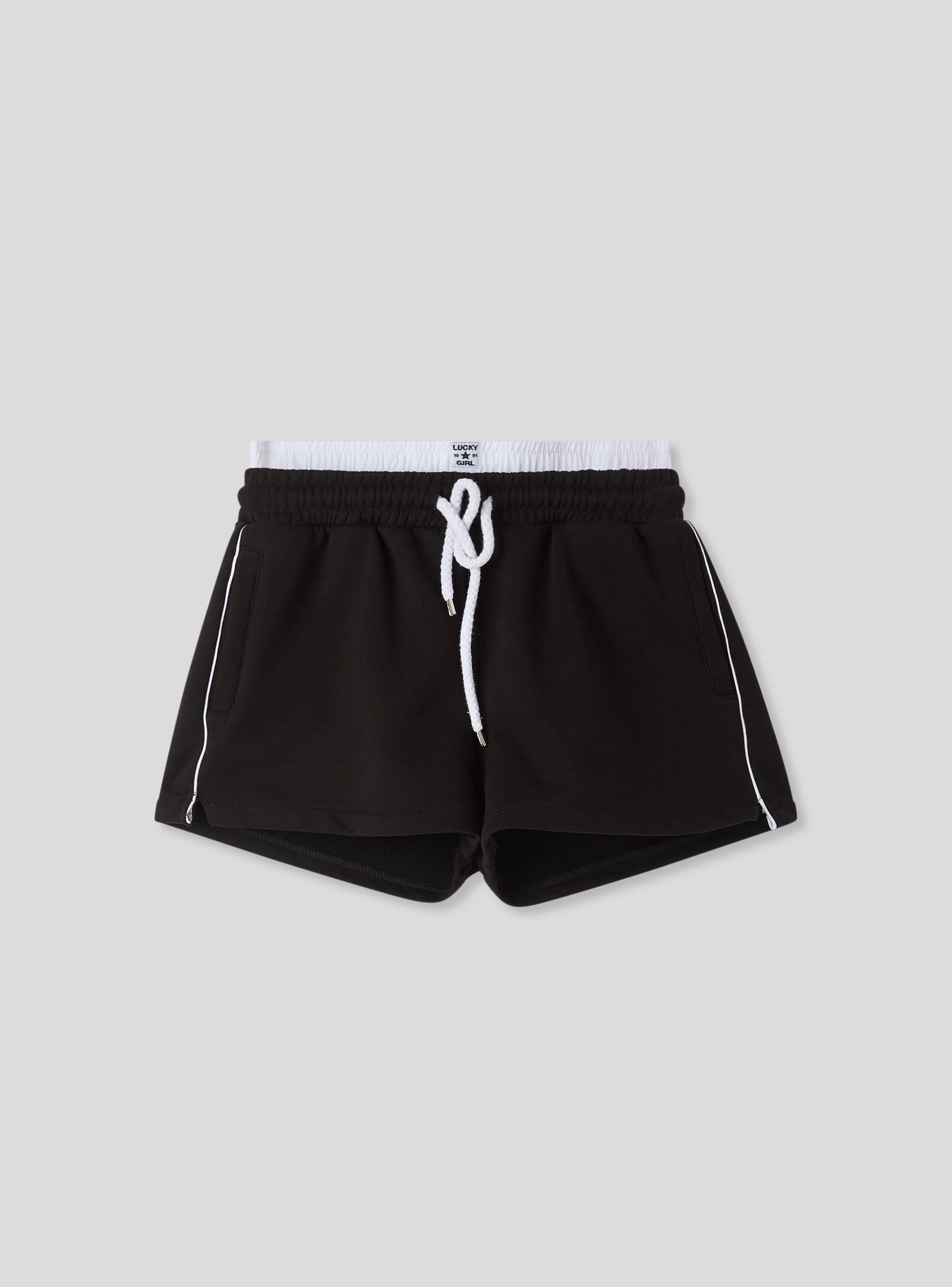 Pantaloncini leggeri da donna ideali per un look sportivo e casual. Presentano una vita doppia effetto boxer e una comoda coulisse per una regolazione ottimale e tasche laterali per praticità. Perfetti per momenti di relax, si abbinano facilmente a magliette e sneakers per un outfit dinamico e confortevole.