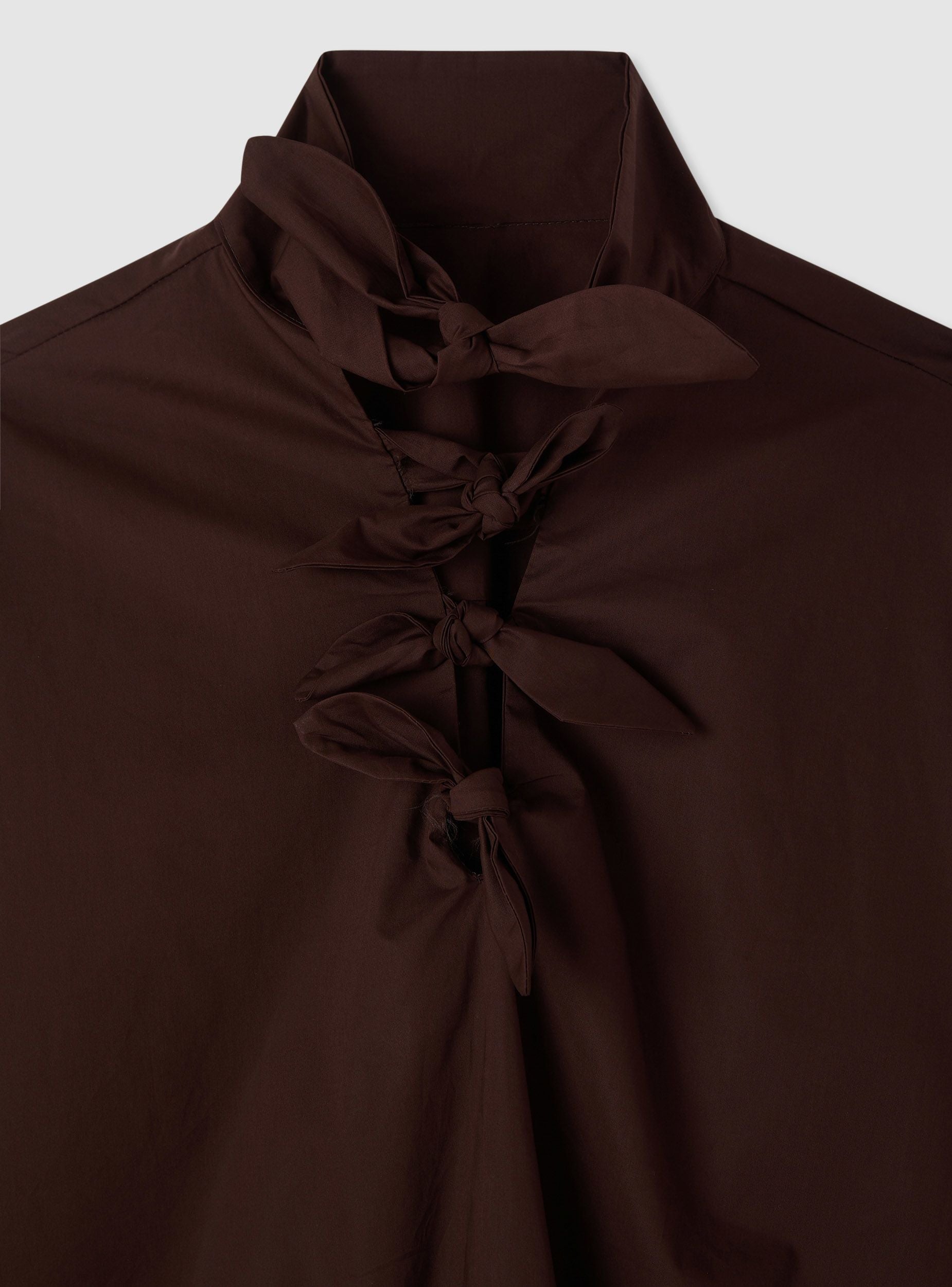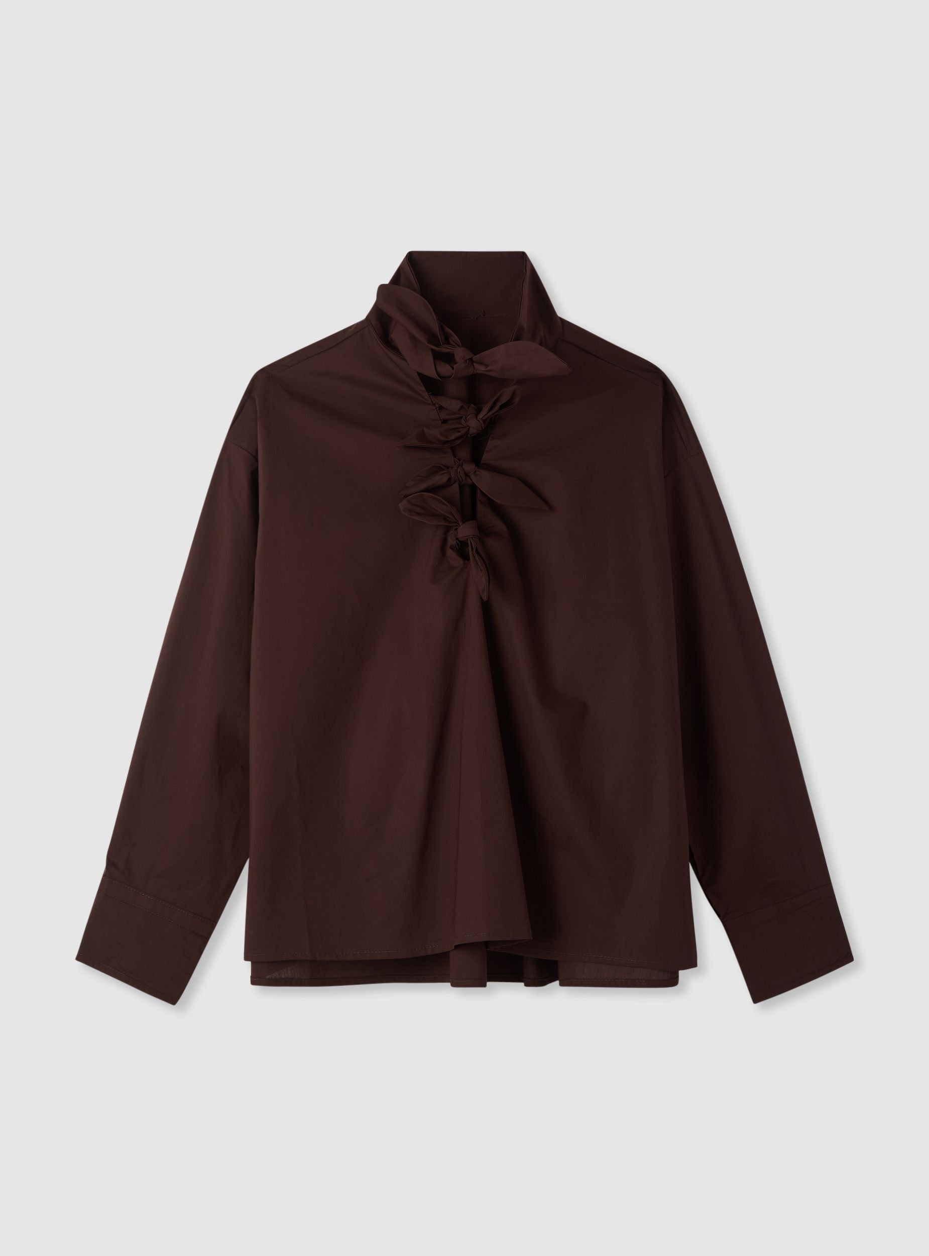 Blusa da donna a tinta unita con maniche lunghe e collo alto. Il davanti è caratterizzato da chiusura con fiocchi annodati, ideale per look eleganti o per dare un tocco ricercato a outfit casual. Perfetta con pantaloni sartoriali o jeans per l’ufficio, aperitivi e serate.Dettagli