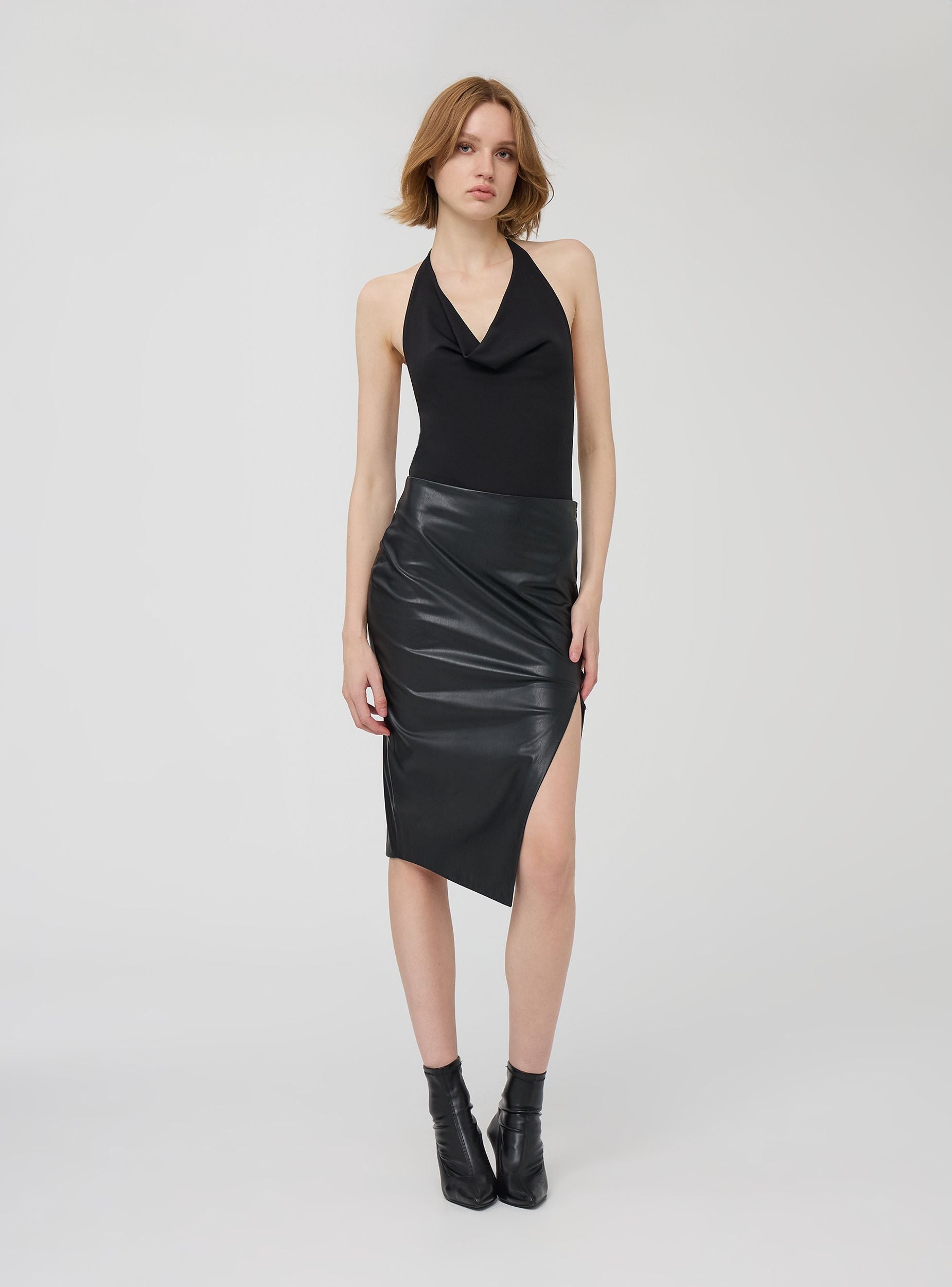 Body da donna con collo sciallato. Realizzato in tessuto a tinta unita elasticizzato. Perfetto per occasioni speciali e party.
