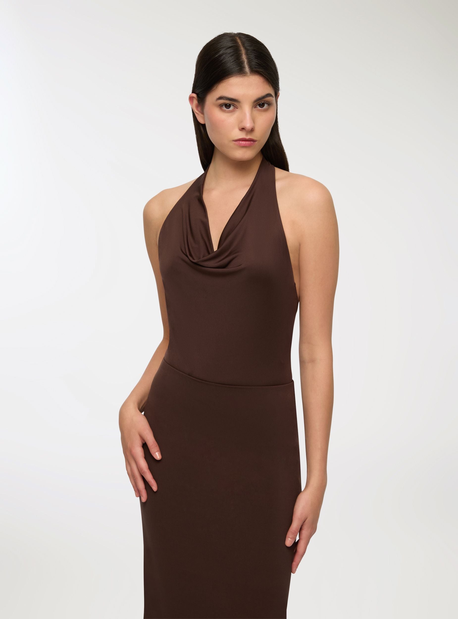 Body da donna con scollo drappeggiato e design senza maniche, ideale per occasioni eleganti o serate speciali. La chiusura a bottoni lo rende pratico e comodo da indossare. Perfetto da abbinare a pantaloni palazzo o gonne a vita alta per un look sofisticato e moderno. La vestibilità aderente valorizza la silhouette, mentre il dettaglio del drappeggio aggiunge un tocco di stile unico.Dettagli