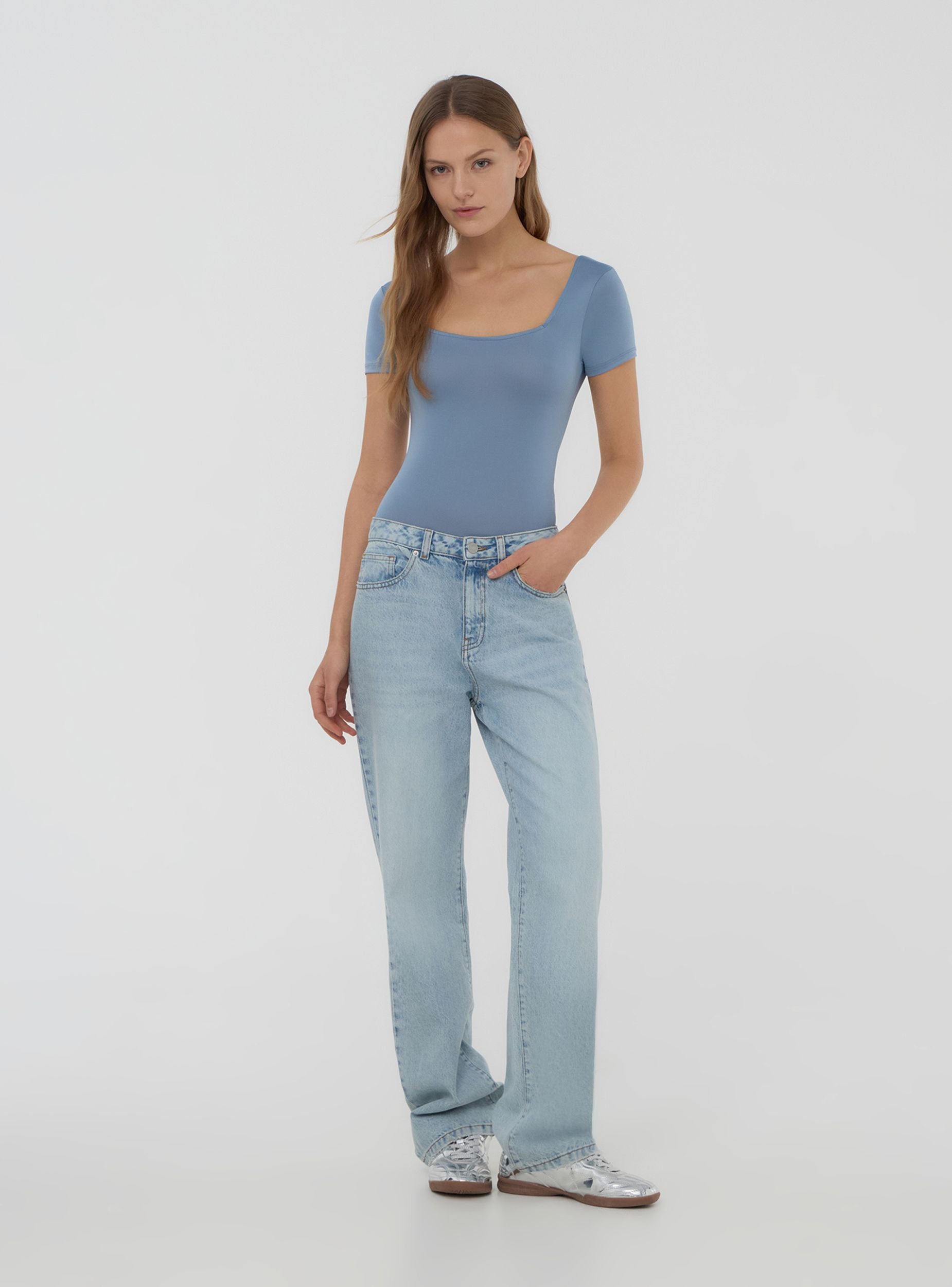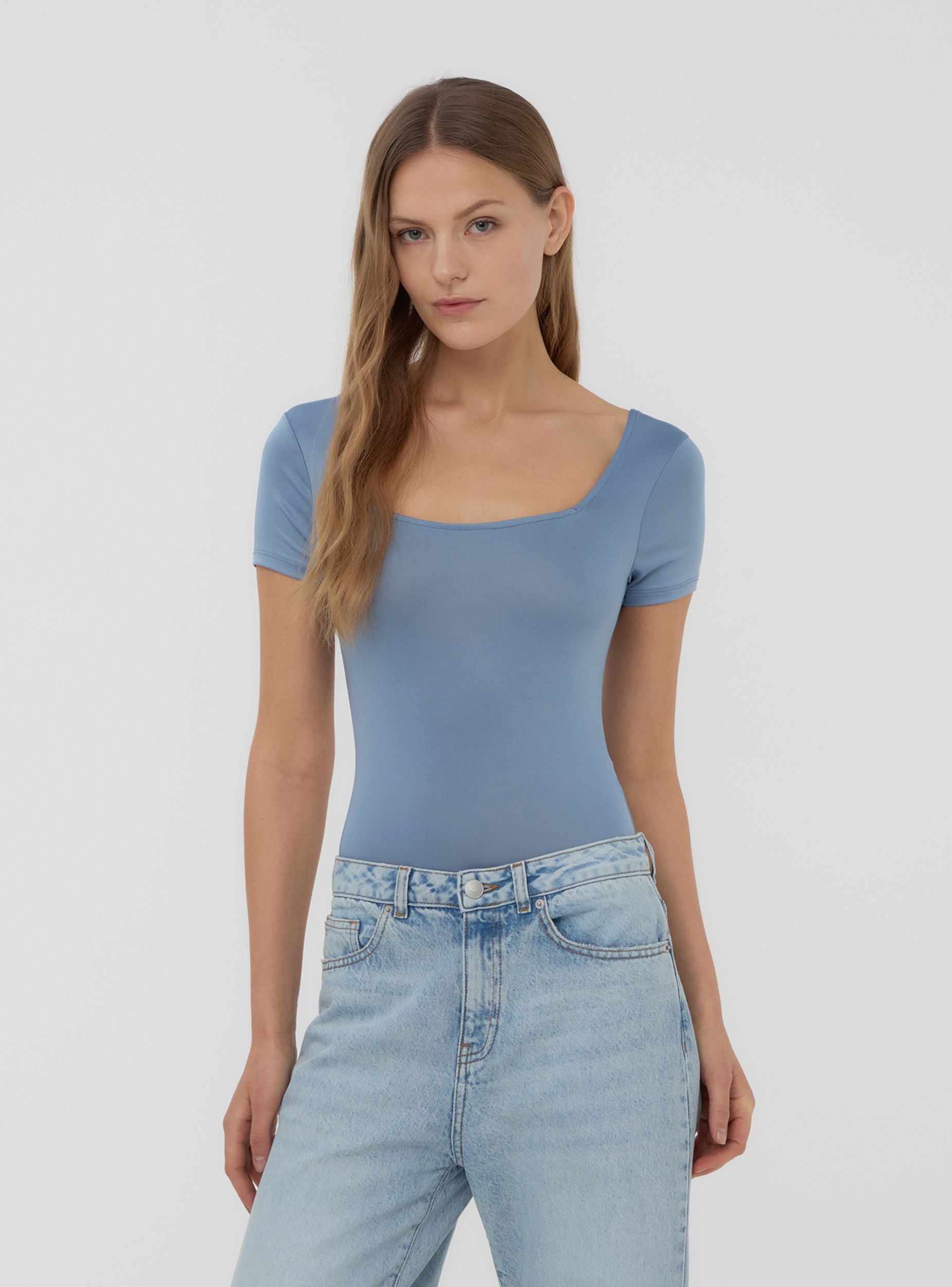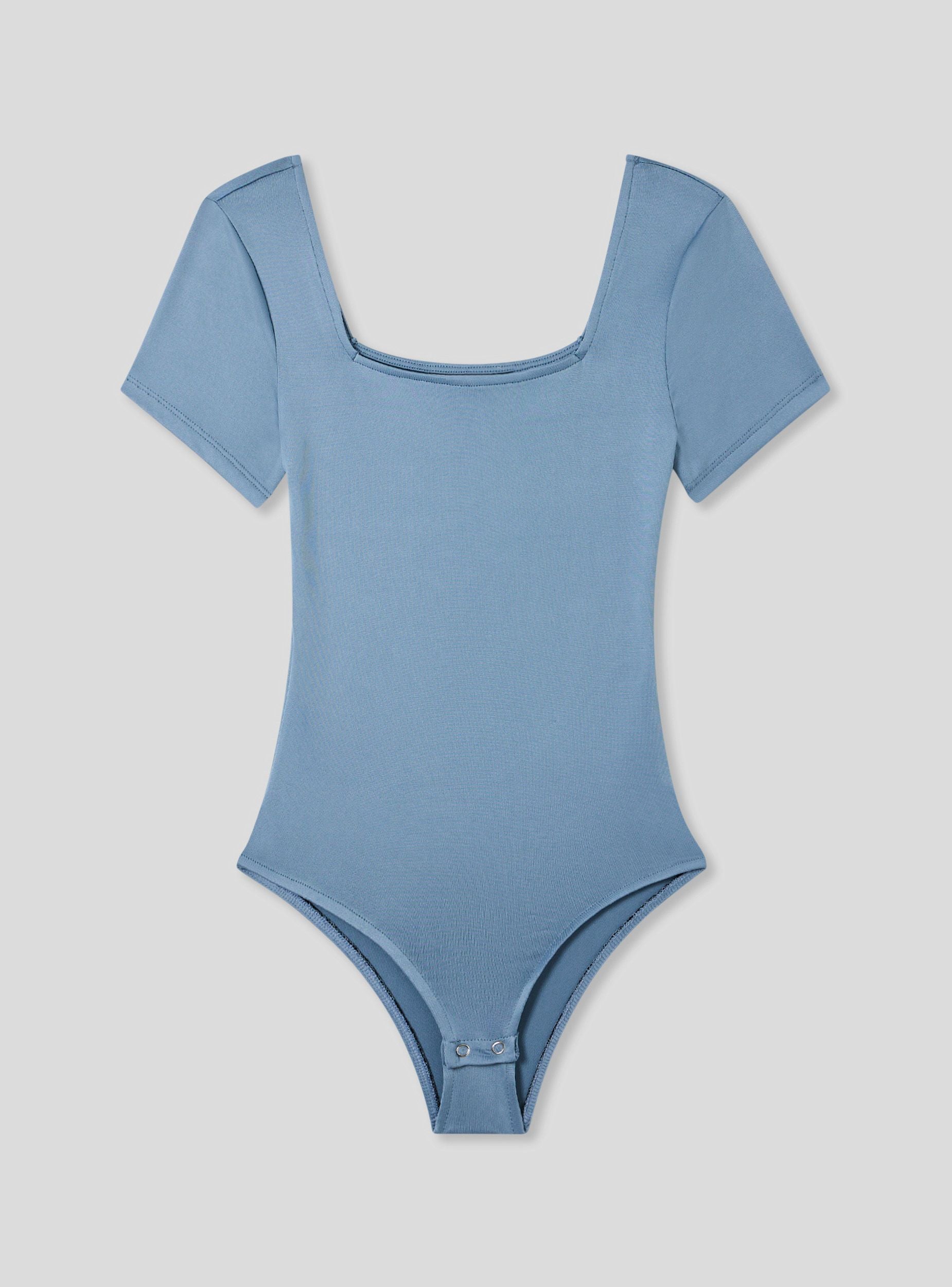 Body da donna con scollo quadrato, caratterizzato da una linea aderente e tinta unita. Le maniche corte completano il design essenziale, mentre il tessuto elasticizzato assicura una vestibilità comoda e sagomata. Presenta bottoni a pressione sul fondo per una chiusura pratica e sicura.Dettagli