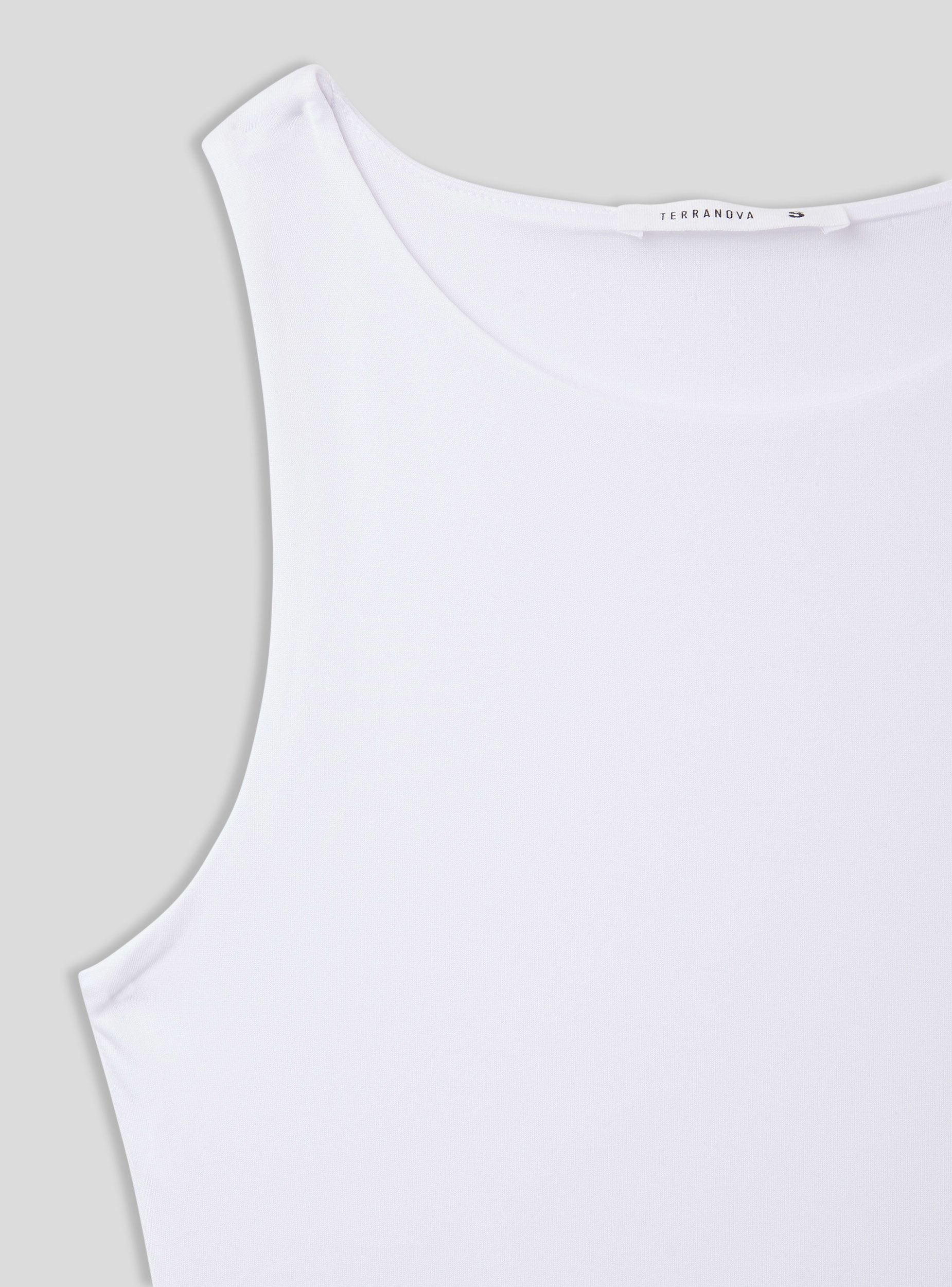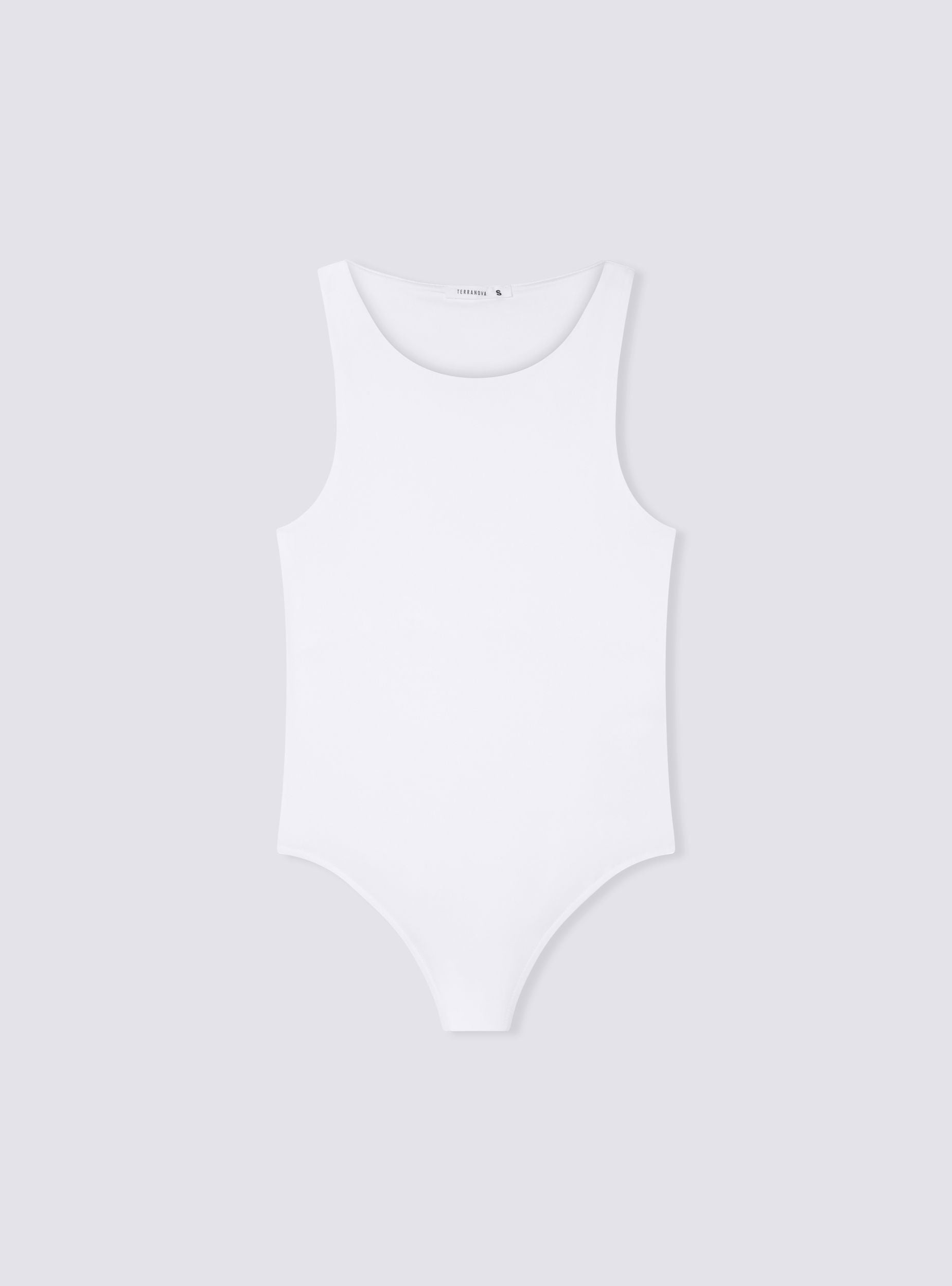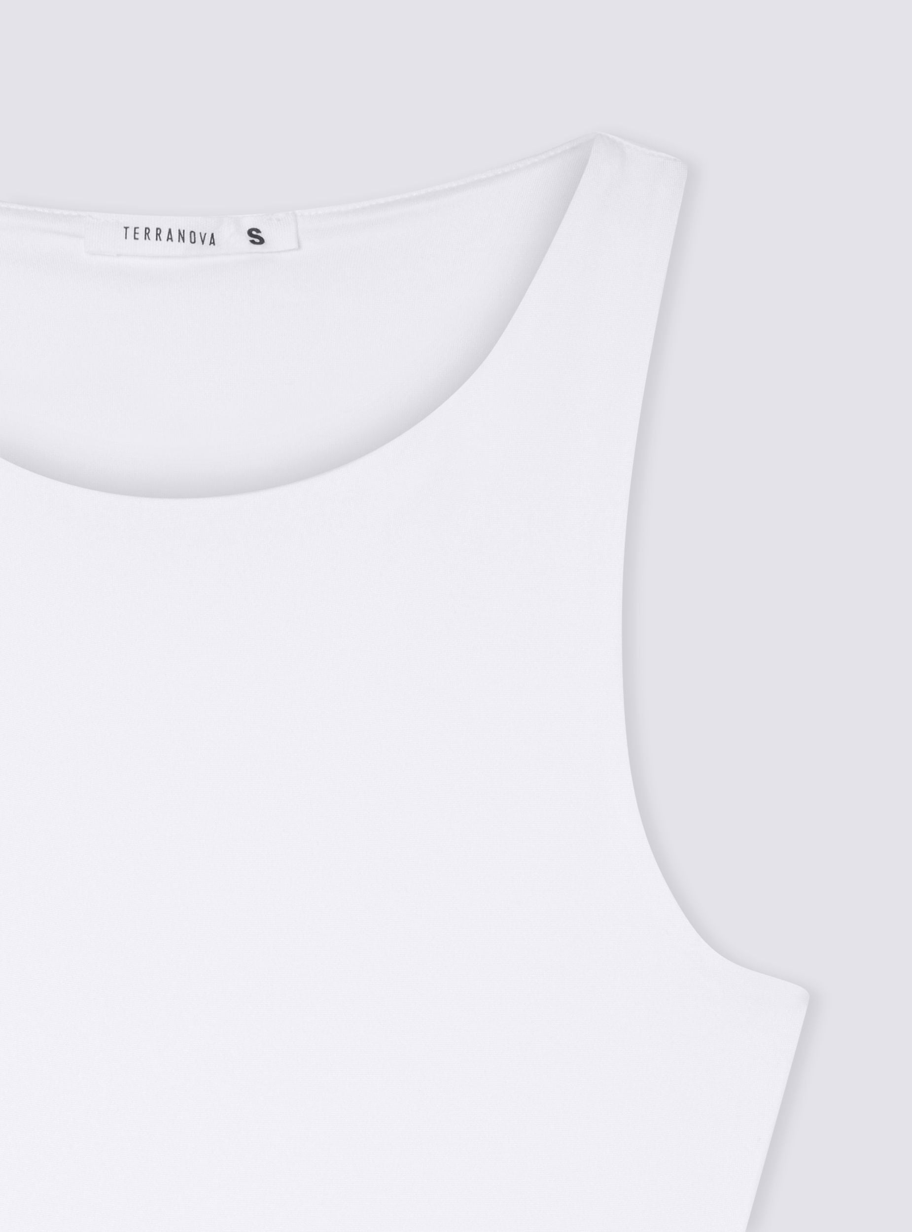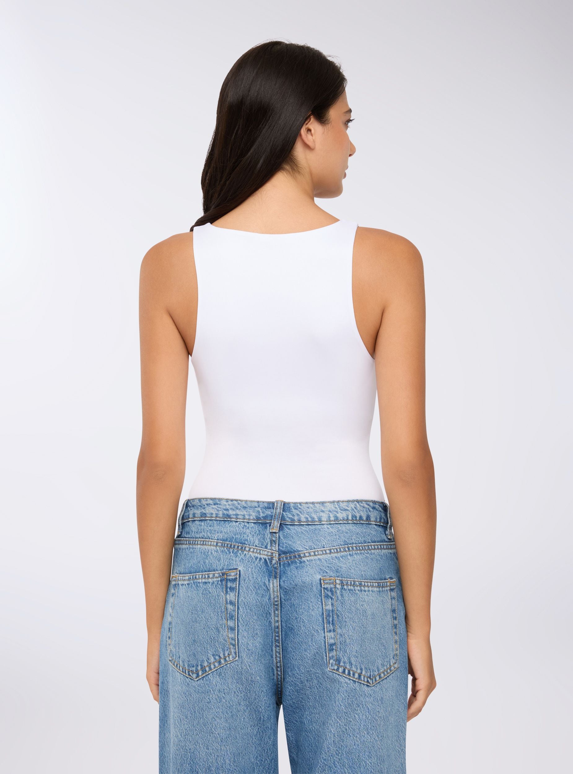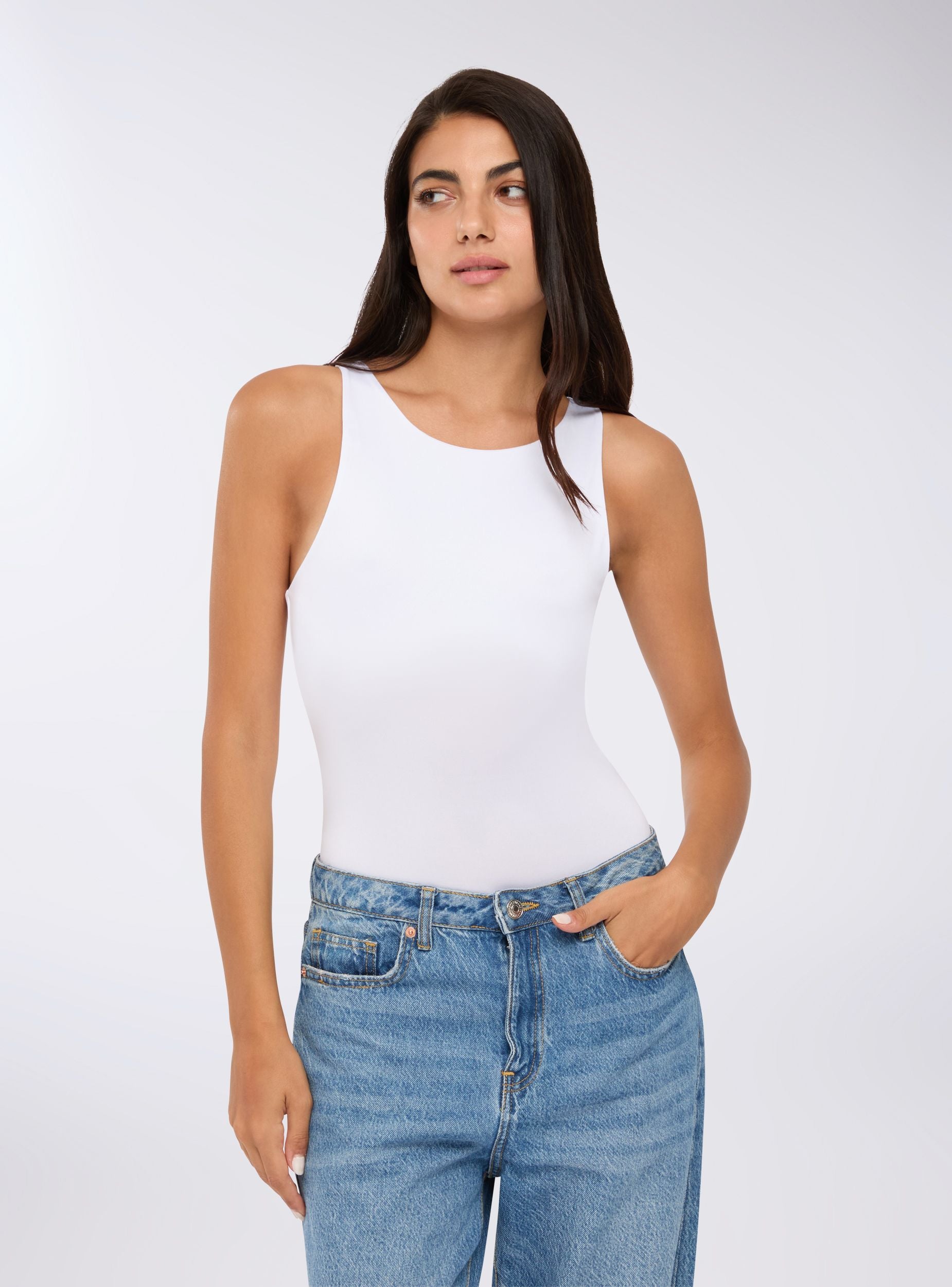 Body da donna a tinta unita, caratterizzato da un design elasticizzato che si adatta perfettamente alla figura, garantendo una vestibilità aderente e confortevole. La scollatura arrotondata e le spalline ampie conferiscono un tocco minimalista e versatile. Il capo è dotato di una pratica chiusura con bottoni a pressione nella parte inferiore, ideale per indossarlo con facilità. Un capo essenziale per creare look eleganti o casual, da abbinare a jeans o gonne per un tocco di stile moderno e femminile.