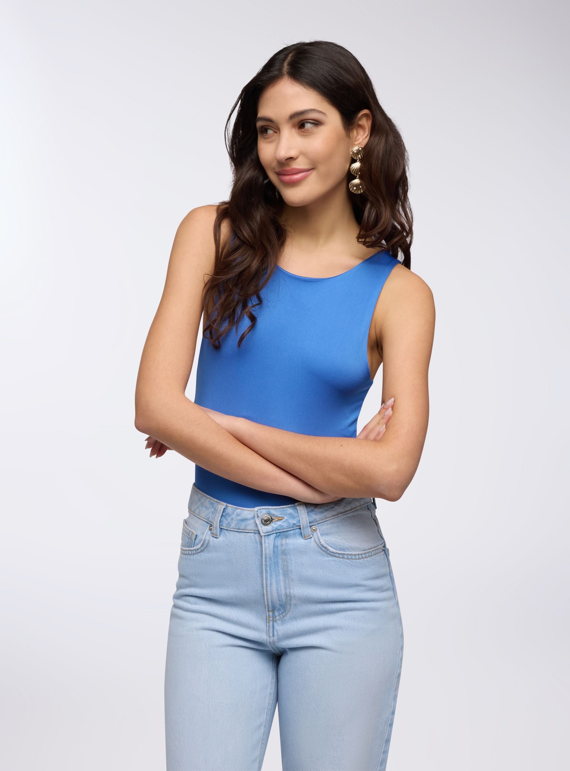 Body da donna a tinta unita, caratterizzato da un design elasticizzato che si adatta perfettamente alla figura, garantendo una vestibilità aderente e confortevole. La scollatura arrotondata e le spalline ampie conferiscono un tocco minimalista e versatile. Il capo è dotato di una pratica chiusura con bottoni a pressione nella parte inferiore, ideale per indossarlo con facilità. Un capo essenziale per creare look eleganti o casual, da abbinare a jeans o gonne per un tocco di stile moderno e femminile.Dettagli