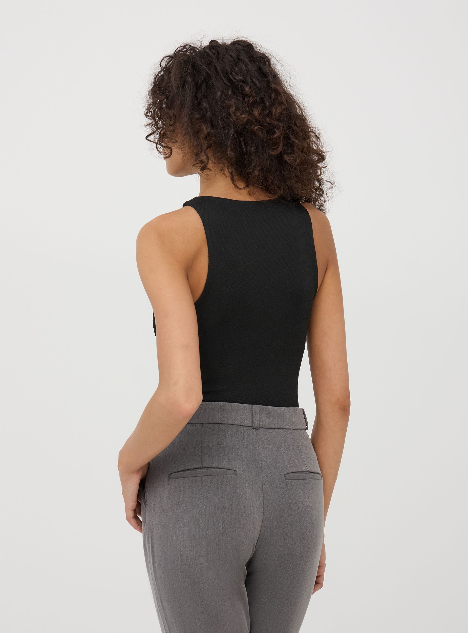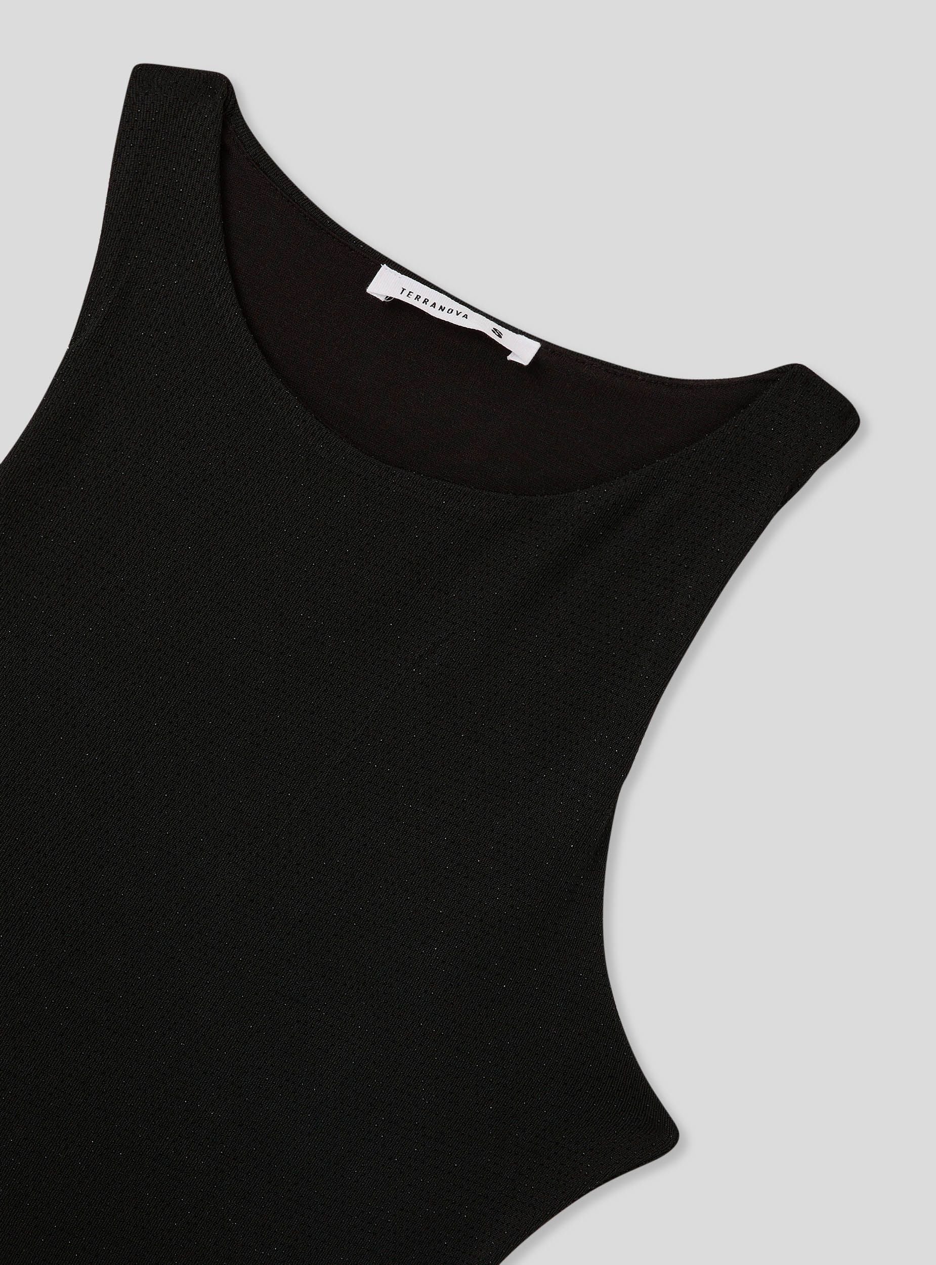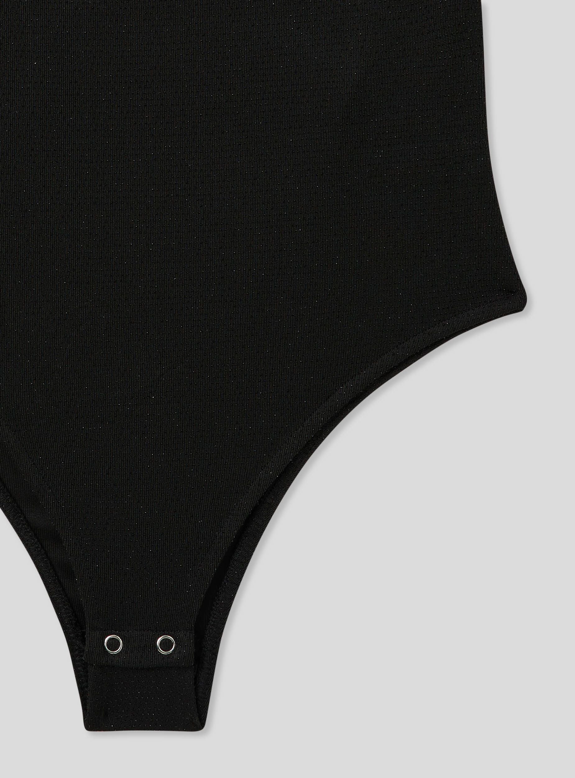 Body da donna realizzato in tessuto a tinta unita luccicante. Questo capo è caratterizzato da uno scollo rotondo e spalline larghe, che offrono una vestibilità confortevole. Il tessuto luccicante aggiunge un tocco di brillantezza e glamour, rendendo il body perfetto per occasioni speciali o serate eleganti. Il design senza maniche garantisce libertà di movimento, mentre la chiusura con bottoncini a pressione garantisce praticità e facilità d'uso. Si abbina perfettamente con pantaloni o gonne, creando un look sofisticato e alla moda, ideale per una varietà di stili e occasioni.Dettagli