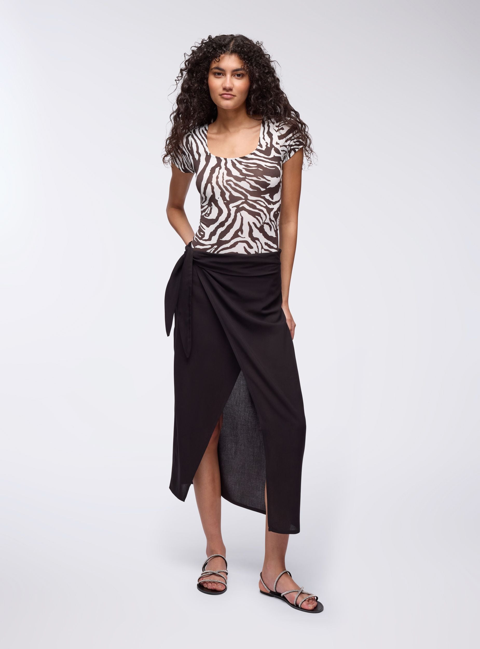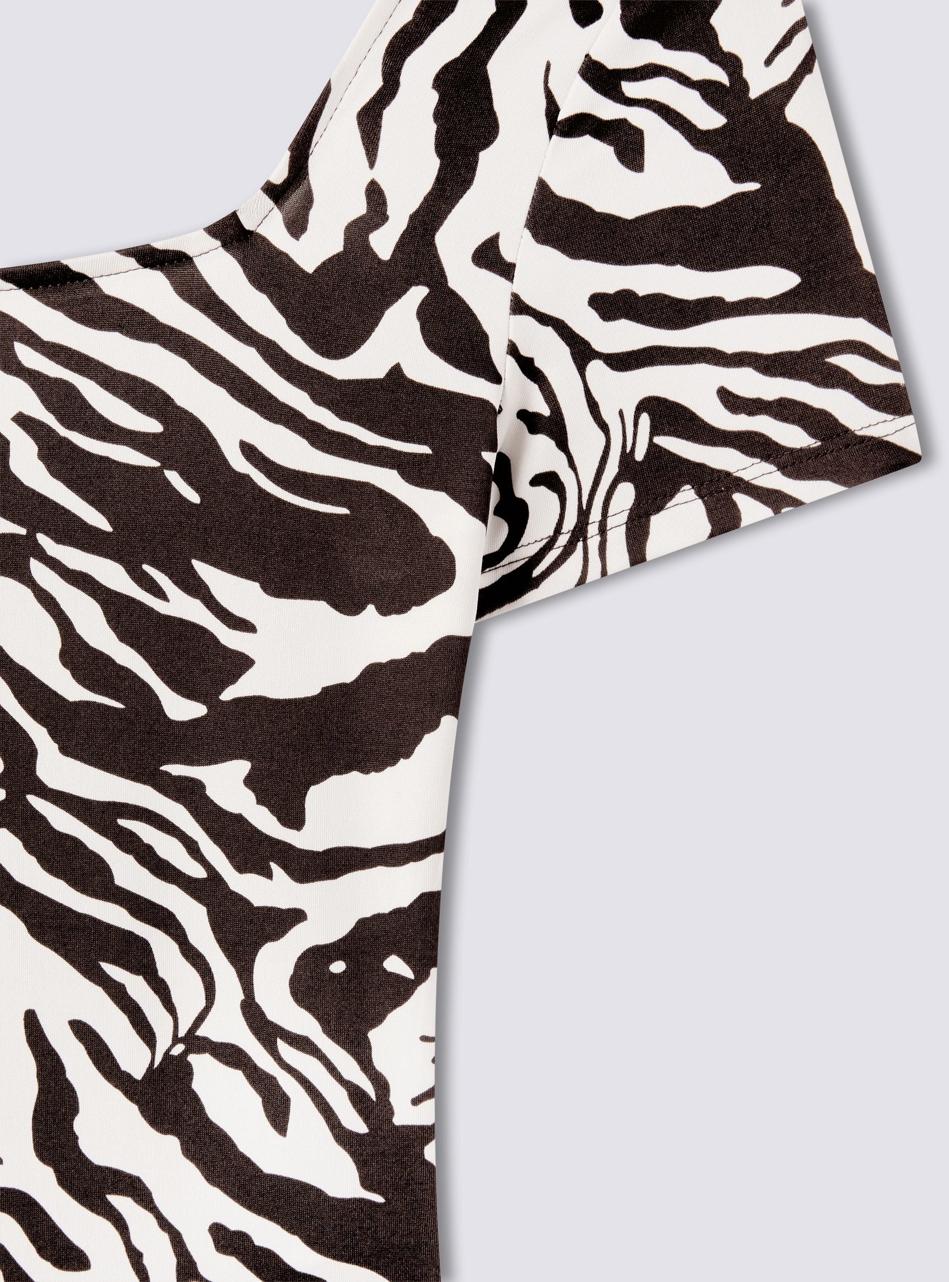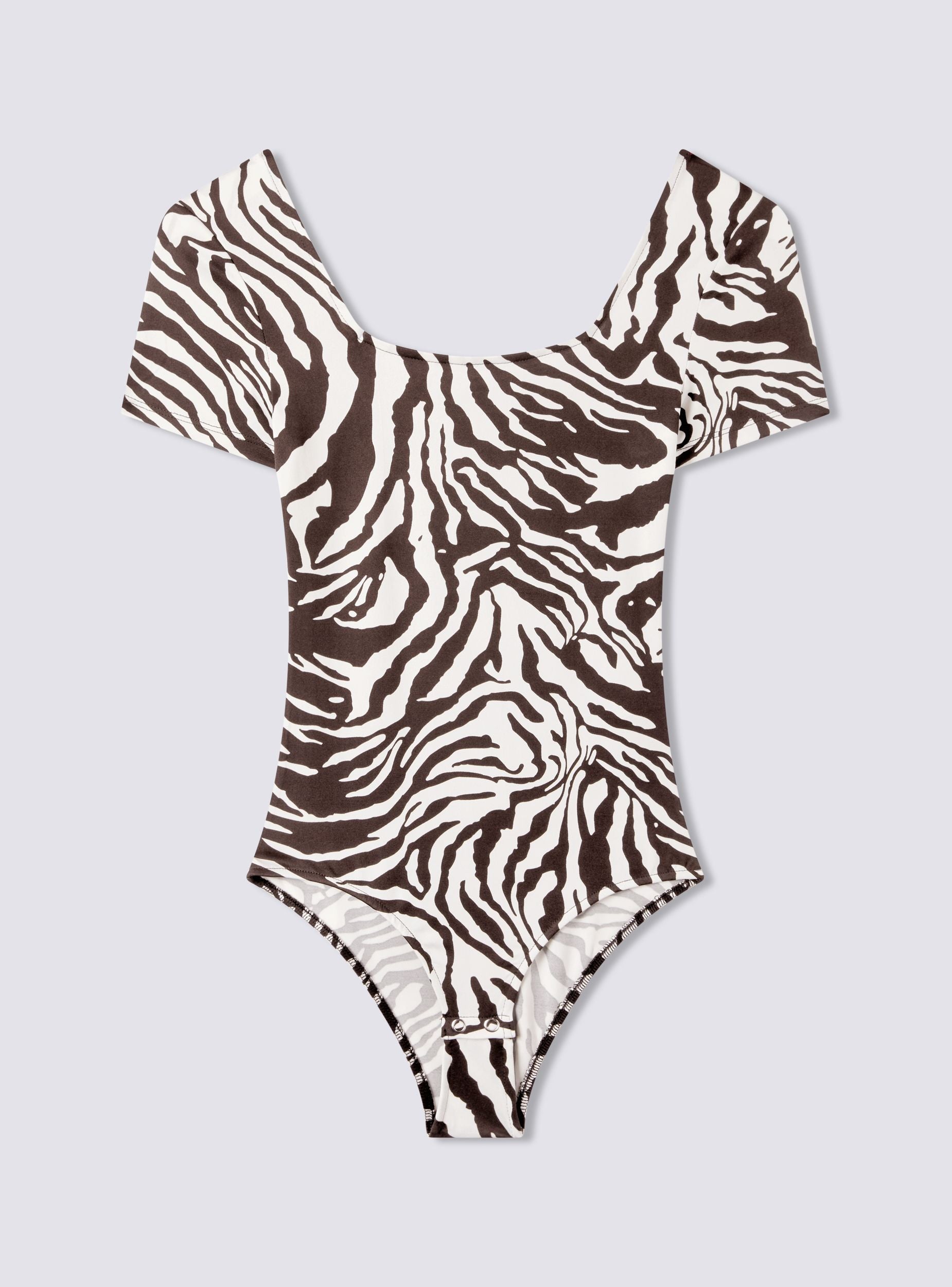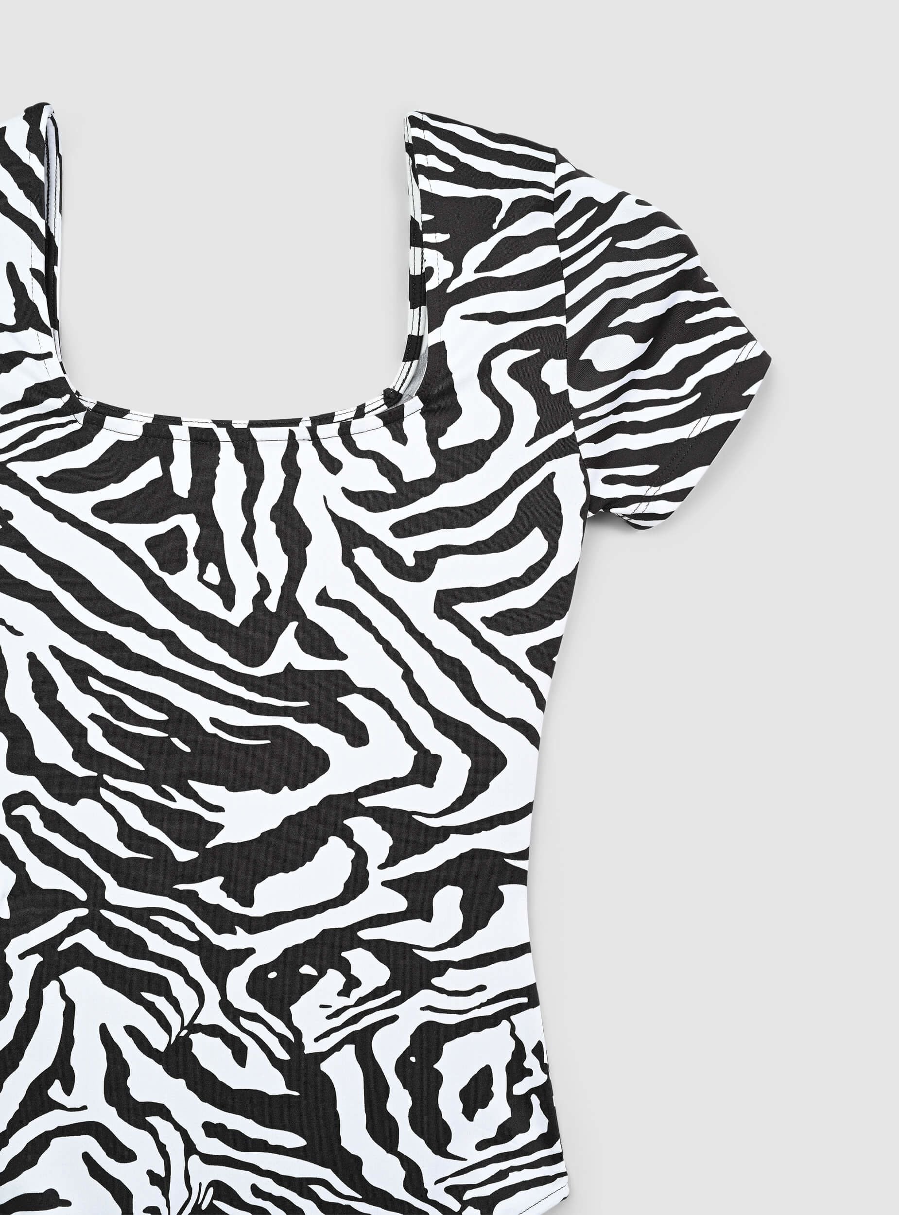 Body da donna con scollo quadrato e maniche corte, caratterizzato da una stampa zebrata che dona un tocco audace e moderno. Perfetto per outfit casual o serate eleganti, si abbina facilmente a pantaloni a vita alta o gonne. La vestibilità aderente elasticizzata valorizza la silhouette, rendendolo ideale per chi cerca uno stile unico e sofisticato.