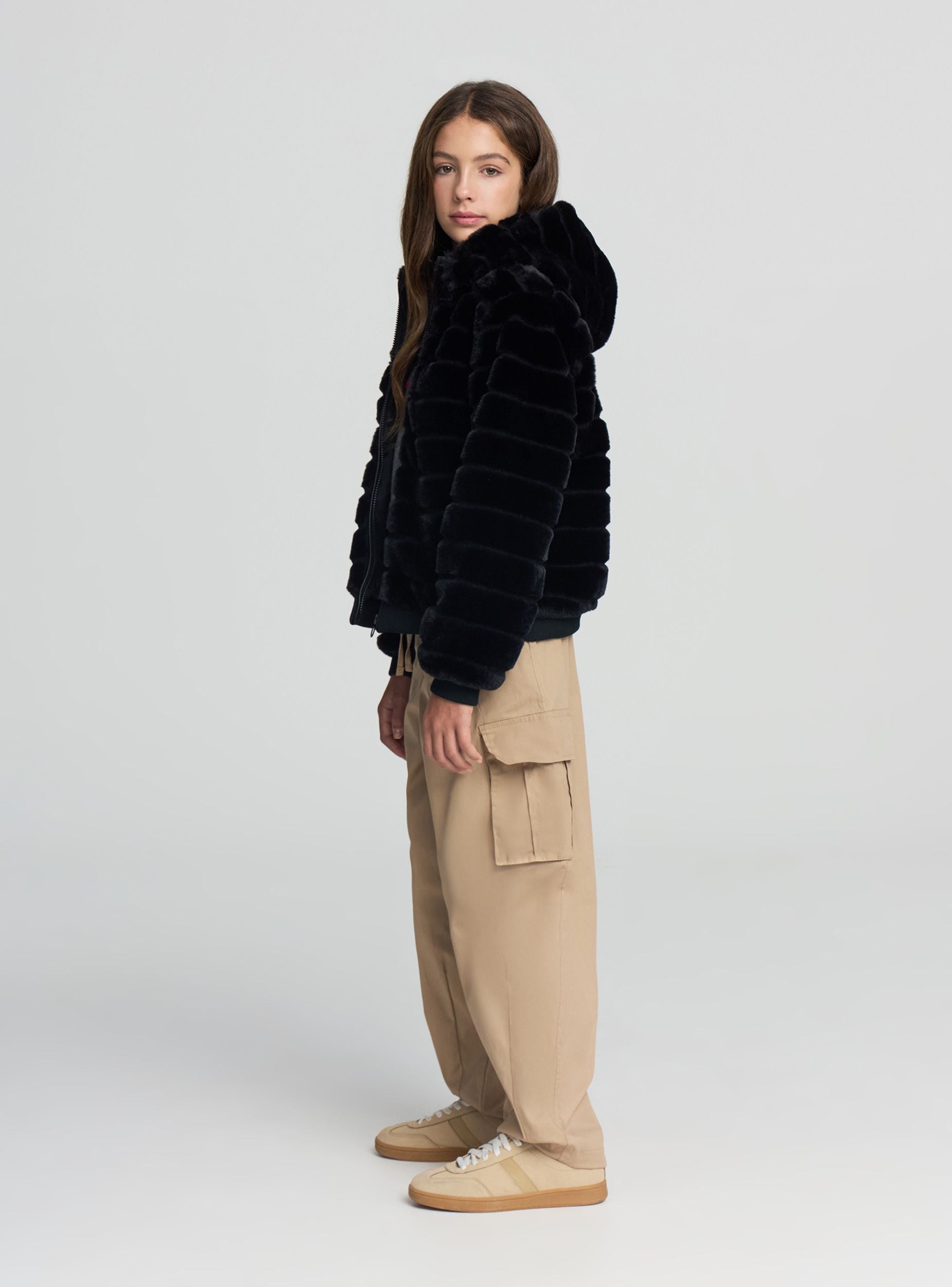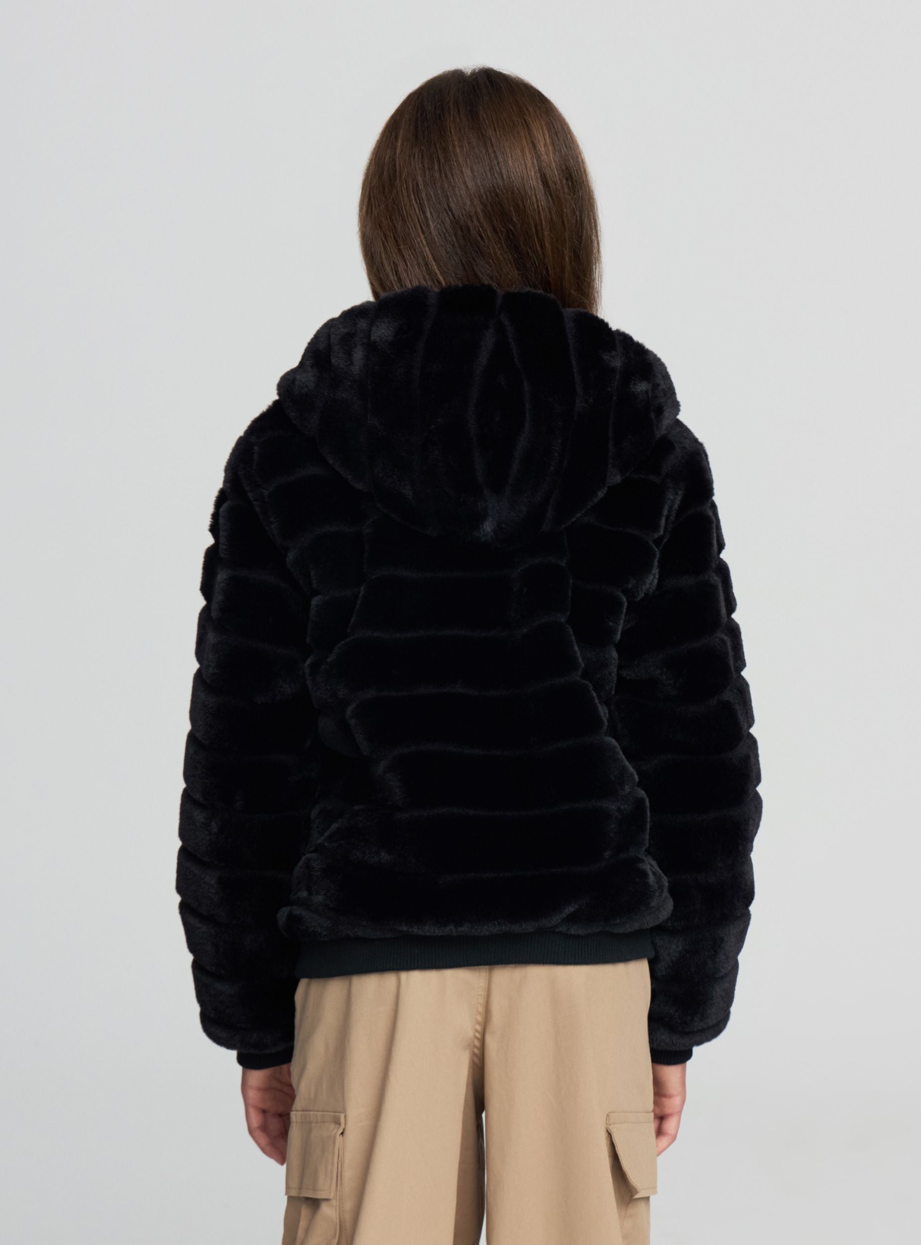 Bomber da bambina in pelliccia sintetica tinta unita con tasche laterali. Questo capo versatile si distingue per il design moderno e la praticità, perfetto per completare outfit comodi e alla moda. Dotato di chiusura con zip e cappuccio, offre comfort e protezione. Si abbina facilmente a jeans o pantaloni sportivi, rendendolo un'opzione ideale per il tempo libero e le attività quotidiane.Dettagli