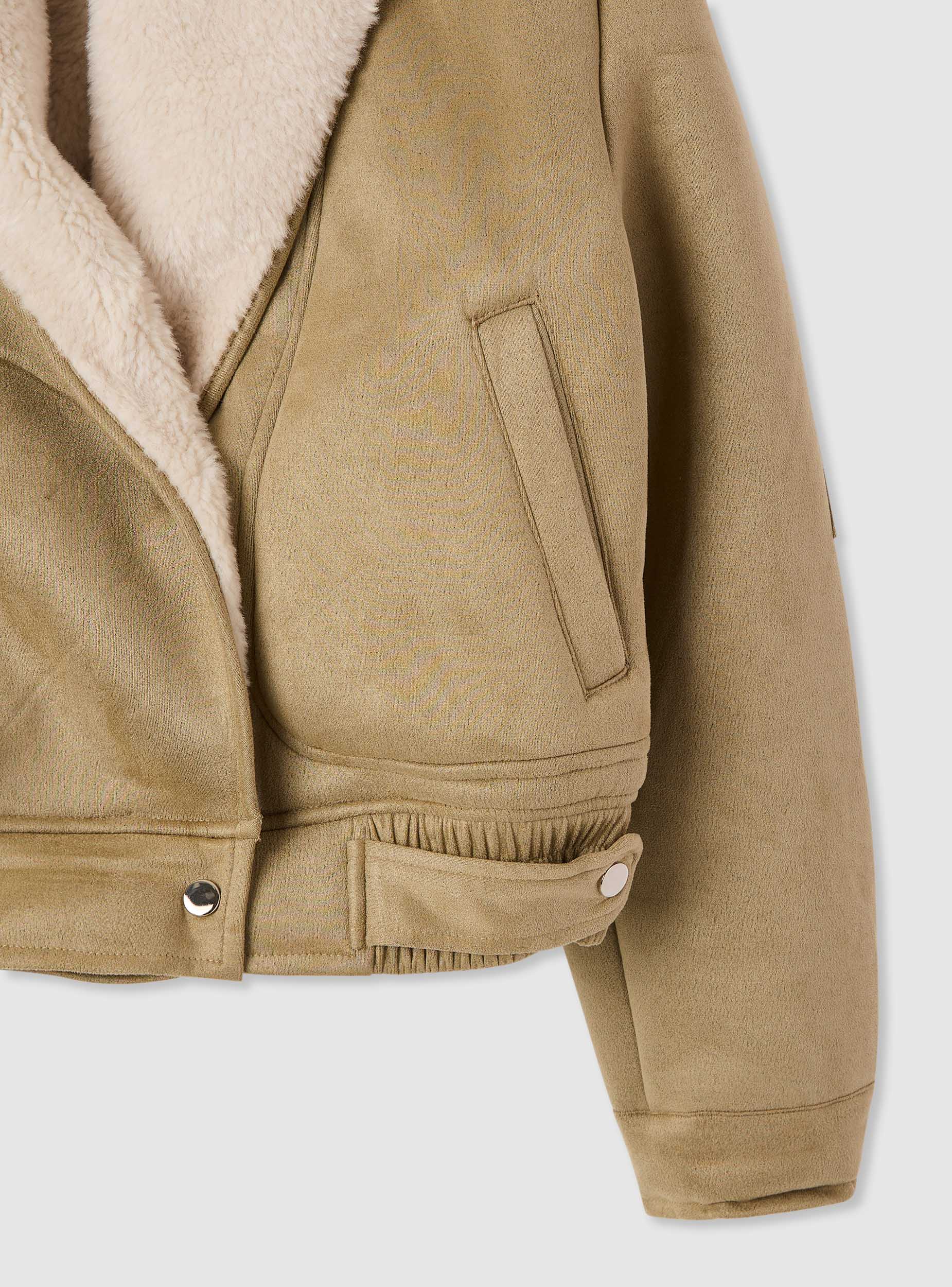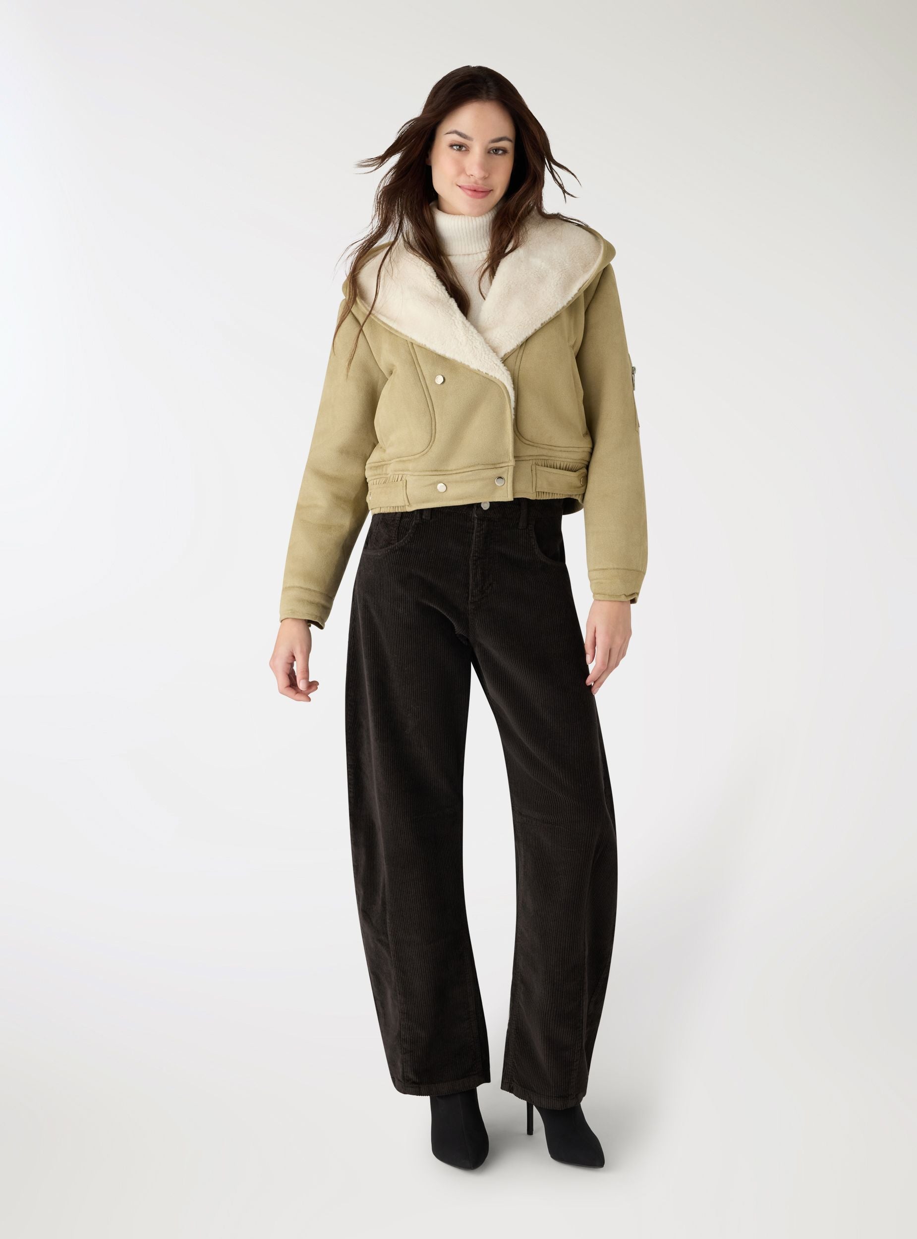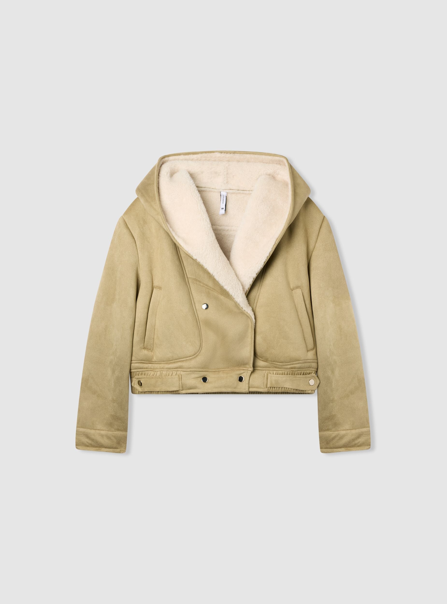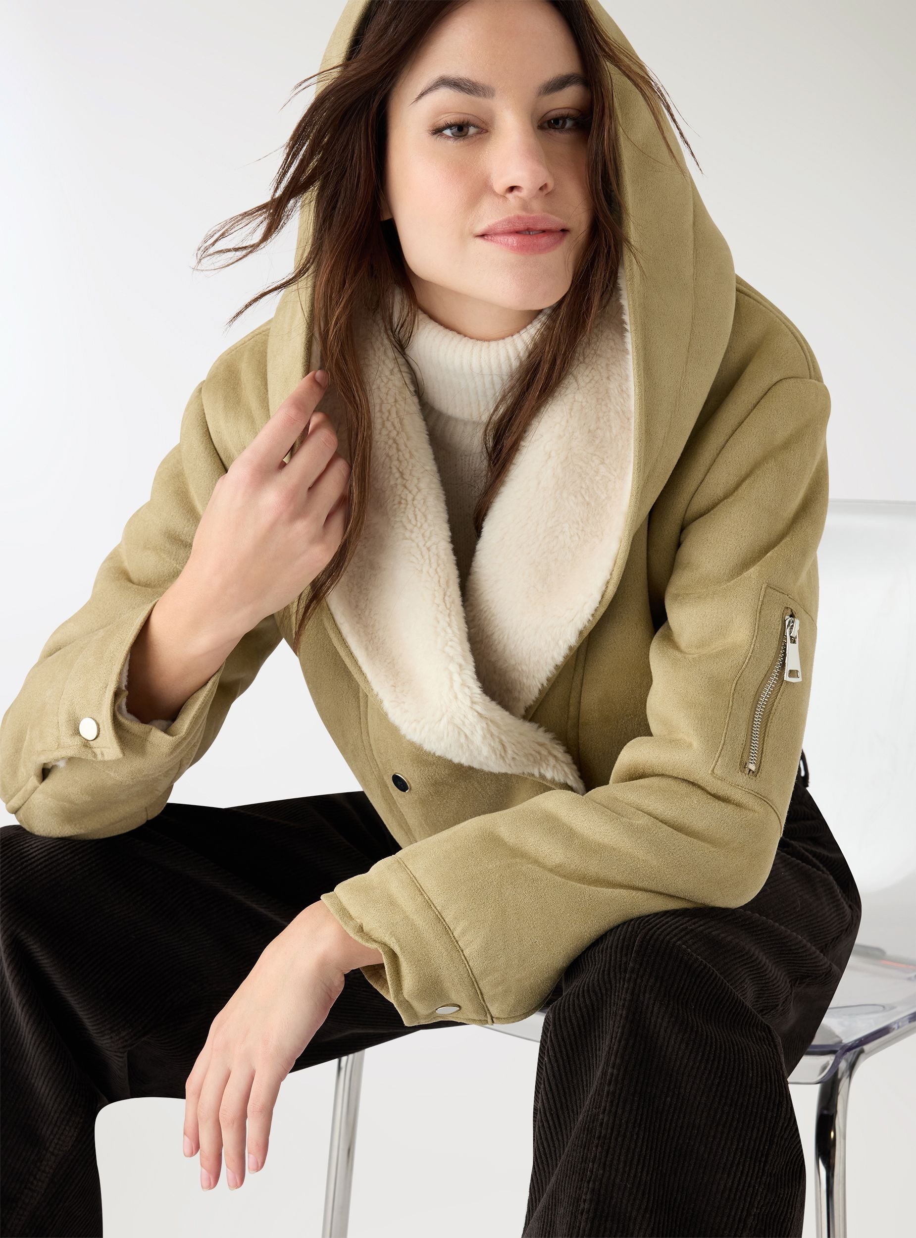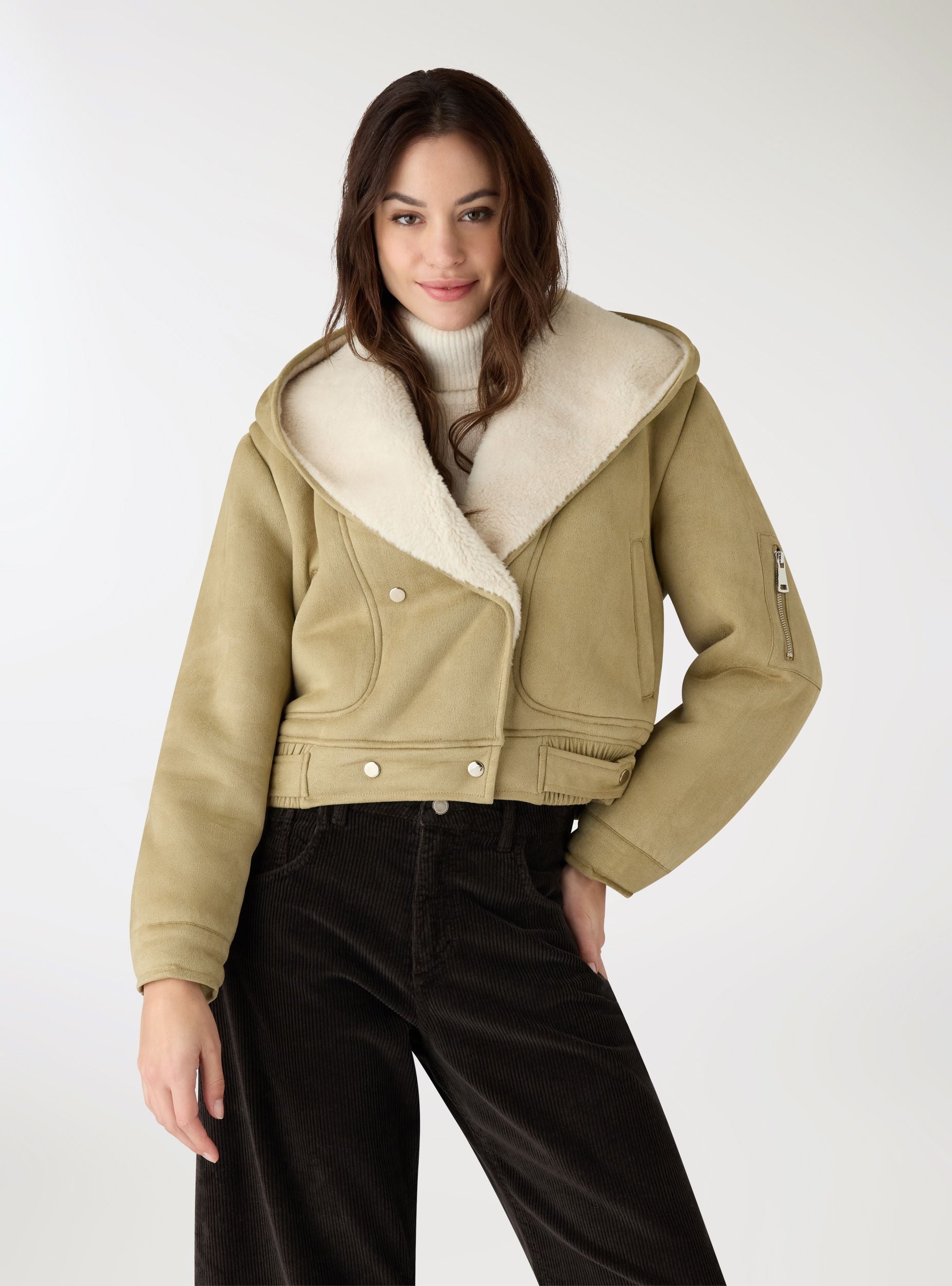 Bomber da donna in tinta unita con cappuccio. Modello corto con chiusura doppiopetto a bottoni automatici, tasche verticali a filetto e taschino con zip sulla manica. Fondo regolabile con fascette e bottoni per una vestibilità personalizzabile. Ideale con jeans e anfibi per il tempo libero, aggiunge calore e stile ai look casual nelle giornate fredde.Dettagli