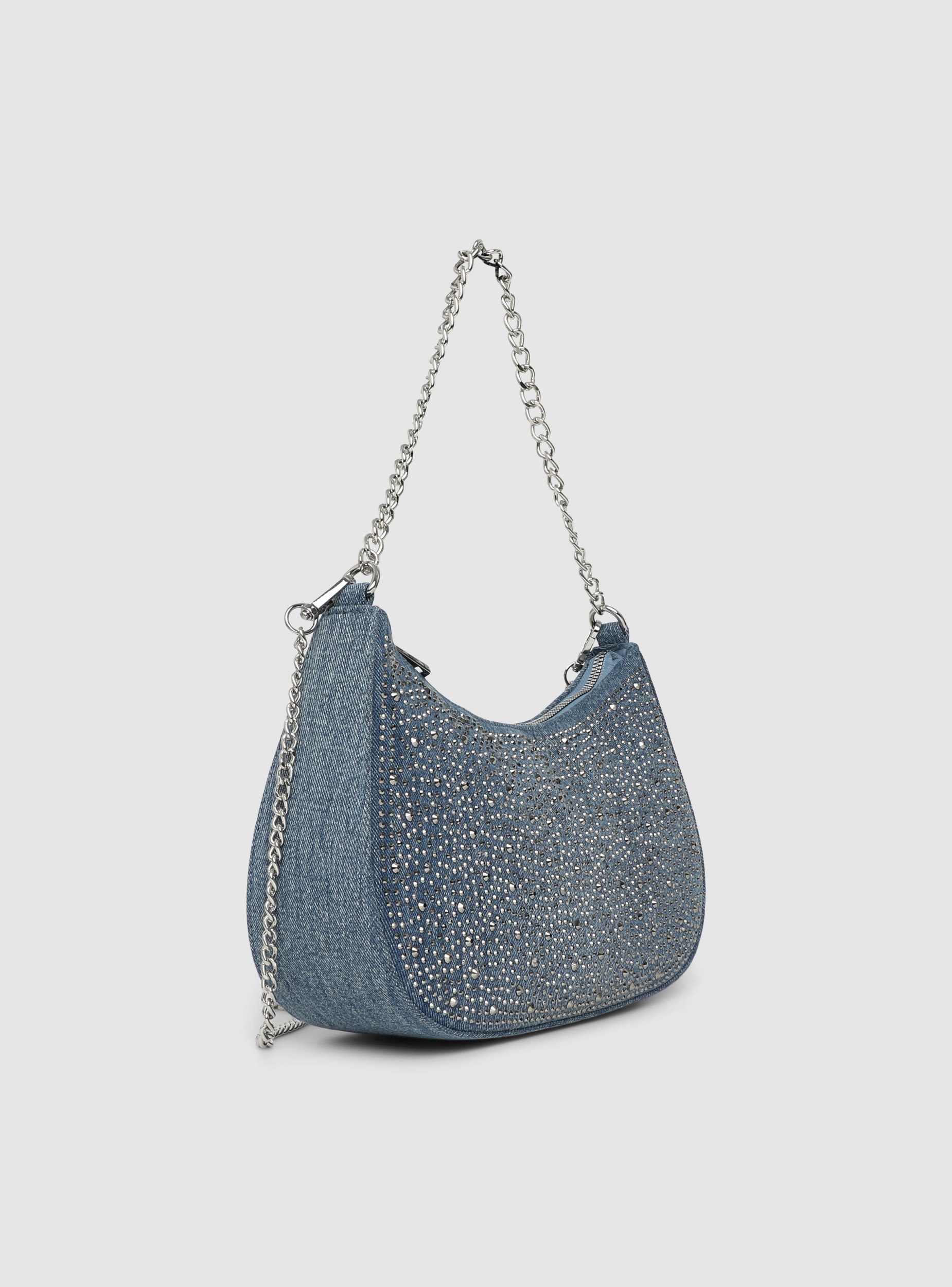 Borsa da donna a mezzaluna in denim, ideale per look casual o trendy da giorno e sera. Design compatto con tracolla a catena metallica removibile e chiusura con zip. Applicazioni di strass frontali che regalano un effetto luccicante. Perfetta con jeans e blazer o abiti midi per aggiungere un tocco brillante all’outfit. Dimensioni lunghezza 28,5 x larghezza 3cm x altezza 15,5cm.Dettagli