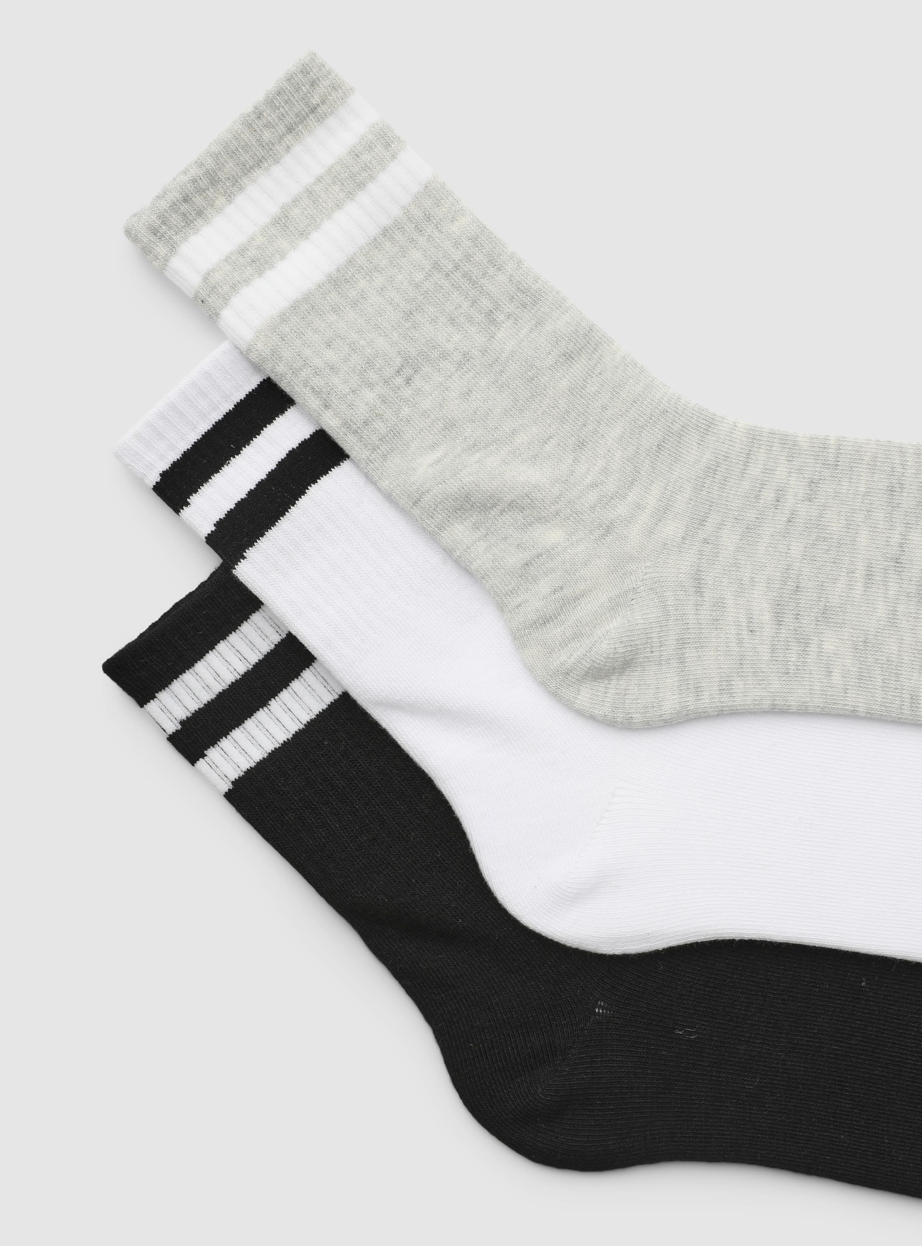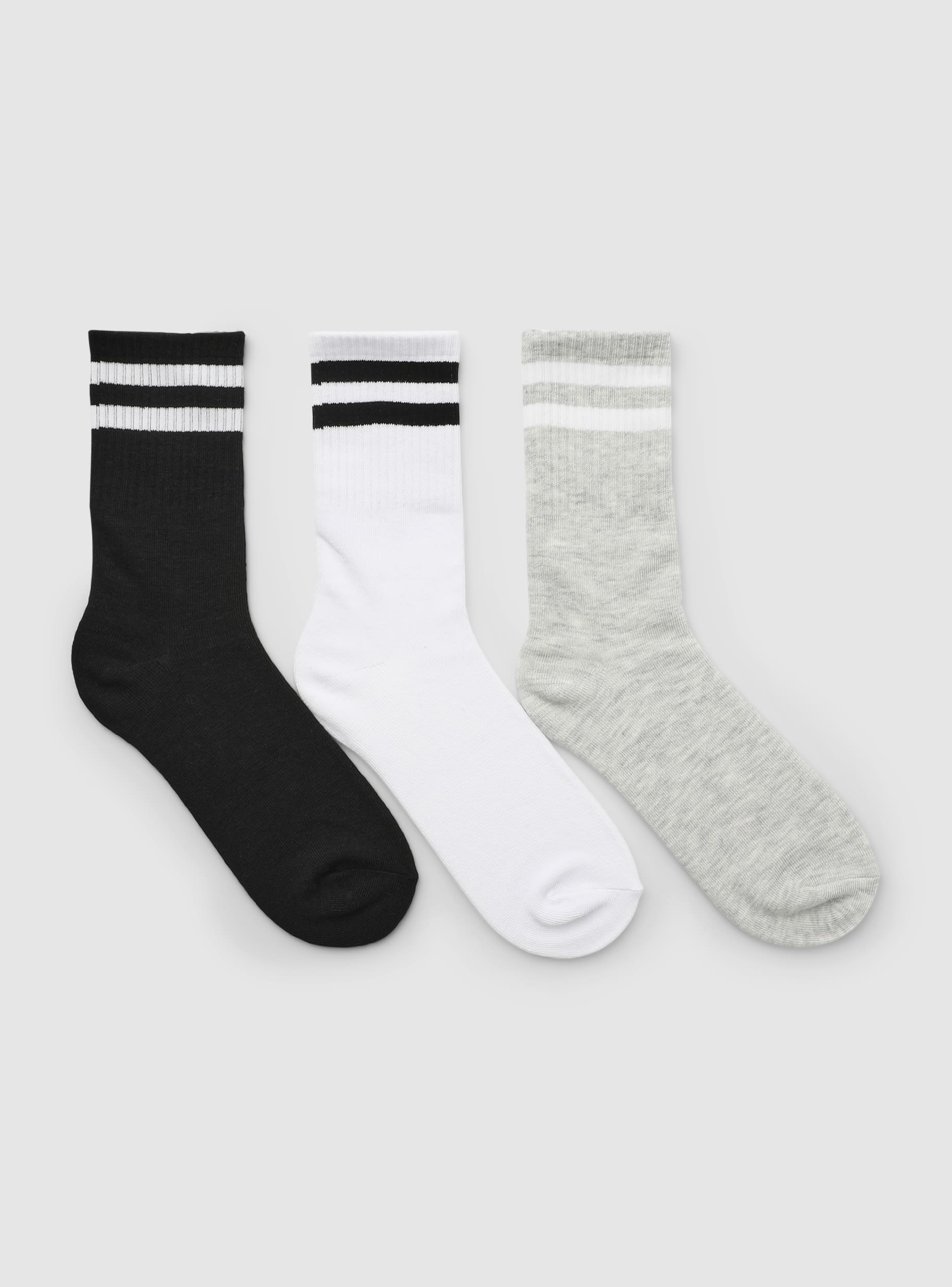 Calze da donna a tinta unita con dettaglio a righe sul bordo, ideali per un look urban e casual. Pack da tre paia perfetto per l’uso quotidiano, dalla palestra al tempo libero. Design medio con polsino a coste elasticizzato. Facili da abbinare a sneaker e outfit streetwear grazie alla fantasia a righe pulita e versatile.Dettagli