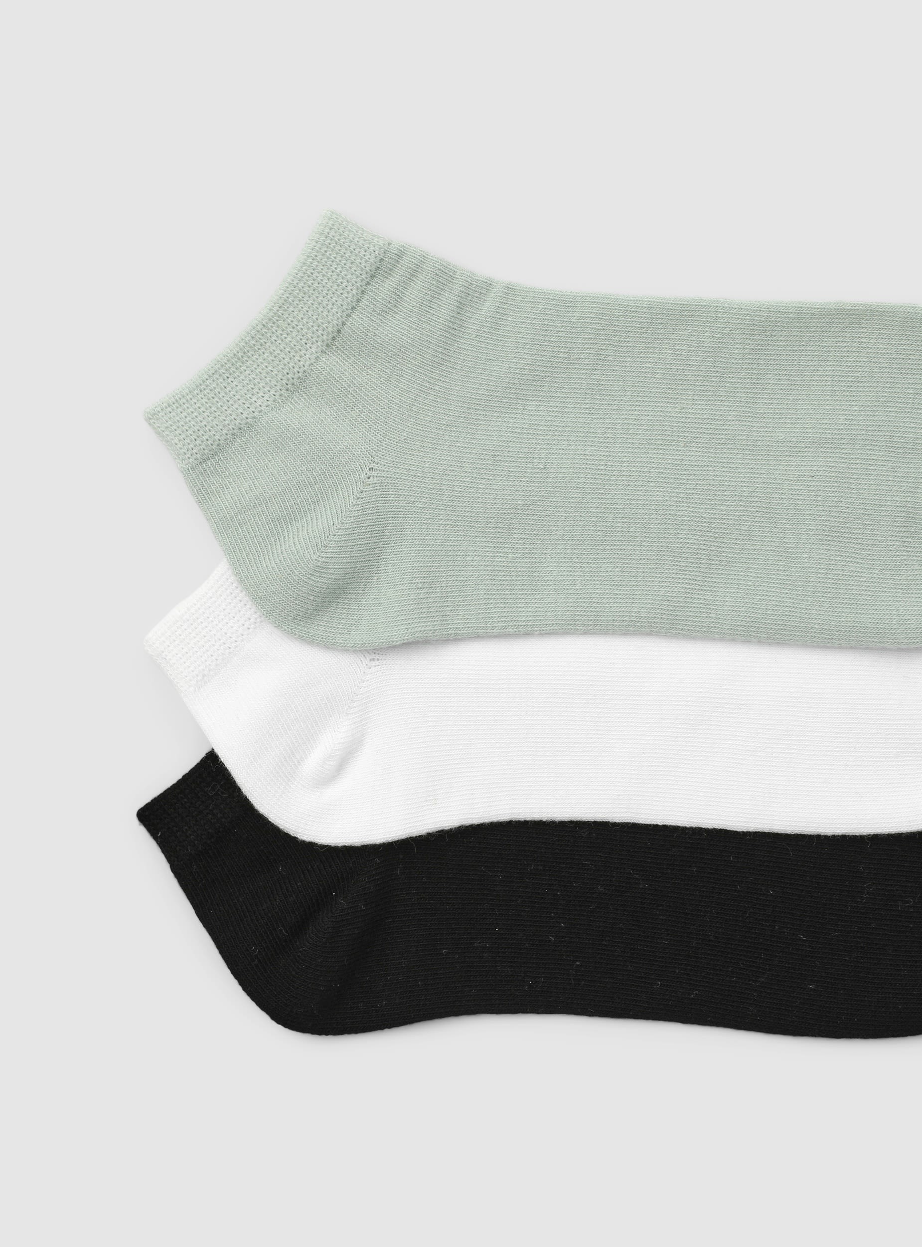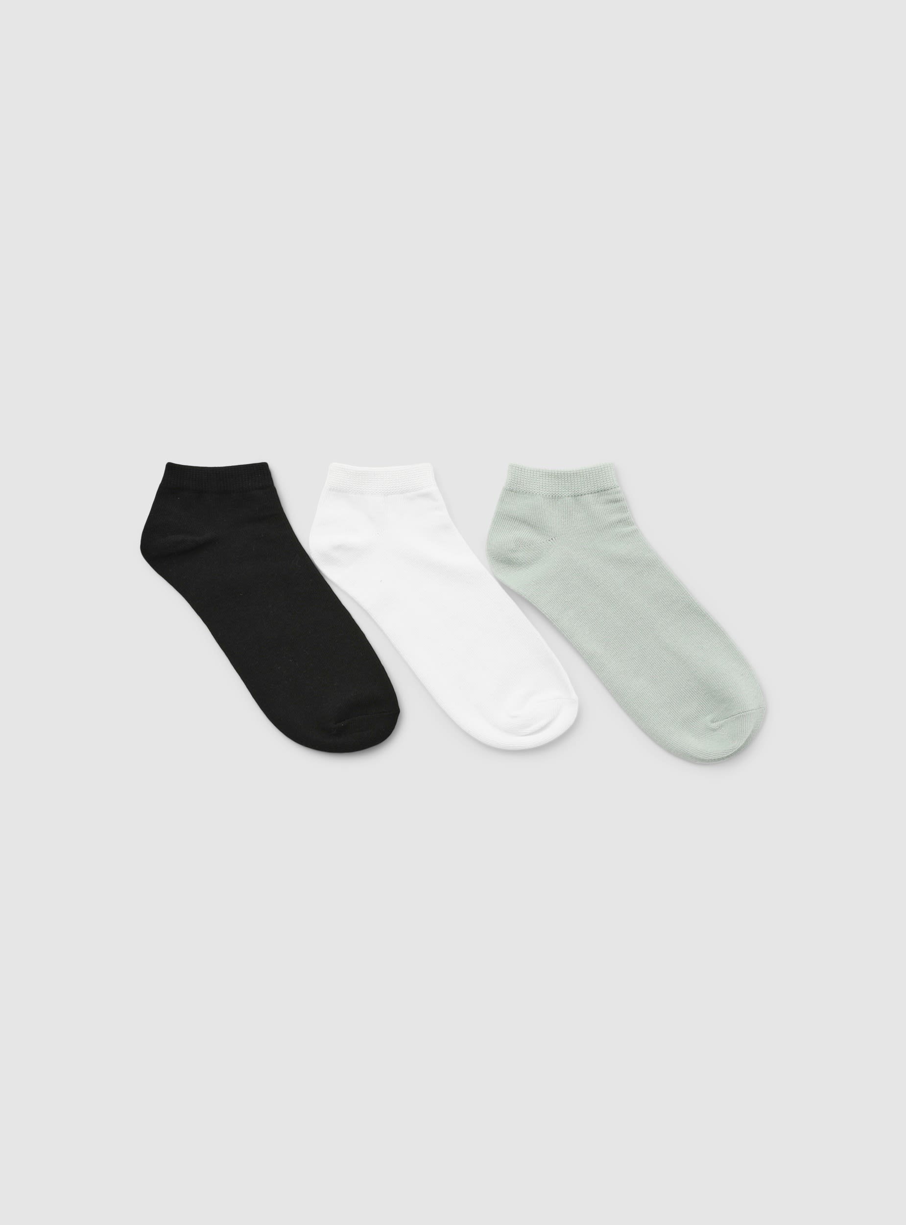 Calze da donna corte tinta unita in confezione da tre paia, ideali per l’uso quotidiano e per sneaker o scarpe sportive. Polsino elasticizzato per una tenuta confortevole. Perfette da abbinare a look casual o sportivi. Design minimal e pulito che si adatta a ogni outfit.Dettagli