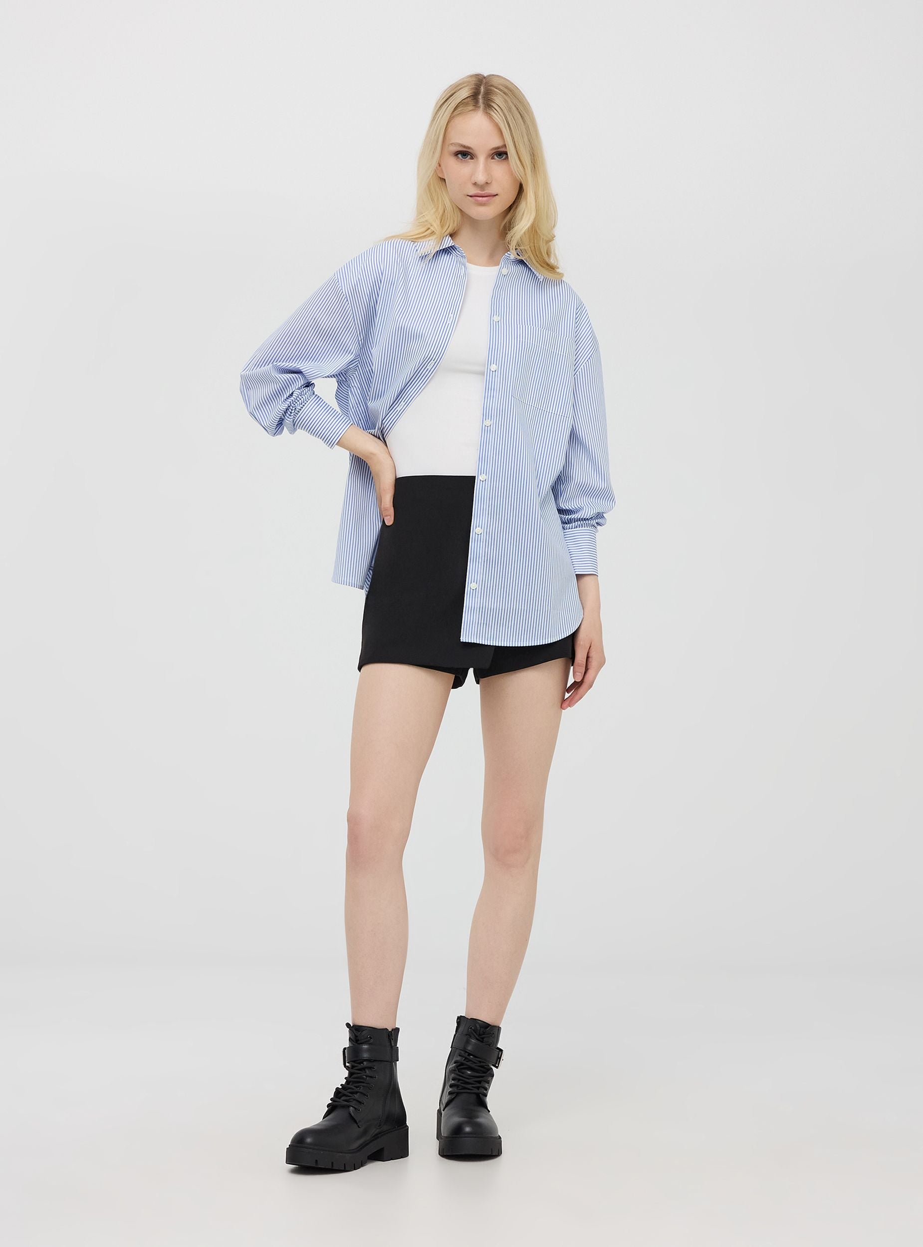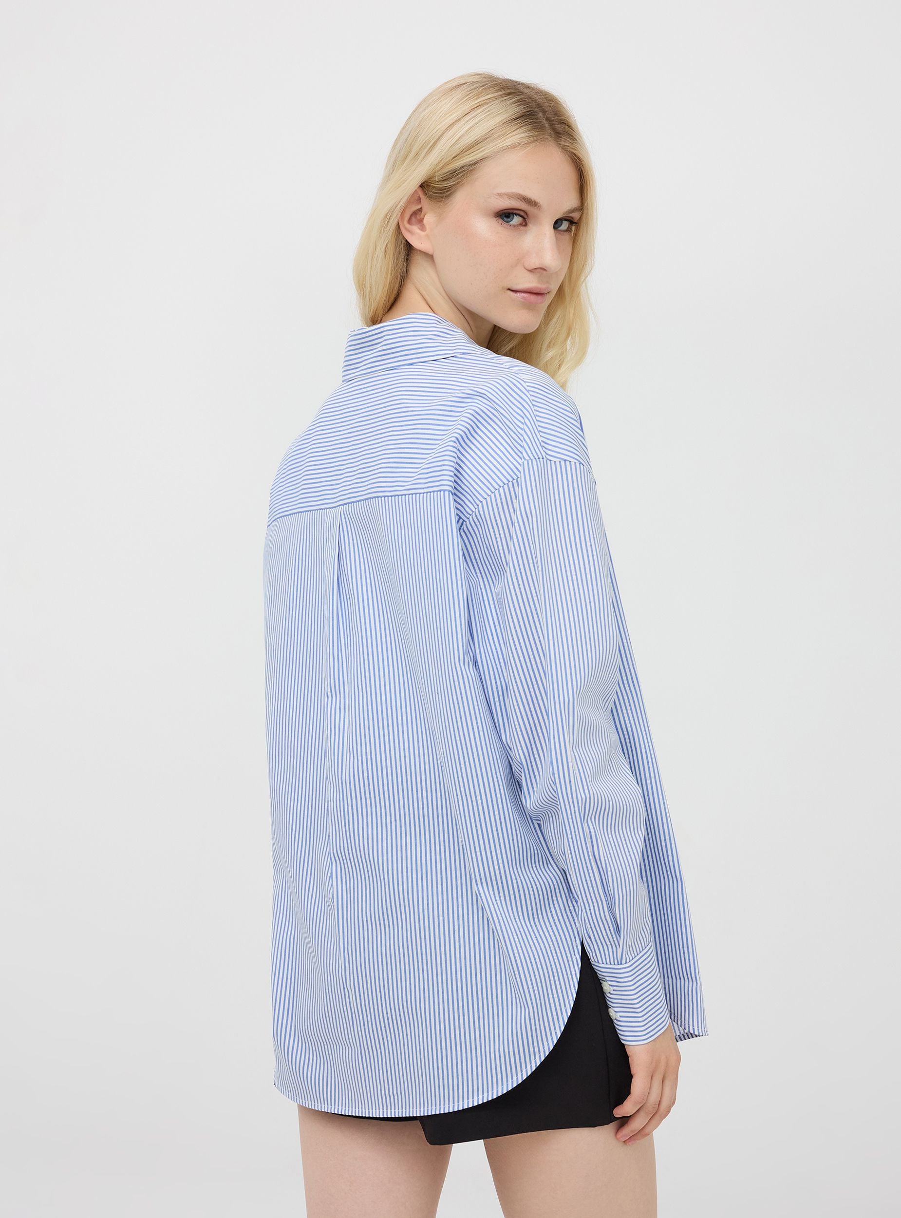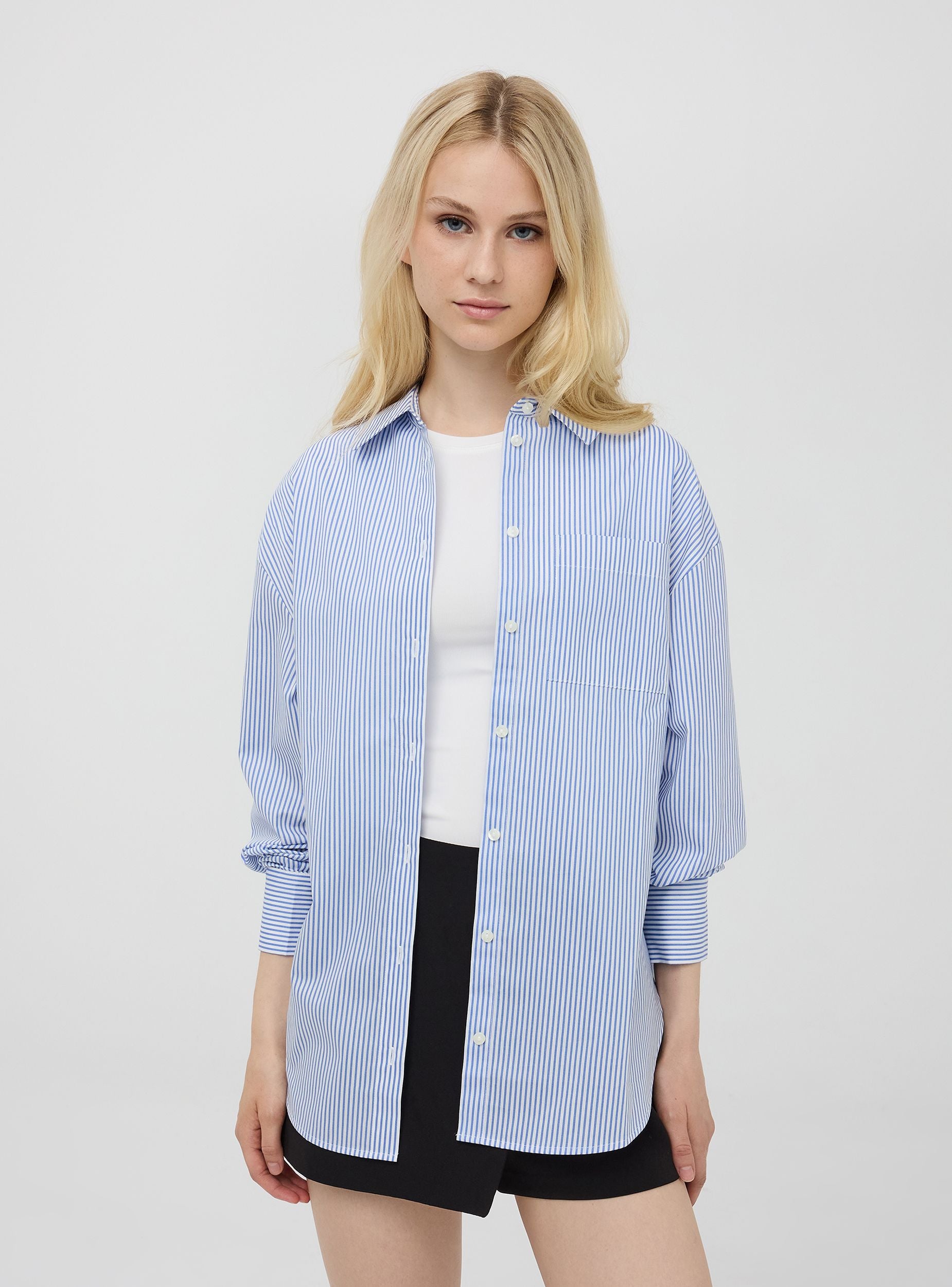 Camicia da donna con taglio ampio e comodo, realizzata in popeline a righe. Presenta un colletto classico, maniche lunghe con polsini e una tasca frontale sul lato sinistro. La chiusura frontale è con bottoni, ideale per un look casual ma curato, perfetto per l'uso quotidiano e per l'ufficio.