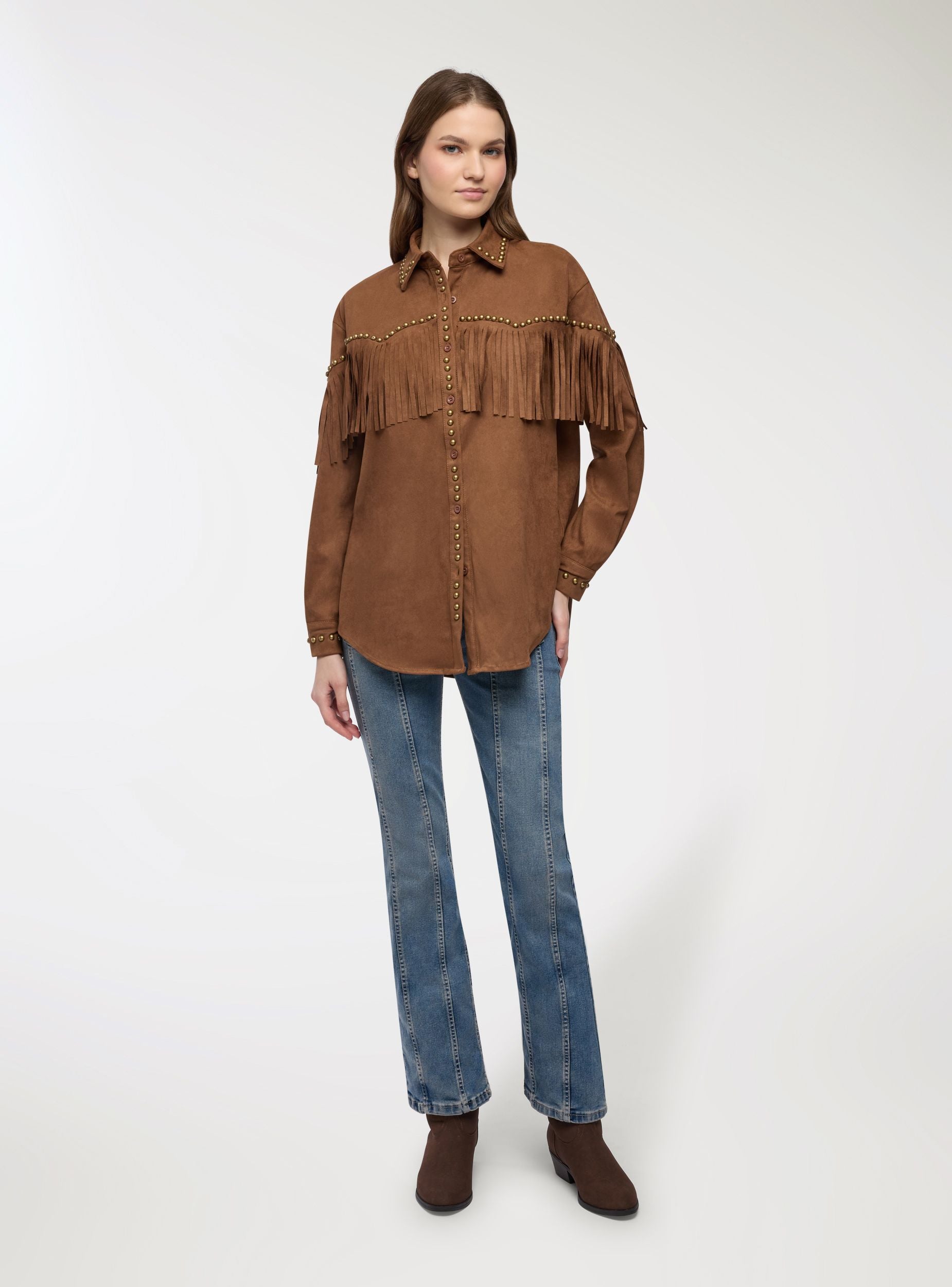 Camicia da donna dal design western, a tinta unita, con frange applicate sul petto e sulle maniche. Colletto a punta, maniche lunghe e chiusura frontale con bottoni, impreziosita da borchie decorative lungo colletto, abbottonatura, carrè e polsini. Vestibilità regular ideale per outfit casual o trendy, perfetta con jeans e stivaletti o sopra una maglietta per stratificazioni dal carattere.Dettagli