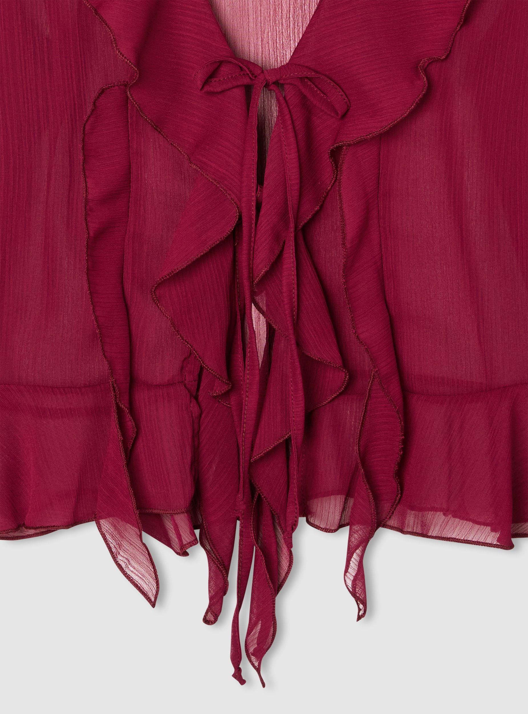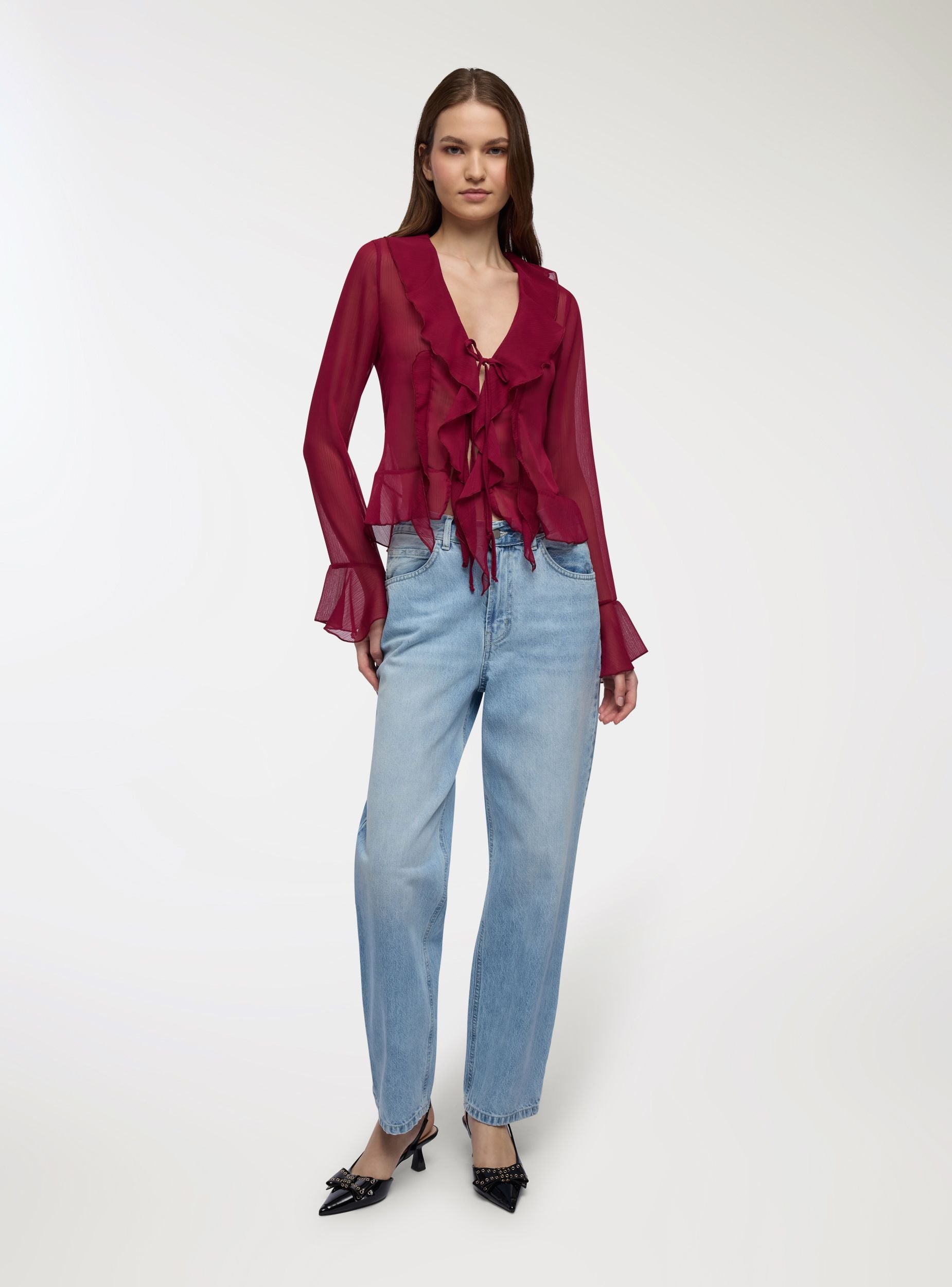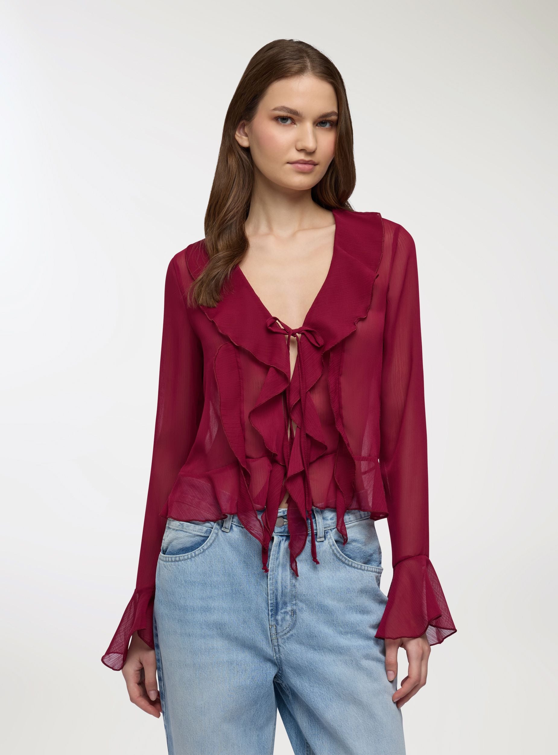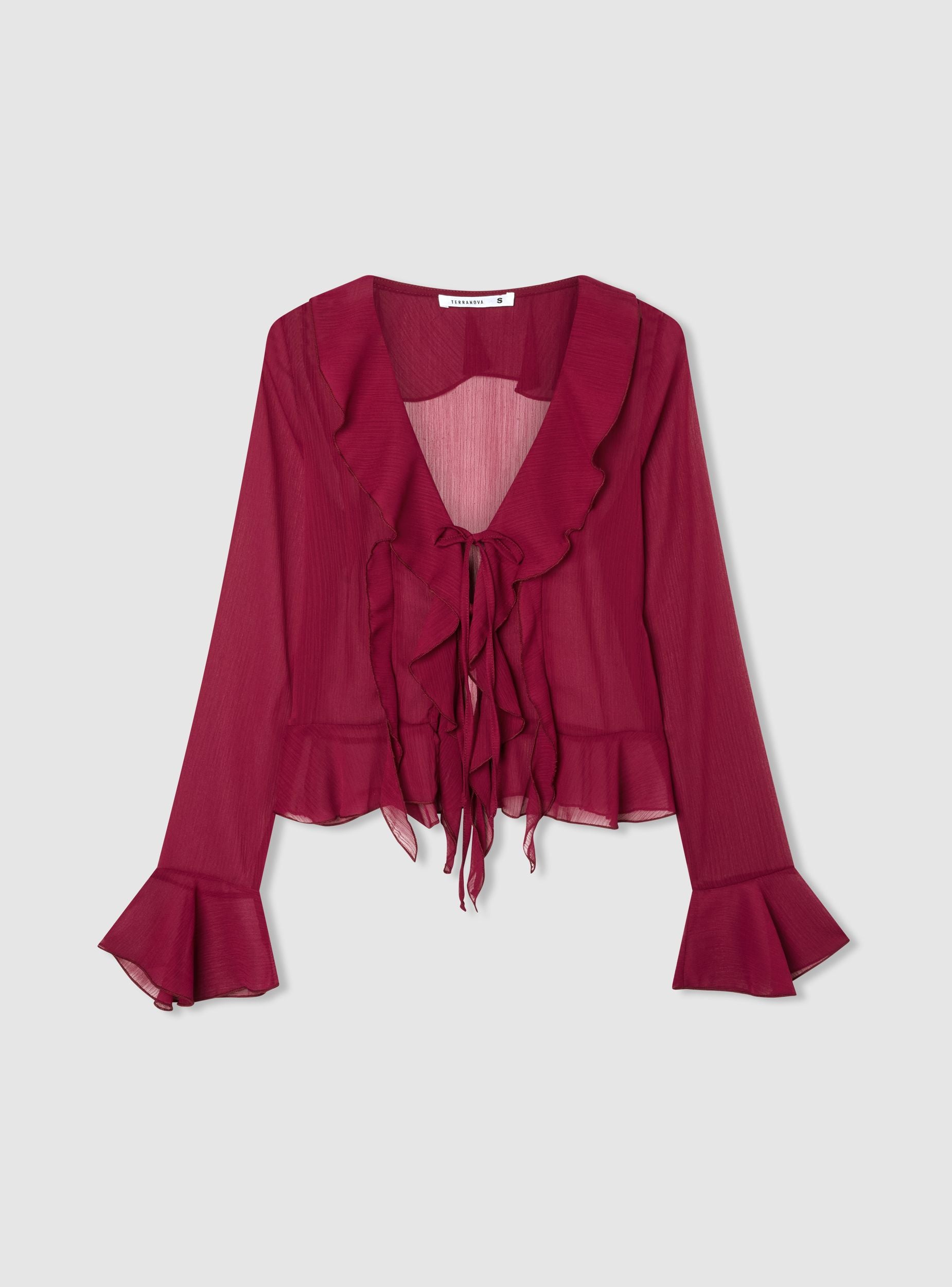 Camicia da donna a tinta unita con rouches lungo lo scollo a V e sul fondo. Maniche lunghe con volant al polso e chiusura frontale con laccetti, ideale per look femminili sia per l’ufficio con pantaloni a sigaretta sia per la sera con una gonna midi. Vestibilità regular e design leggero che aggiunge movimento all’outfit, perfetta da indossare sopra top o reggiseni a vista per un tocco romantico.Dettagli