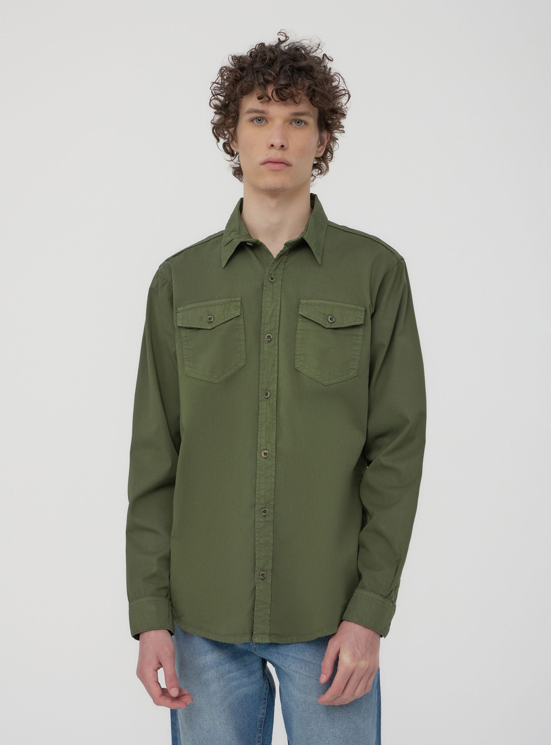 Camicia da uomo a tinta unita con maniche lunghe, colletto classico e chiusura con bottoni. Dotata di due tasche frontali con patta e bottone, aggiunge un tocco di praticità e stile. Perfetta per un look casual o urban, ideale per il lavoro, il tempo libero o le uscite serali. Si abbina facilmente a jeans, pantaloni cargo o chino, garantendo un outfit versatile e curato in ogni stagione.Dettagli