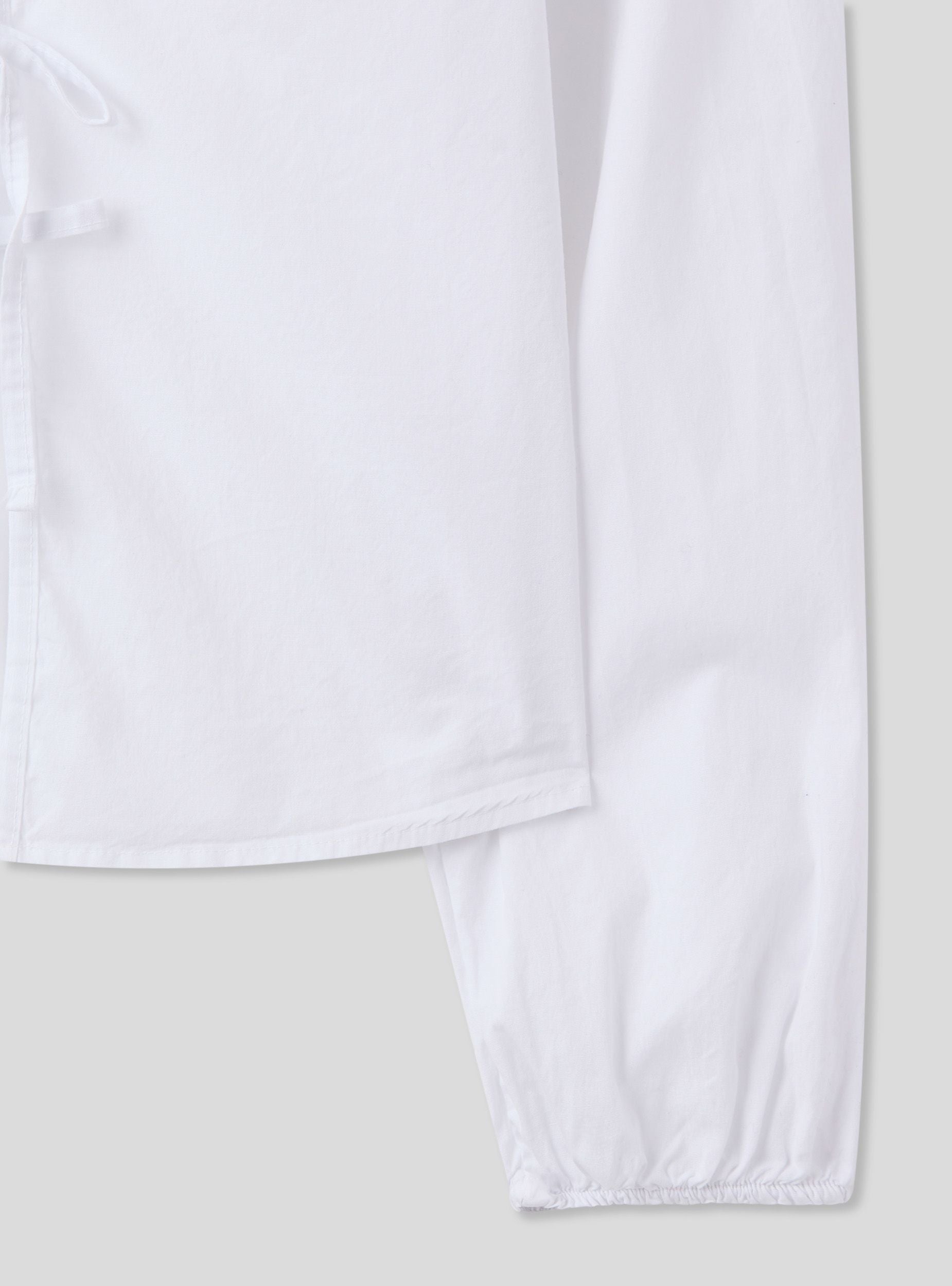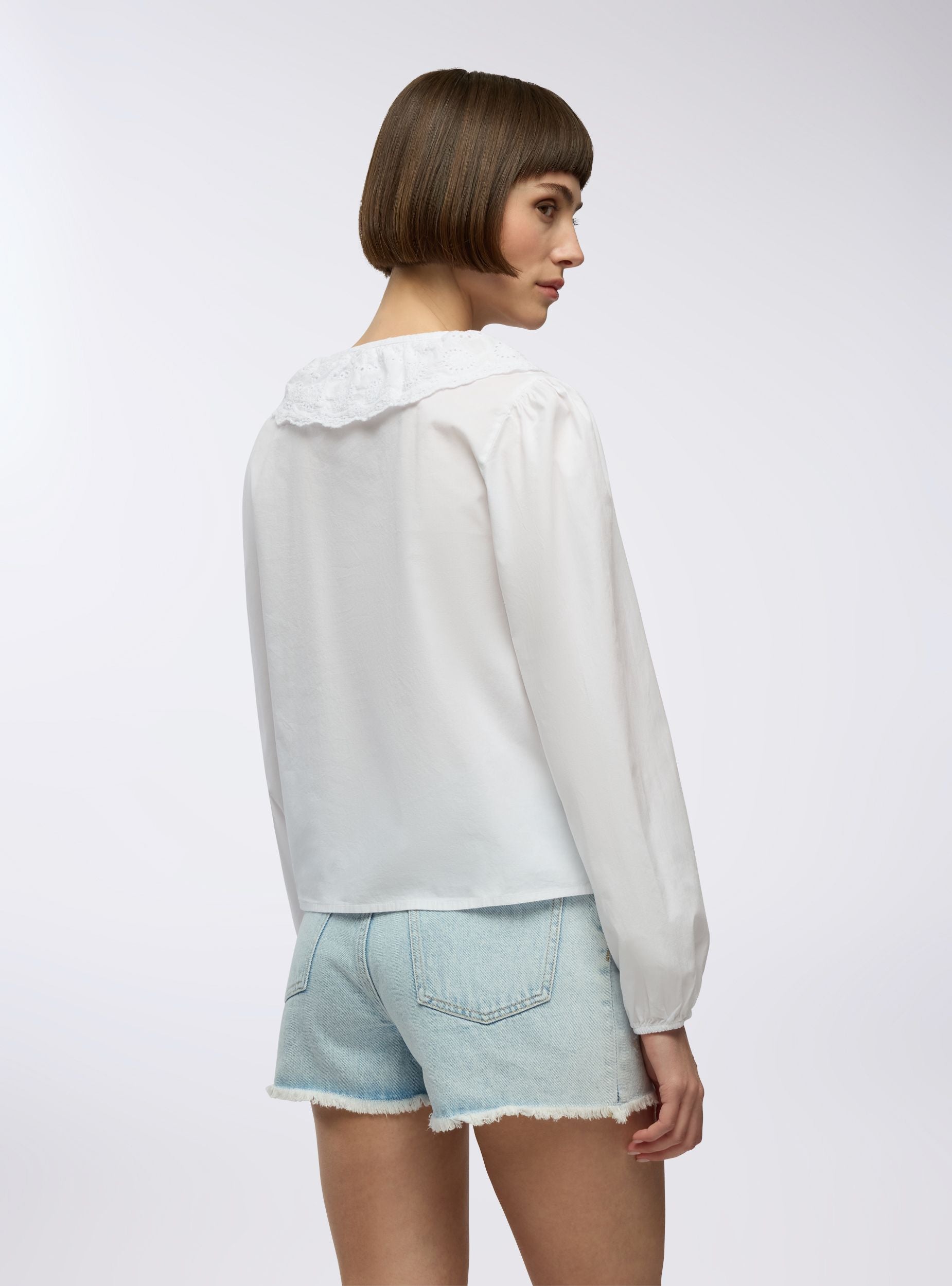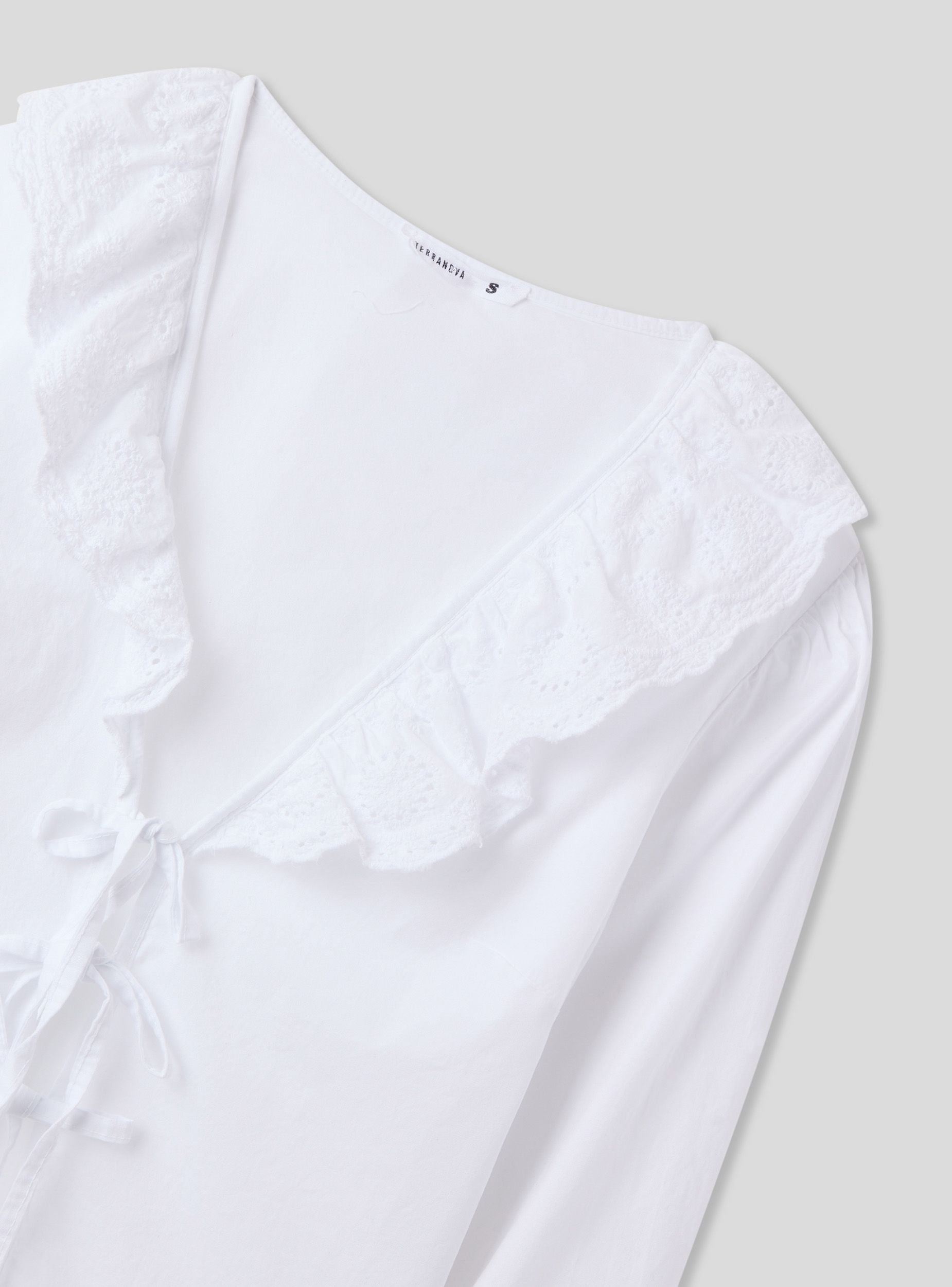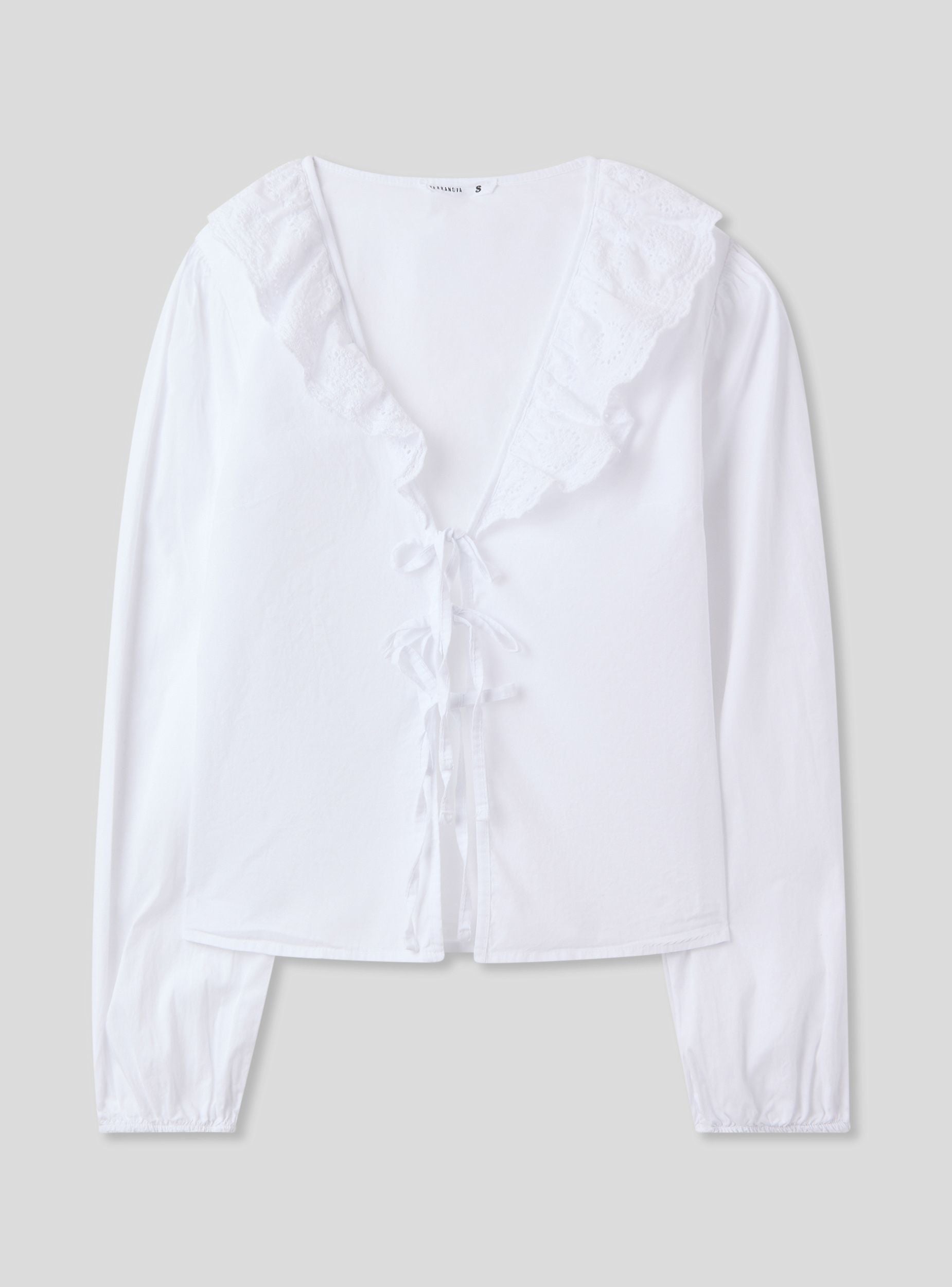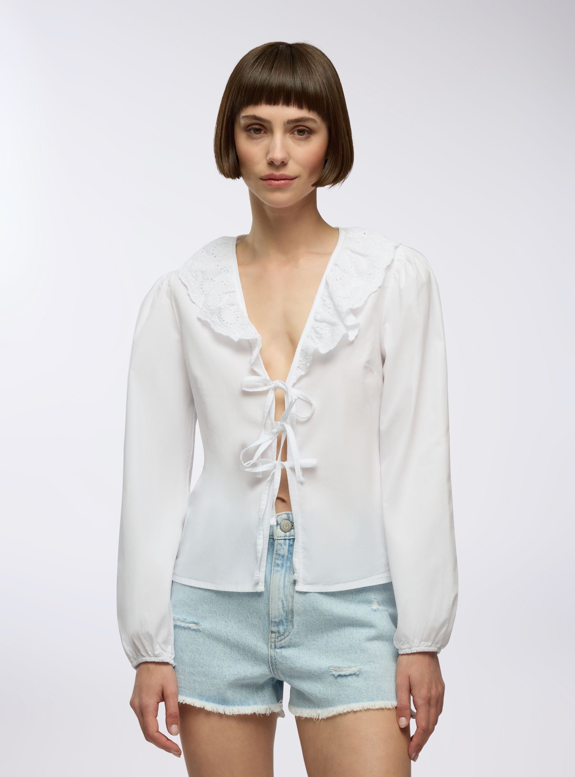 Camicia da donna con maniche lunghe, ideale per un look casual o elegante. Perfetta per essere abbinata a pantaloni o gonne, si distingue per il suo design raffinato e dettagli ricercati. Arricchita da volant in sangallo sullo scollo a v e chiusura con nastri annodabili a fiocco. Adatta a diverse occasioni, dal lavoro al tempo libero, offre comfort e stile in ogni momento.Dettagli
