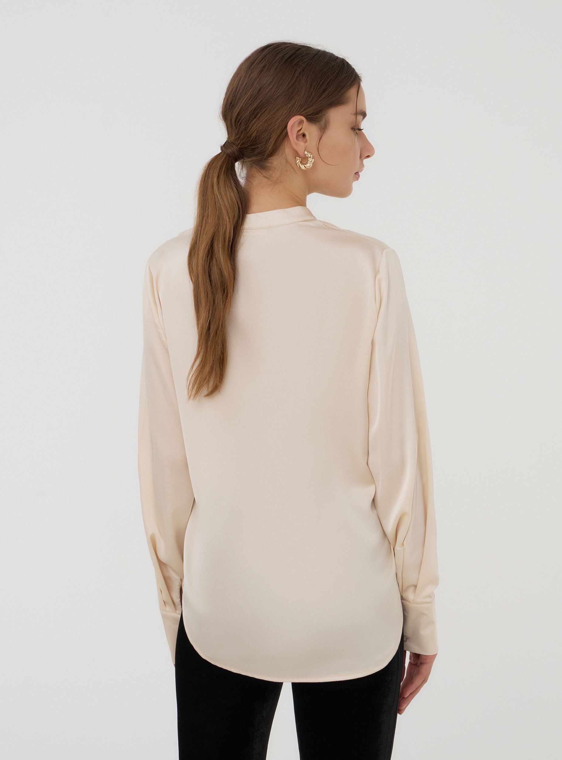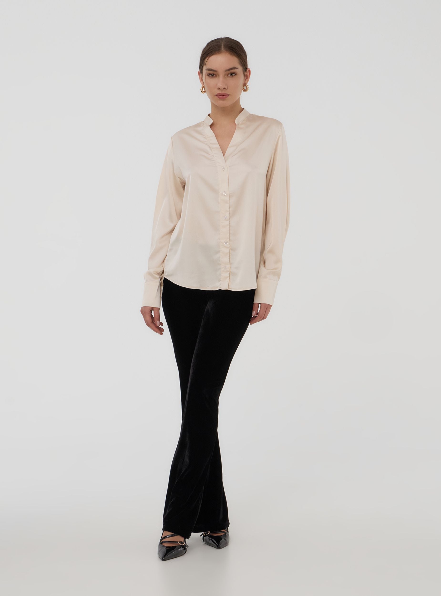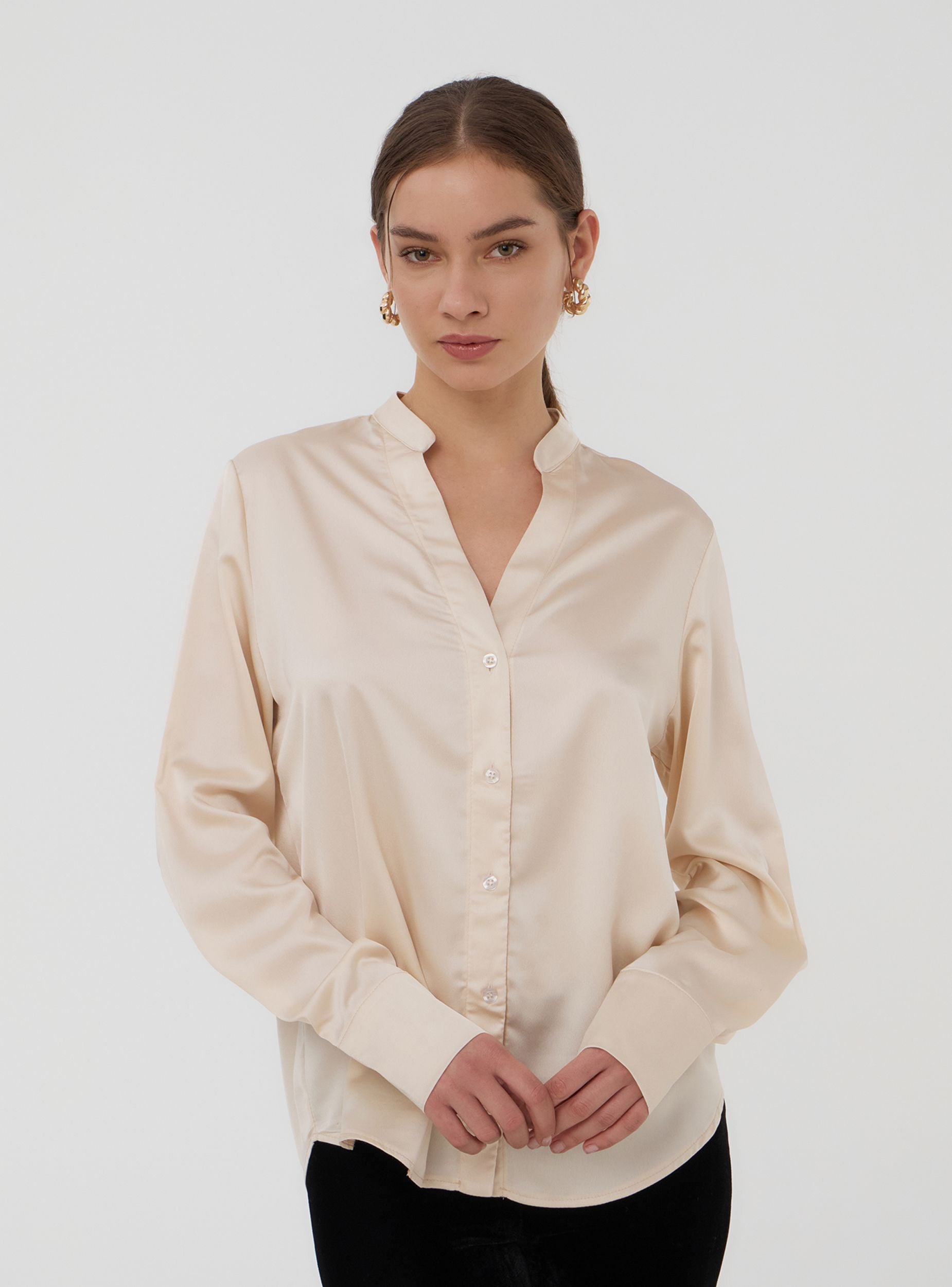 Camicia da donna a tinta unita con maniche lunghe e colletto alla coreana, caratterizzata da un design essenziale e raffinato. Perfetta per un look casual ma elegante, si adatta bene sia a contesti informali che a occasioni più formali, come giornate in ufficio o cene fuori. La sua versatilità la rende ideale per essere abbinata a diversi capi, garantendo uno stile equilibrato e curato.Dettagli