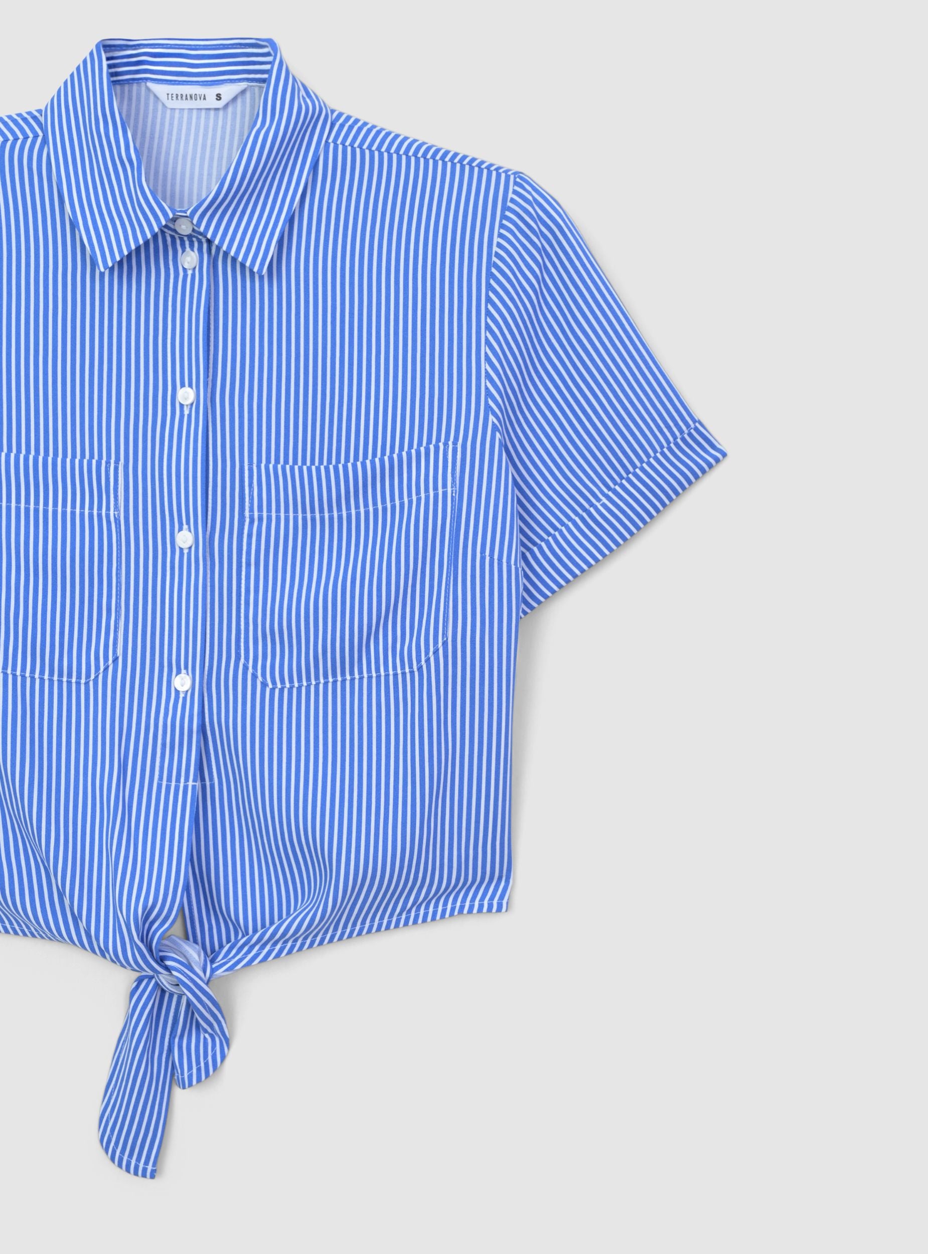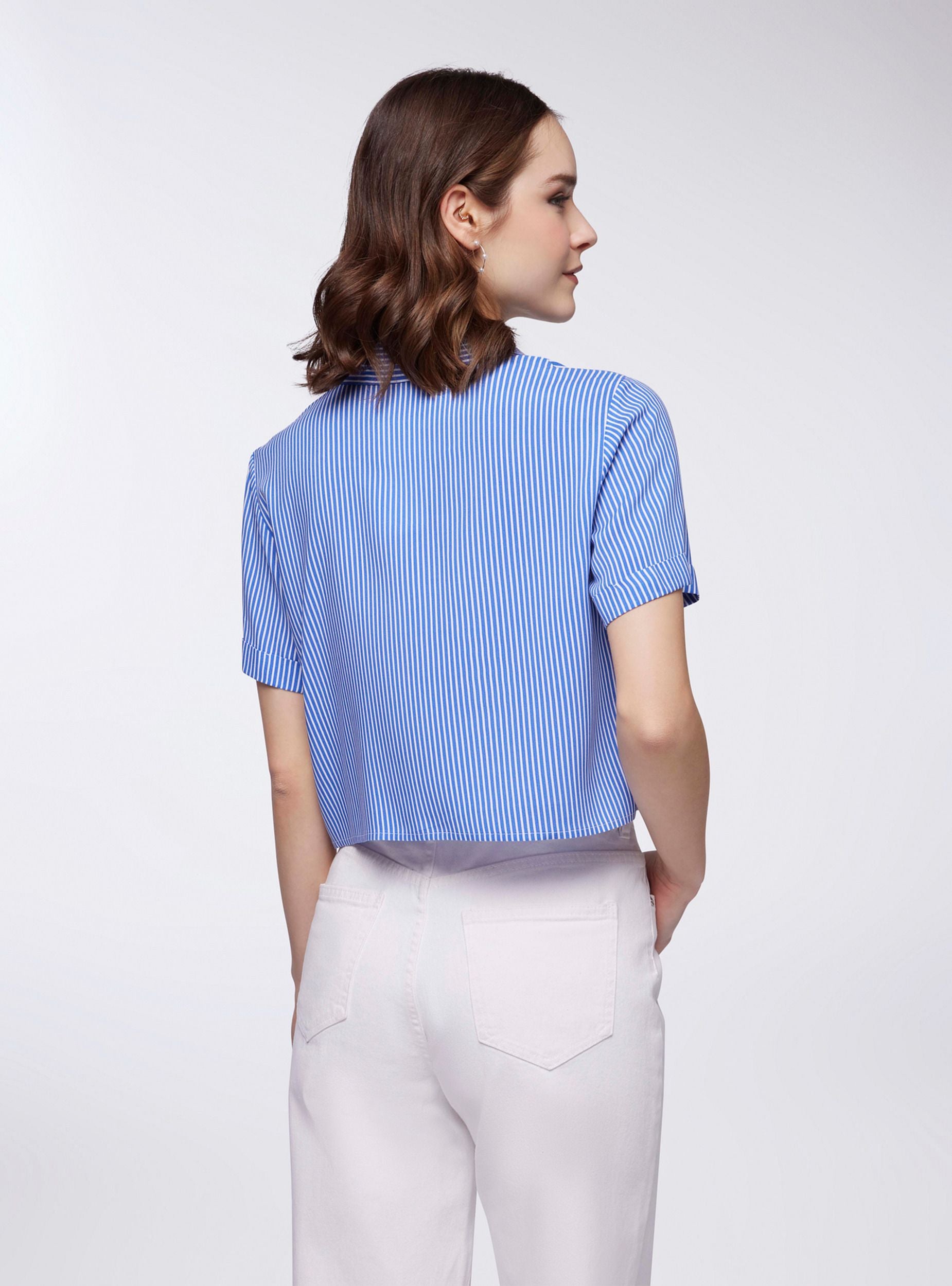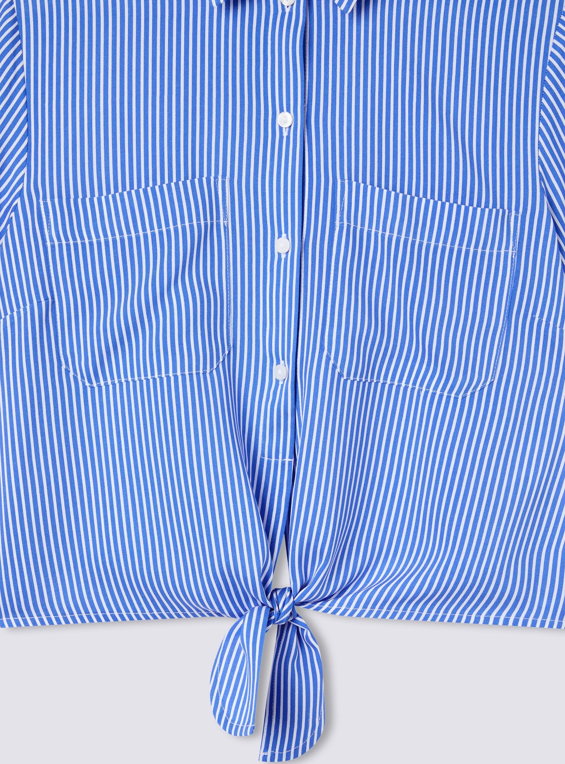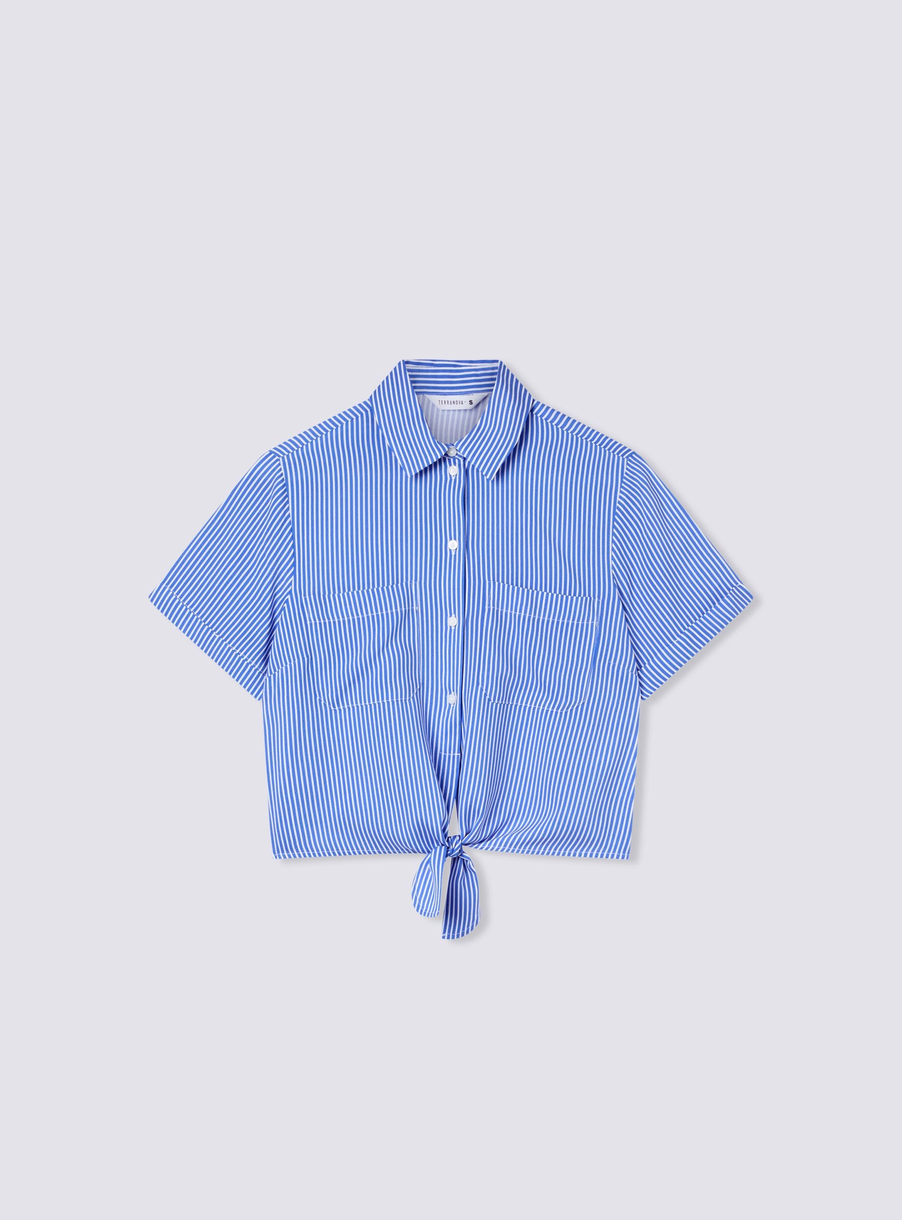 Camicia da donna a righe dal taglio crop, perfetta per un look fresco e dinamico. Il modello presenta un colletto strutturato e una chiusura frontale con bottoni, che aggiunge un tocco raffinato. Le maniche corte offrono comfort e libertà di movimento, mentre il nodo sul fondo dona un dettaglio originale. Completano il design due tasche applicate sul petto, che uniscono funzionalità e stile per un outfit versatile e moderno.Dettagli
